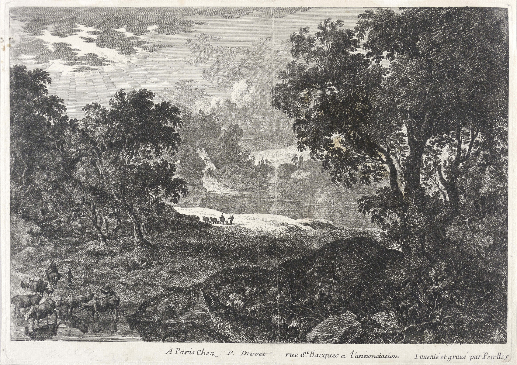 In der Platte rechts unten signiert: ″Inventé et gravé par Perelle.″ Unterhalb der Darstellung Verlegeradresse: ″Pierre Drevet, Paris″. Verso Sammlungsstempel. – Blatt bis knapp an den Plattenrand beschnitten, verso mit Montageresten und einem. Leichte vertikale Faltspur. In der rechten Blatthälfte leicht fleckig. Sonst guter Zustand.