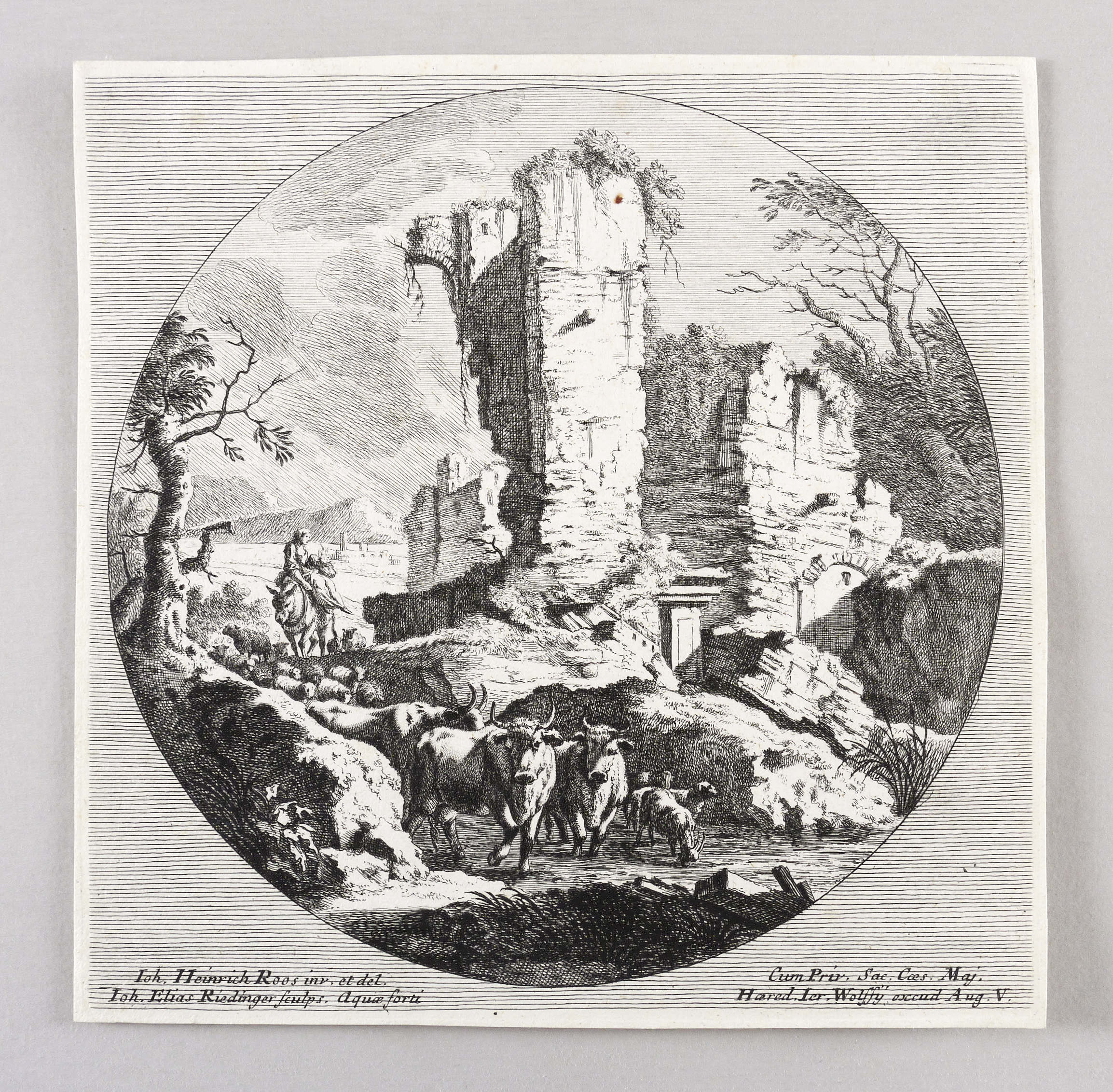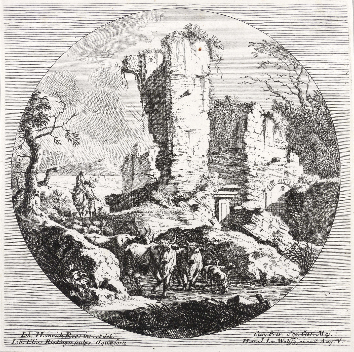 Ridinger, Johann Elias. – „Hirtin mit Rindern und Schafen bei einer Ruine”.