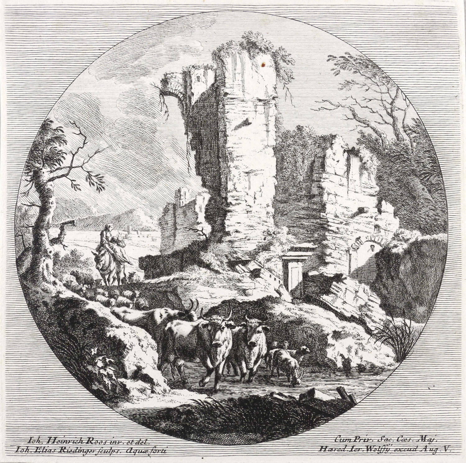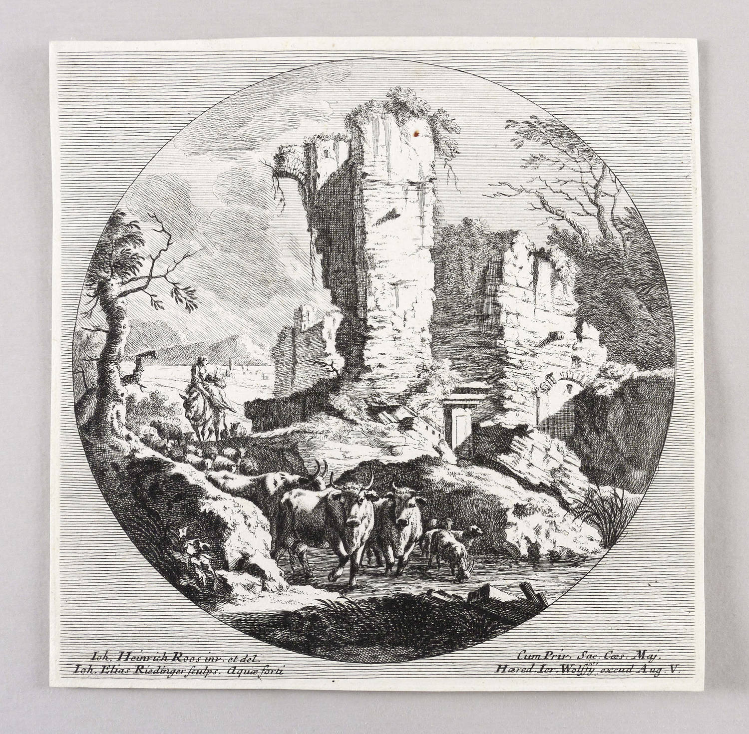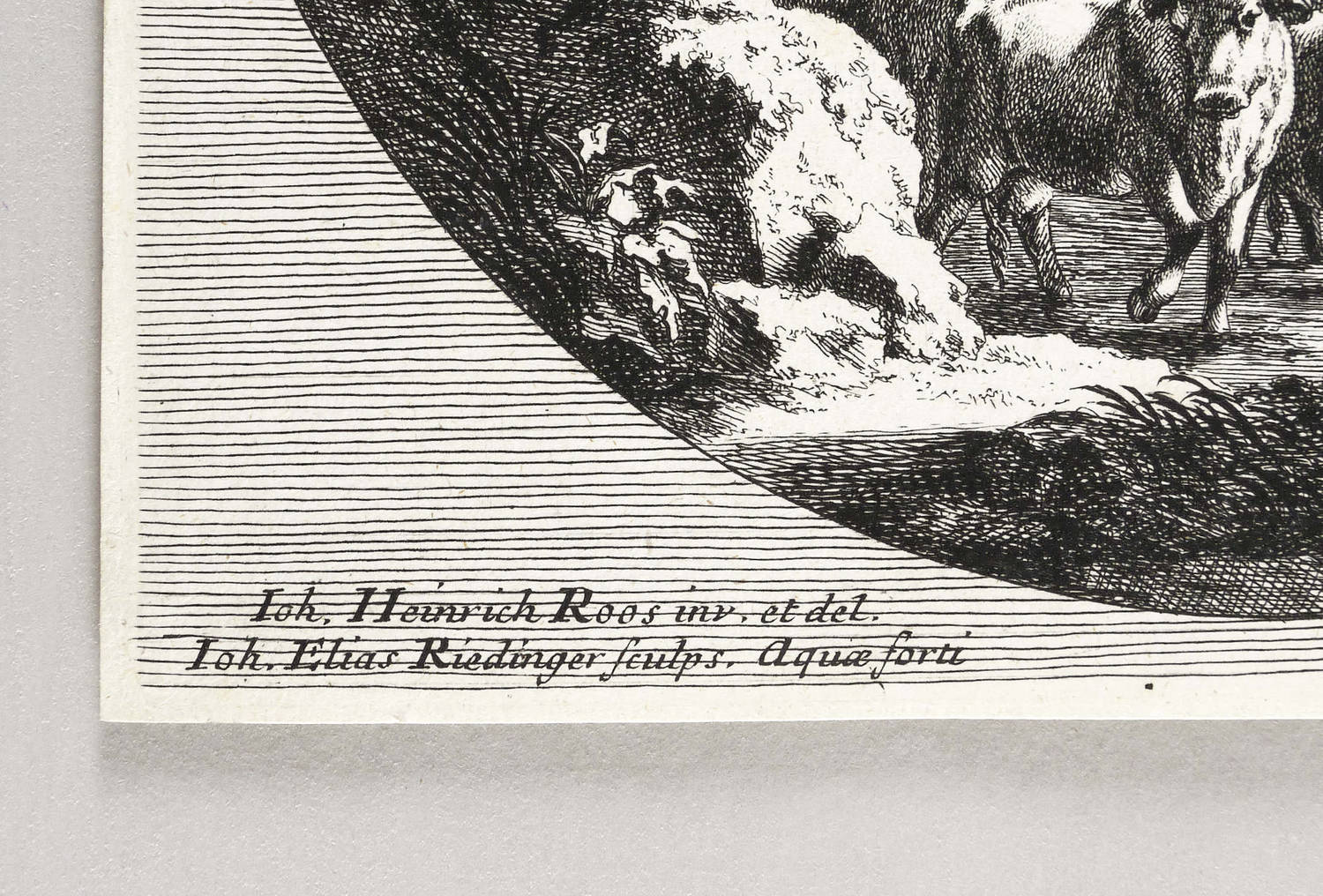 Thienemann 795. – Links unten Signiert: ″Ioh. Heinrich Roos inv. et del. Ioh. Elias Ridinger sculps. aqua forti″. Rechts unten Verlegeradresse. – Nach Thienemann aus der ersten Folge von vier Blatt nach Viehstücken von Roos. – Schmalrandiges Blatt verso mit Montageresten. Sonst aber guter Zustand.