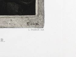 Rechts unten in der Darstellung und darunter signiert und datiert: ″L. Friedrich rad.″ Unterhalb der Darstellung Druckeradresse und Titel. – Untere linke Ecke geknickt und im rechten Rand schwach stockfleckig. Sonst guter Zustand.