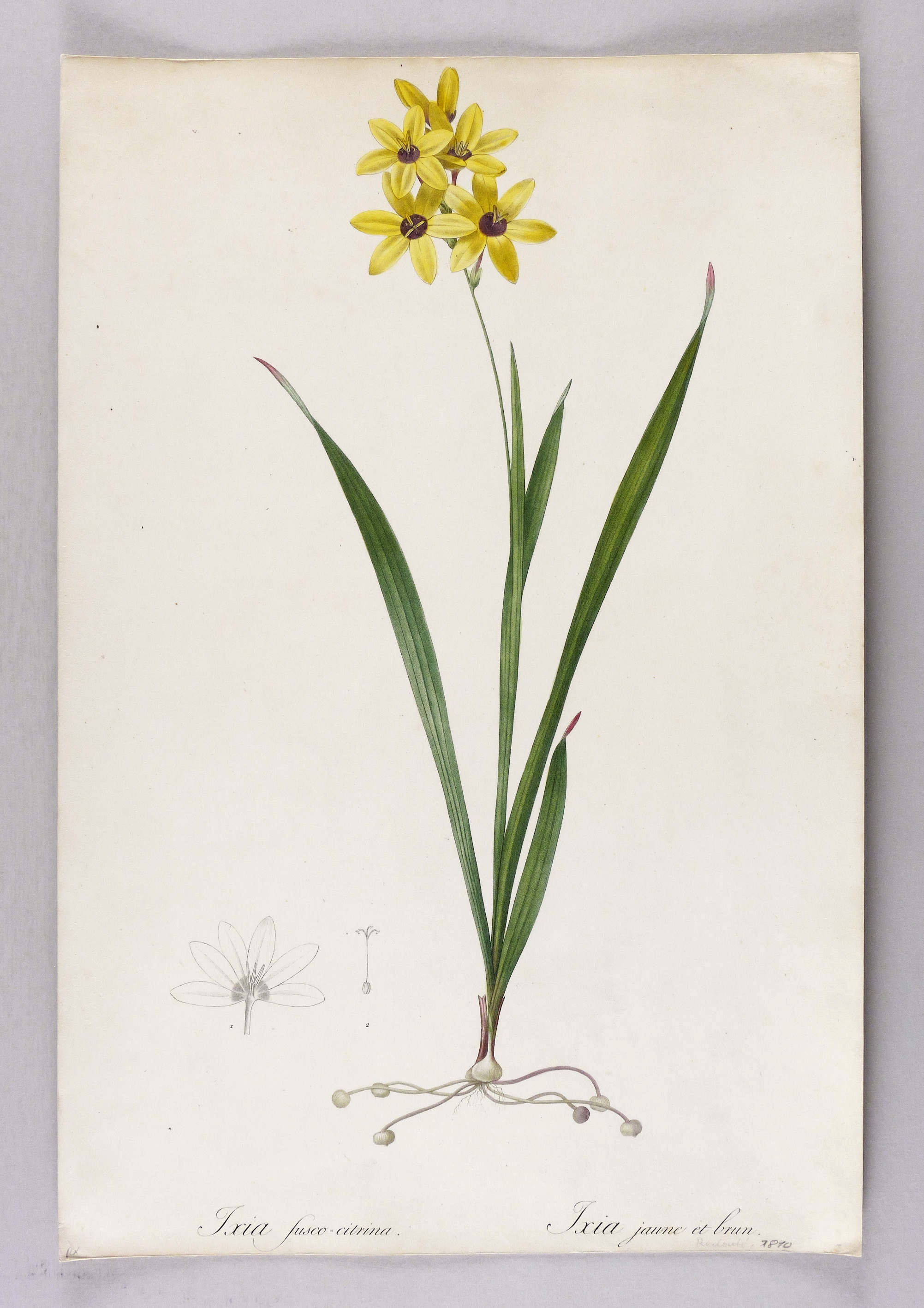 Schwertliliengewächse. – Ixia maculata var. fuscocitrina. – nach Redouté. – „Ixia fusco-citrina. Ixia jaune et brun”.