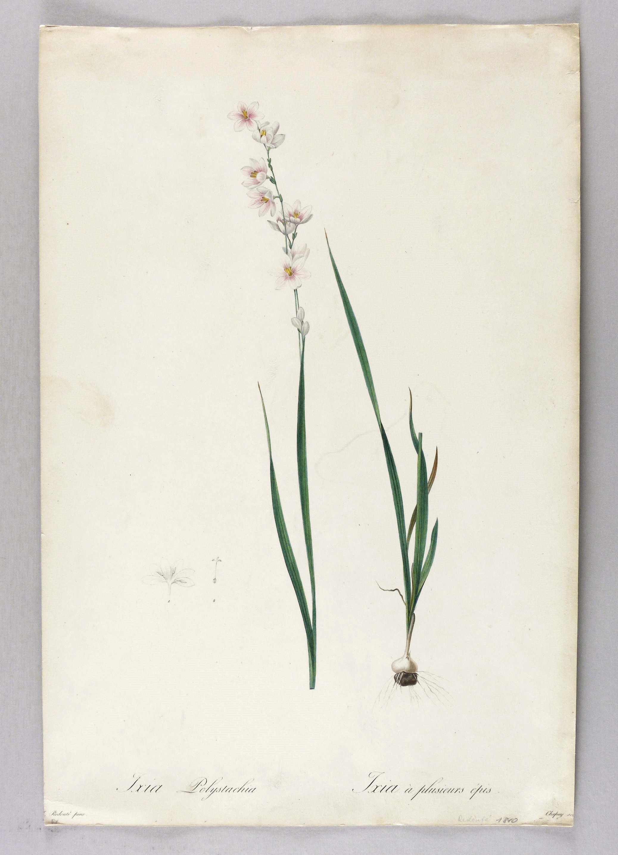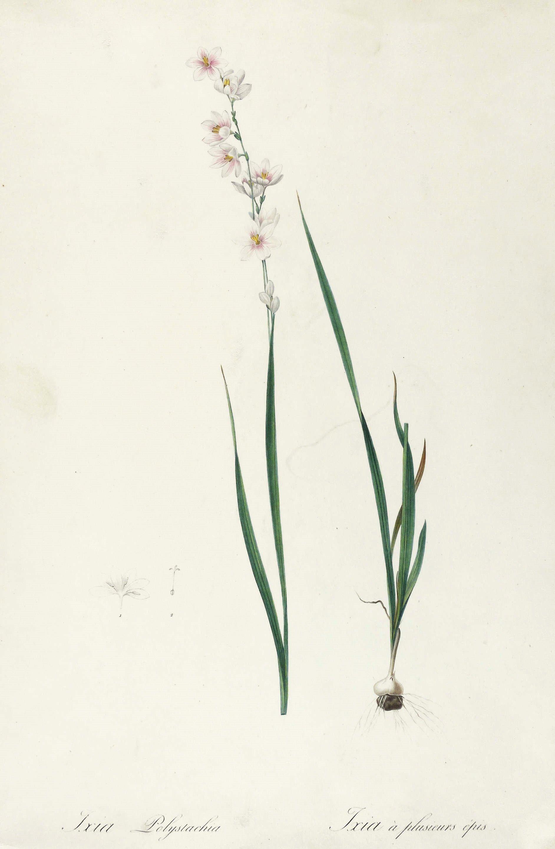 Schwertliliengewächse. – Ixia polystachya. – nach Redouté. – „Ixia polystachia. Ixia à plusieurs épis”.