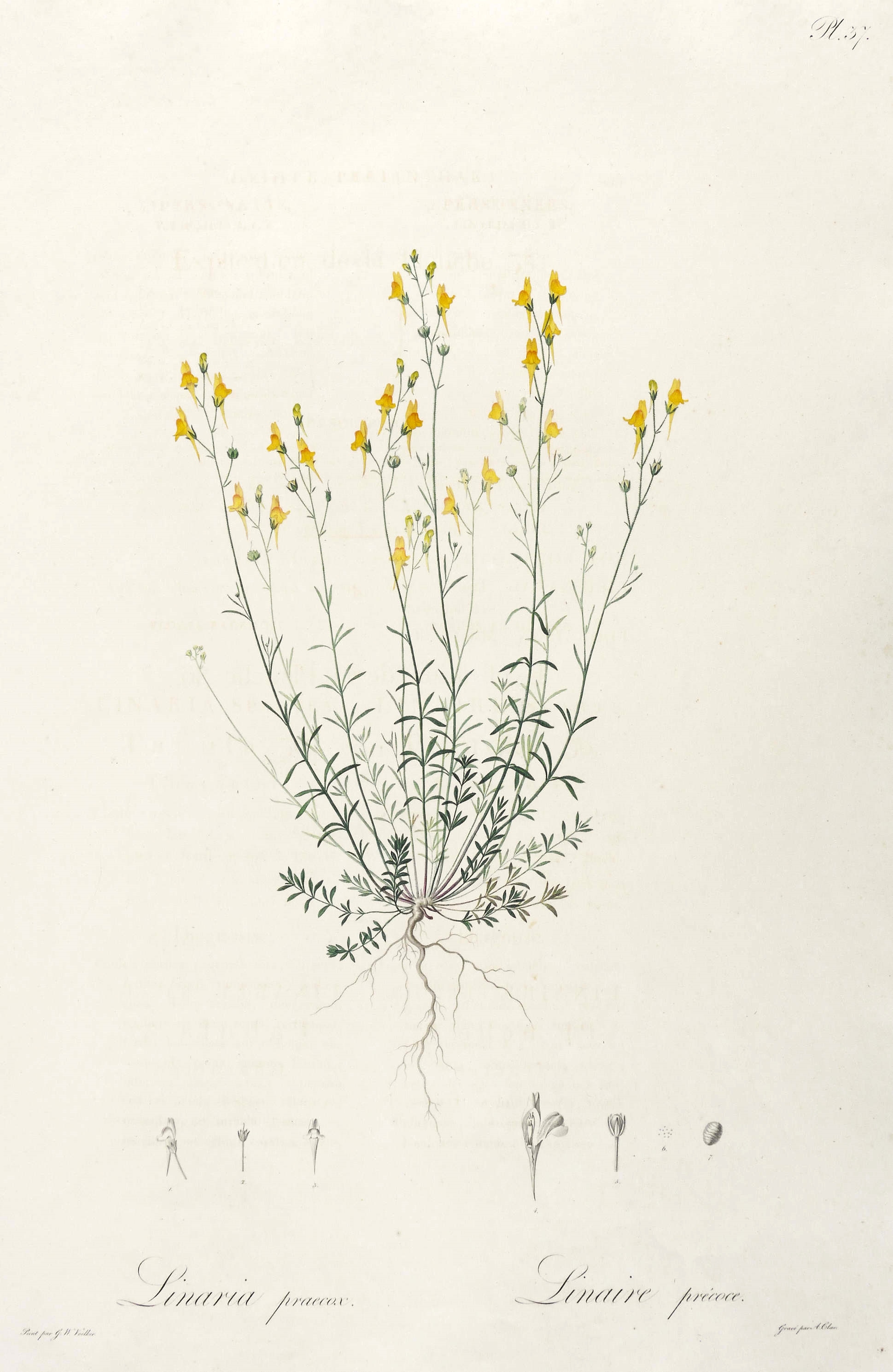 Aus: Johann Centurius von Hoffmannsegg, Flore Portugaise. Ou Description De Toutes Les Plantes Qui Croissent Naturellement En Portugal (Berlin: Carl Friedrich Amelang 1809-20). – Rechts unten signiert: ″Gravé par A. Clar.″ Unterhalb der Darstellung zweisprachig bezeichnet. Oben rechts nummeriert: ″Pl. 37.″ – Synonym: Linaria praecox. – Guter Zustand.