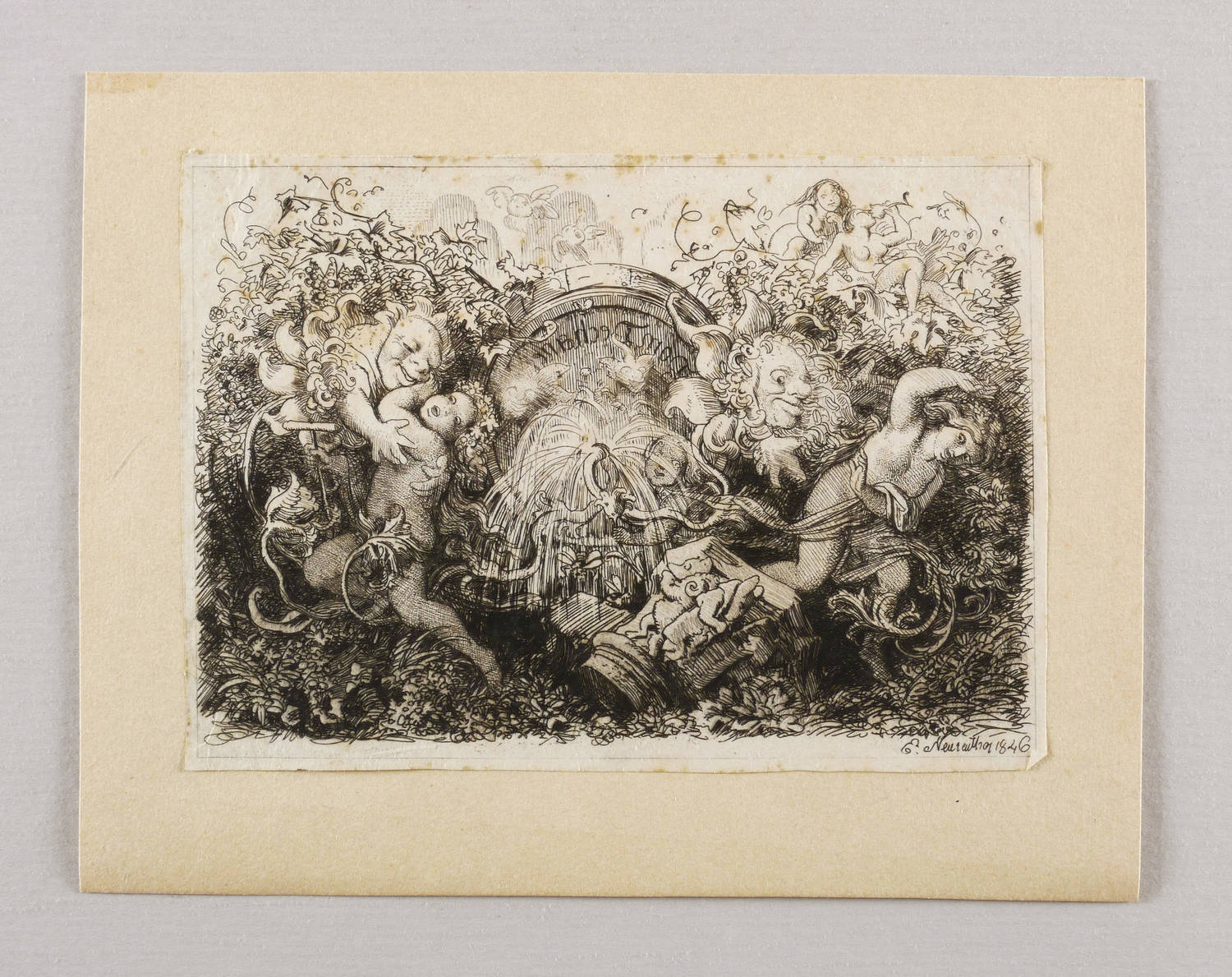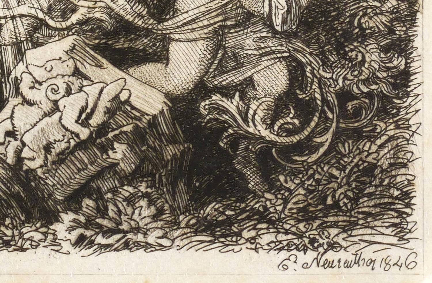 Im Rand des Fasses spiegelschriftliche Inschrift: ″Dom Dechant″. Rechts unten signiert und datiert: ″E. Neureuther 1846″. – Blatt vereinzelt leicht stockfleckig und auf Trägerkarton montiert. Sonst guter Zustand.