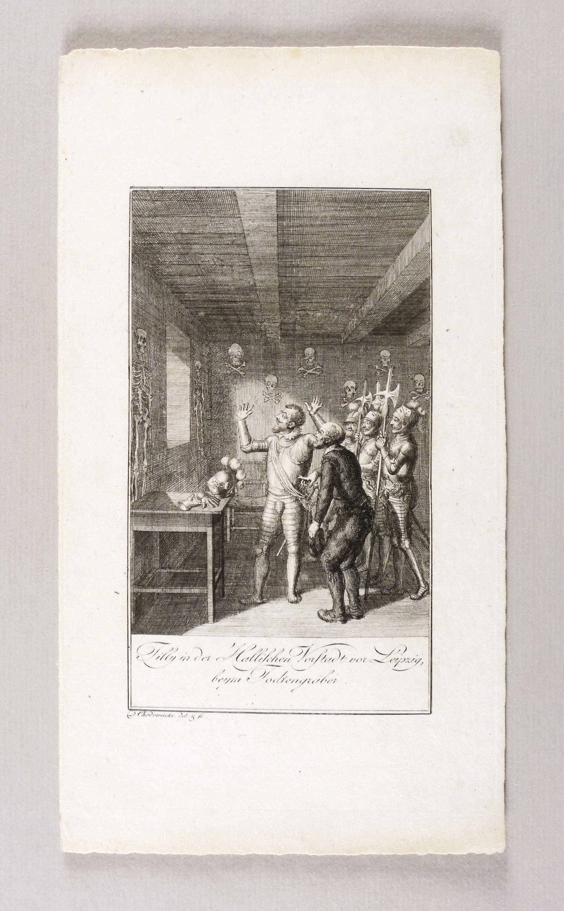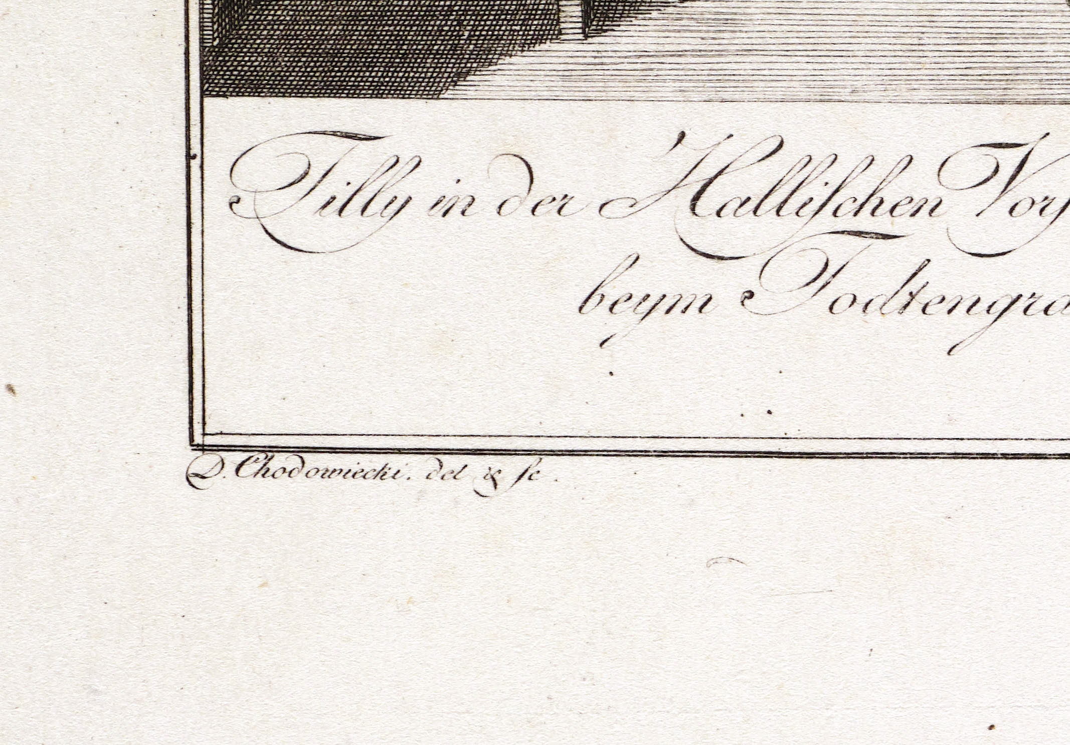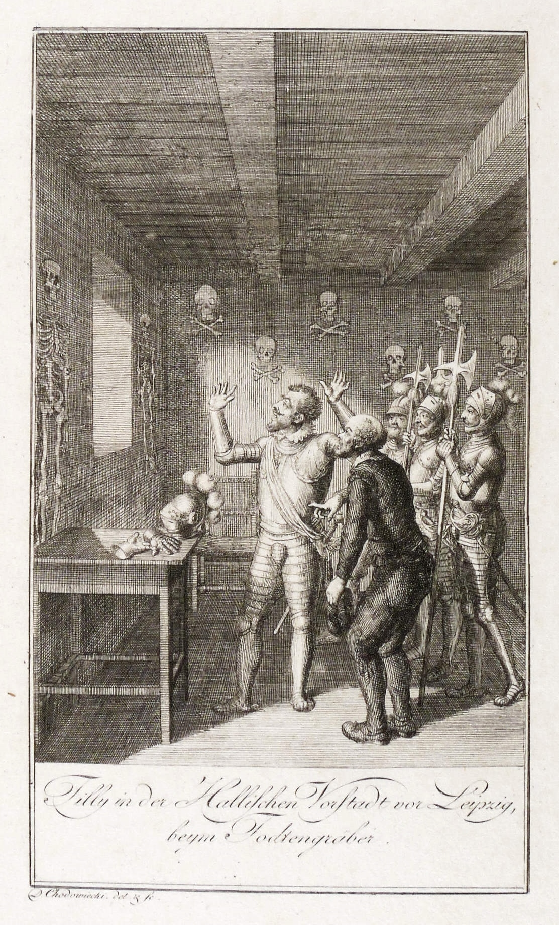 Chodowiecki, Daniel Nikolaus. – „Tilly in der Hallischen Vorstadt von Leipzig, beym Todtengräber”.