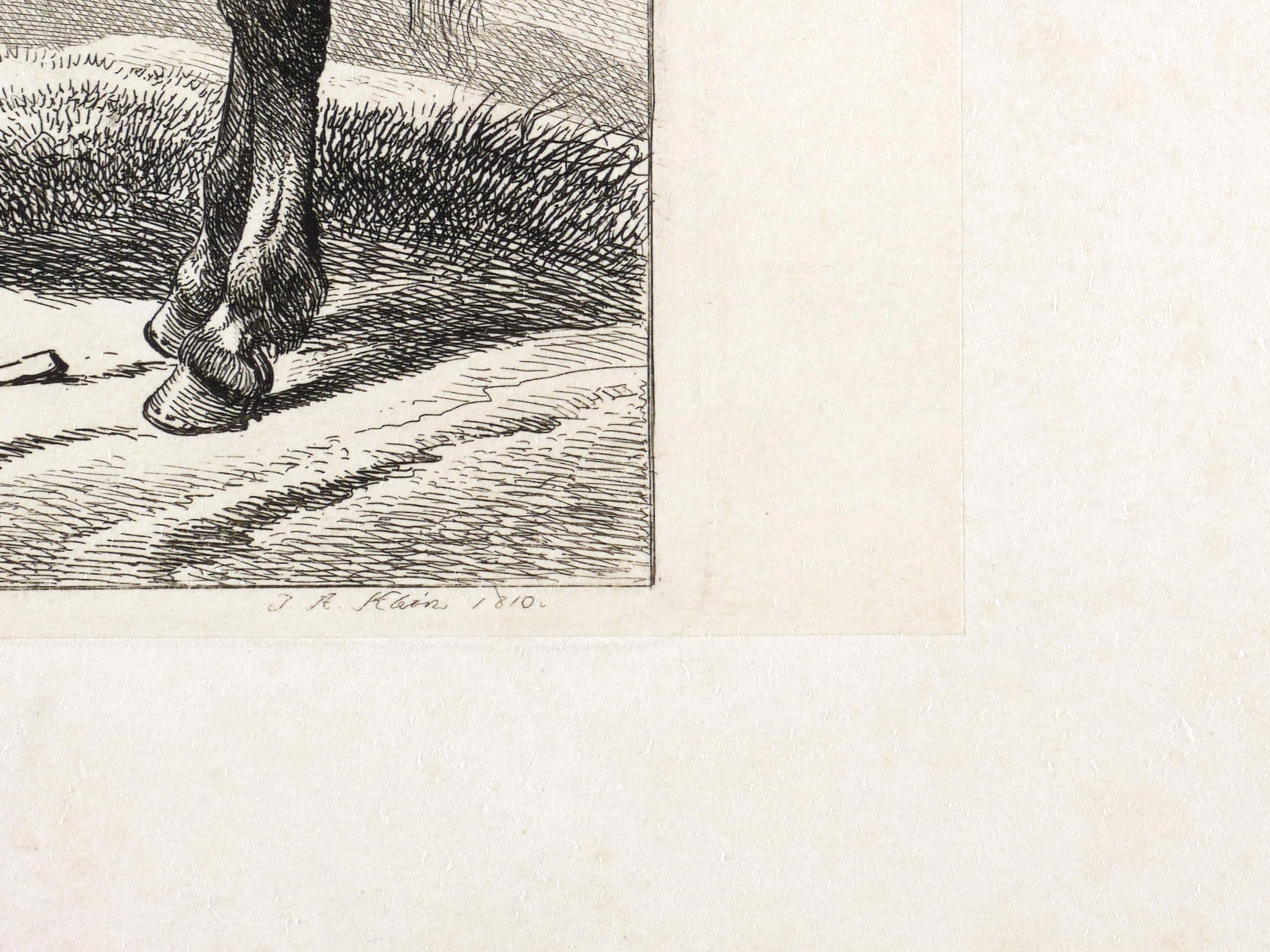 Johann Adam Klein (1792 Nürnberg - 1875 München). Deutscher Maler und Radierkünstler des Biedermeier. Erster Zeichenunterricht mit 8 Jahren bei dem Maler Georg Christoph von Bemmel. Ab 1805 Lehrling im Atelier des Kupferstechers Ambrosius Gabler. 1811 Schüler der von Gustav Philipp Zwinger geleiteten Nürnberger Zeichenschule. 1811-18 Studium an der Kunstakademie in Wien. Während einer Reise an Rhein und Main 1815 Begegnung mit dem Werk des Malers Wilhelm von Kobell. 1818 Reise ins Salzkammergut mit Johann Christoph Erhard, den Brüdern Friedrich Philipp und Heinrich Reinhold und Ernst Welker. 1819/20 Italienaufenthalt. 1839 Umsiedelung nach München und Heirat der Tochter des Kupferstechers Wolf. Mit seinen zahlreichen Tierstücken zählt Klein zu den wichtigsten Radierkünstlern des frühen 19. Jahrhunderts.