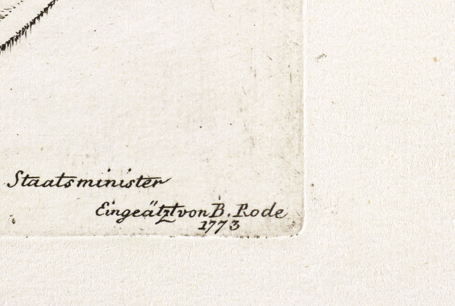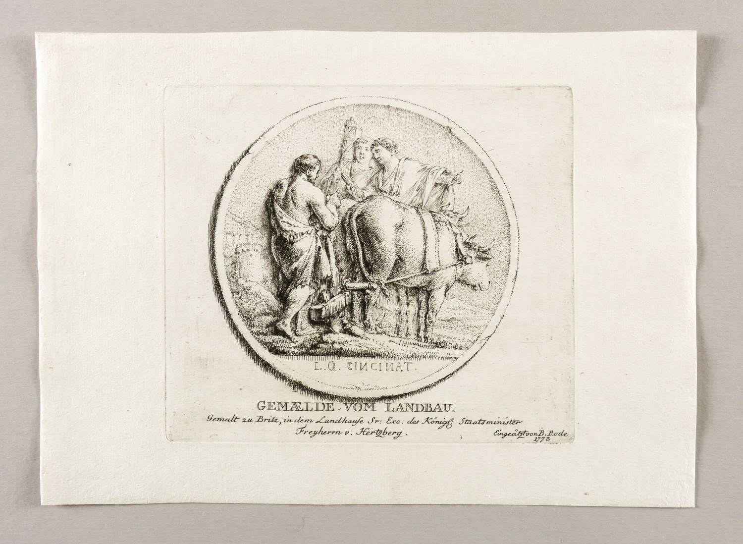 Rechts unten signiert und datiert: ″Eingeätzt von B. Rode 1773″. Unterhalb der Darstellung betitelt und bezeichnet: ″Gemalt zu Britz, in dem Landhaus Sr: Exc: des Königl: Staatsminister Freyherrn v. Hertzberg.″ – Blatt mit schwacher Knickspur im oberen Rand, wohl von einer Büroklammer herrührend. Sonst aber guter Zustand.