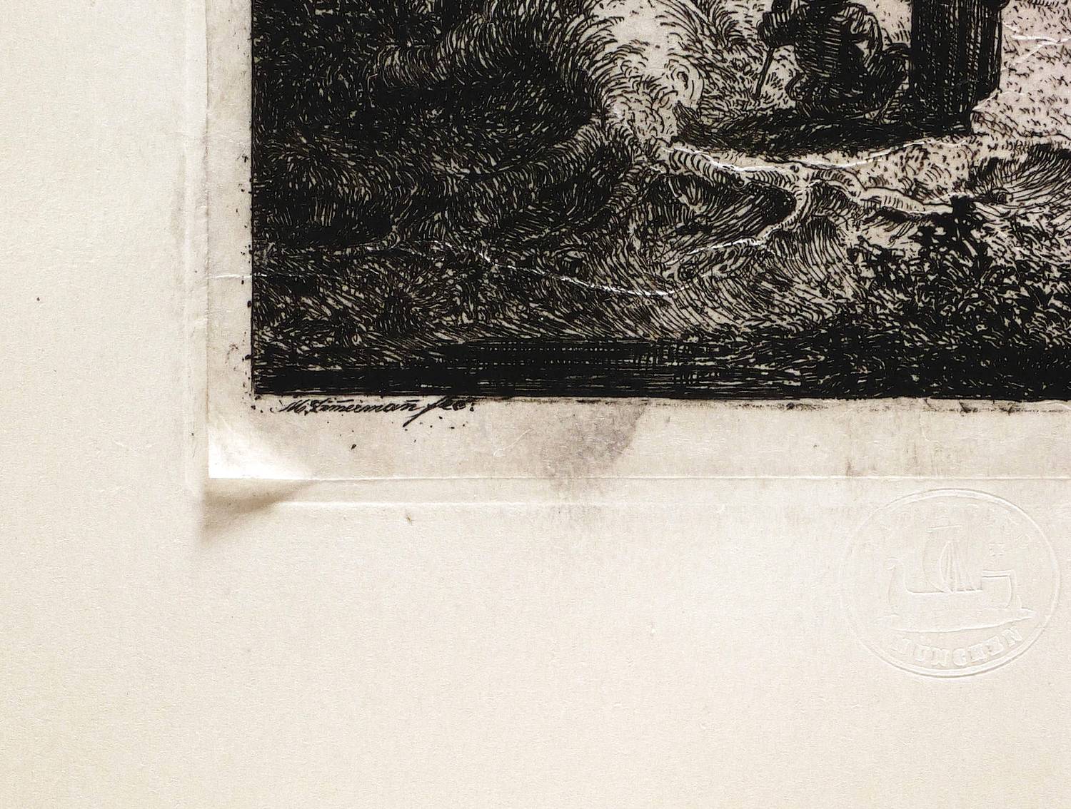 Links unten signiert: ″M Zim[m]erman[n] fec:″. Unterhalb der Darstellung Blindstempel ″RadirClub München″. – Blatt leicht wellig. Das aufgewalzte China an einer Ecke leicht abgelöst. Sonst aber guter Zustand.
