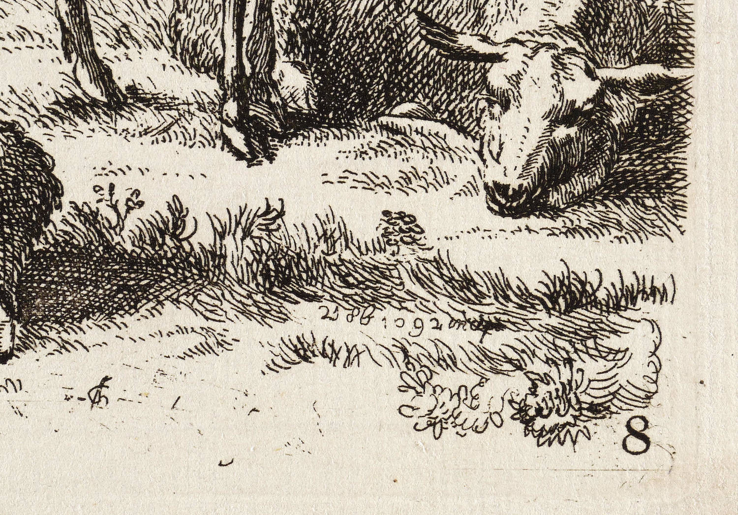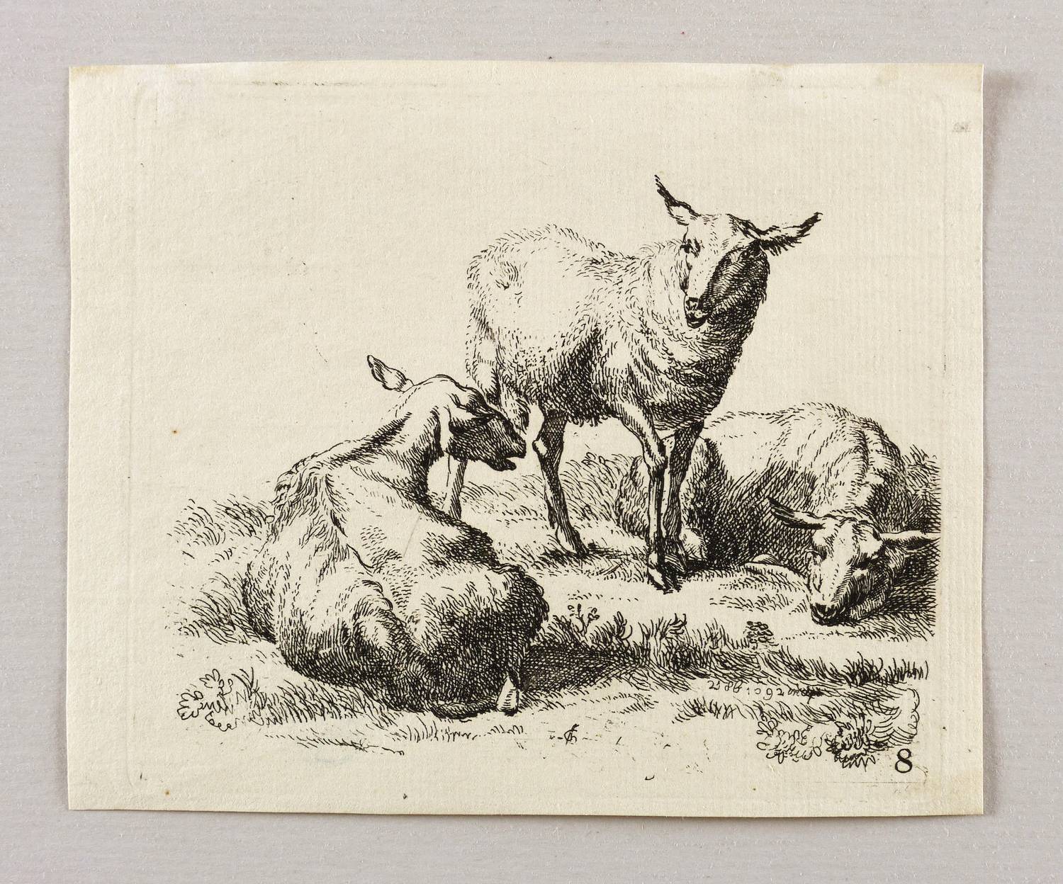 Im unteren Rand nicht lesbares Monogramm. Unten rechts datiert und darunter nummeriert: ″8″. – Seitenverkehrte Kopie nach Nicolaes Berchem, eines Blatt aus der Folge ″Animalia″. Auf der Rückseite des Blattes wird unrichtig auf Raphael Winter verwiesen. – Blatt verso mit Montageresten und Sammlungsstempel. Sonst guter Zustand.