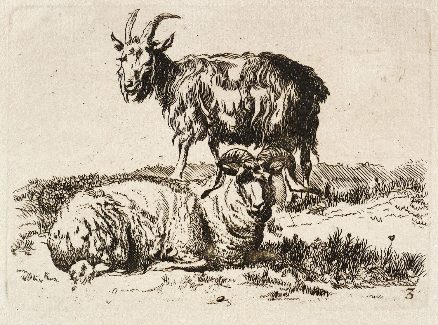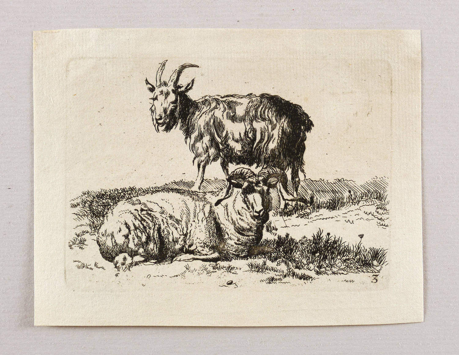 Unten rechts nummeriert: ″3″. – Seitenverkehrte Kopie nach Nicolaes Berchem, eines Blatt aus der Folge ″Animalia″. Auf der Rückseite des Blattes wird auf Raphael Wintter verwiesen. Was nicht bestätigt werden kann. – Blatt verso mit Montageresten und Sammlungsstempel. Sonst guter Zustand.