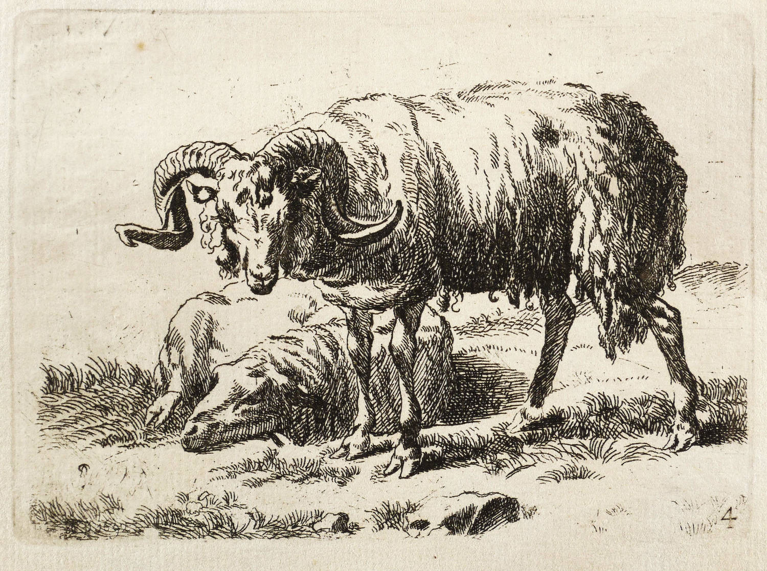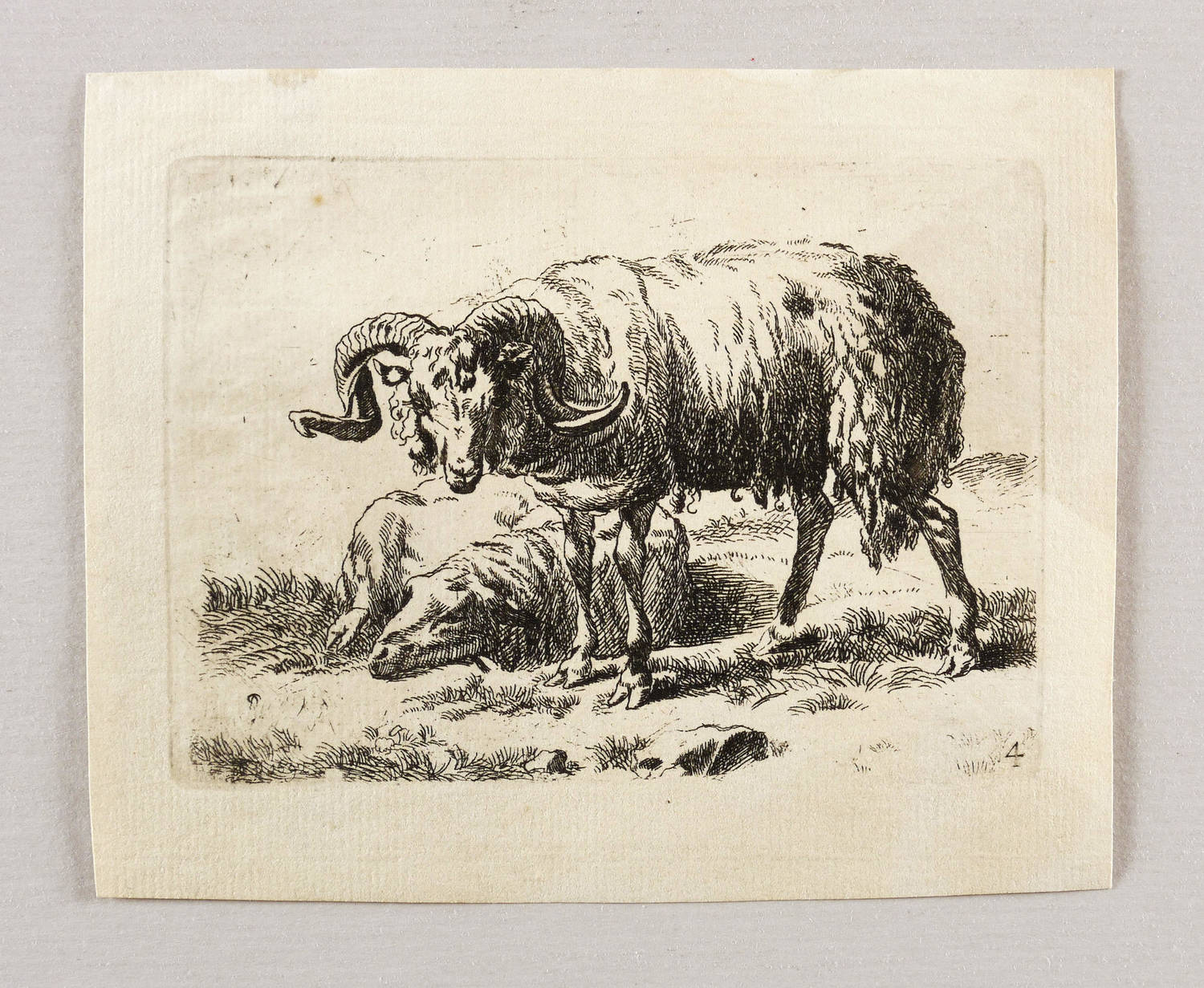 Unten rechts nummeriert: ″4″. – Seitenverkehrte Kopie nach Nicolaes Berchem, eines Blatt aus der Folge ″Animalia″. Auf der Rückseite des Blattes wird auf Raphael Wintter verwiesen. Was nicht bestätigt werden kann. – Blatt verso mit Montageresten und Sammlungsstempel. Sonst guter Zustand.