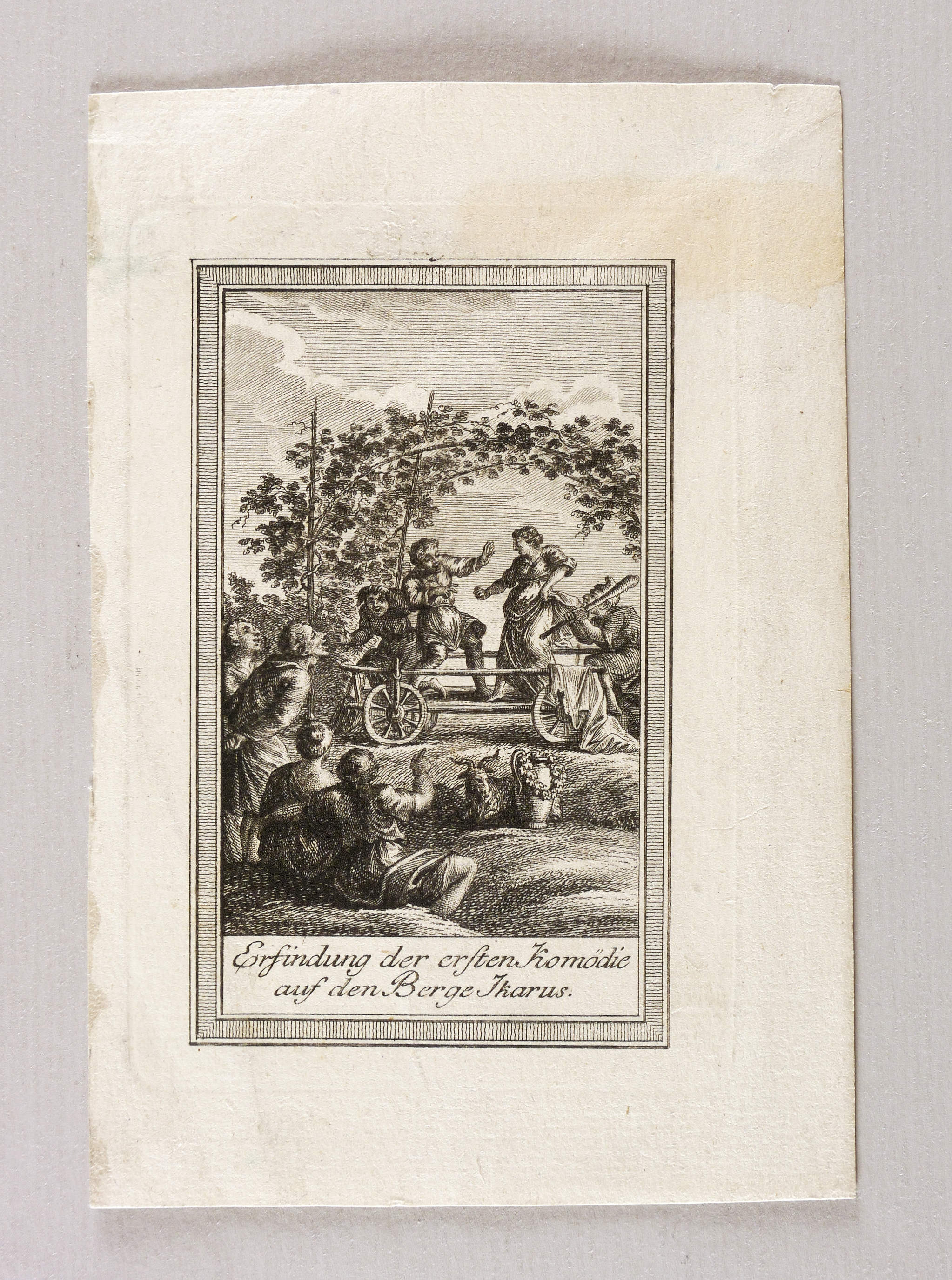 Bernigeroth, Johann Martin (zugeschrieben). – „Erfindung der ersten Komödie auf dem Berge Ikarus”.