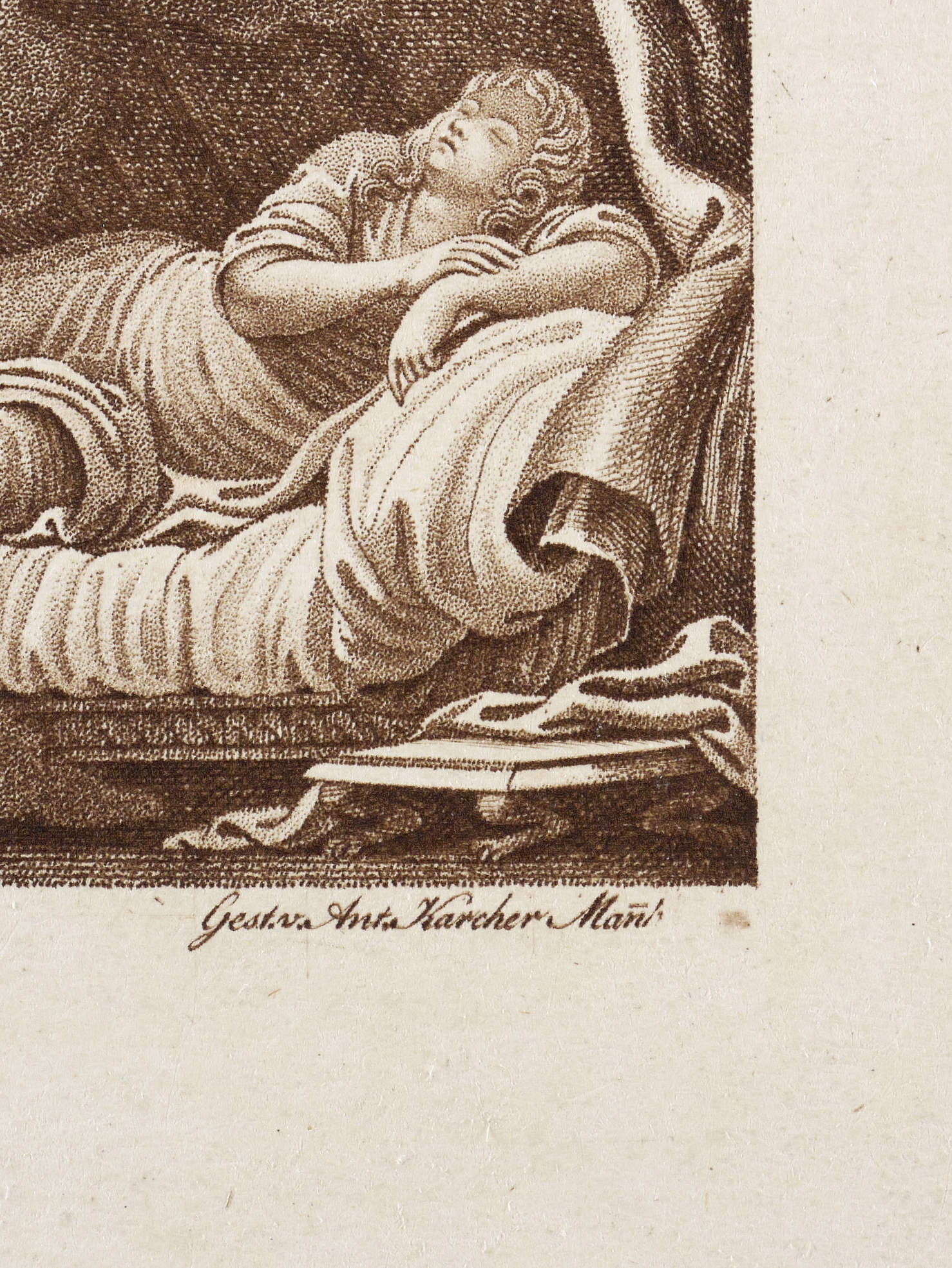 Anton Karcher (um 1760 Kolmar - 1842). Deutscher Kupferstecher in Punktiermanier. Schüler von Egid Verhelst und Heinrich Sintzenich an der Mannheimer Zeichnungsakademie. Karcher war darauf weiterhin in Mannheim tätig.
