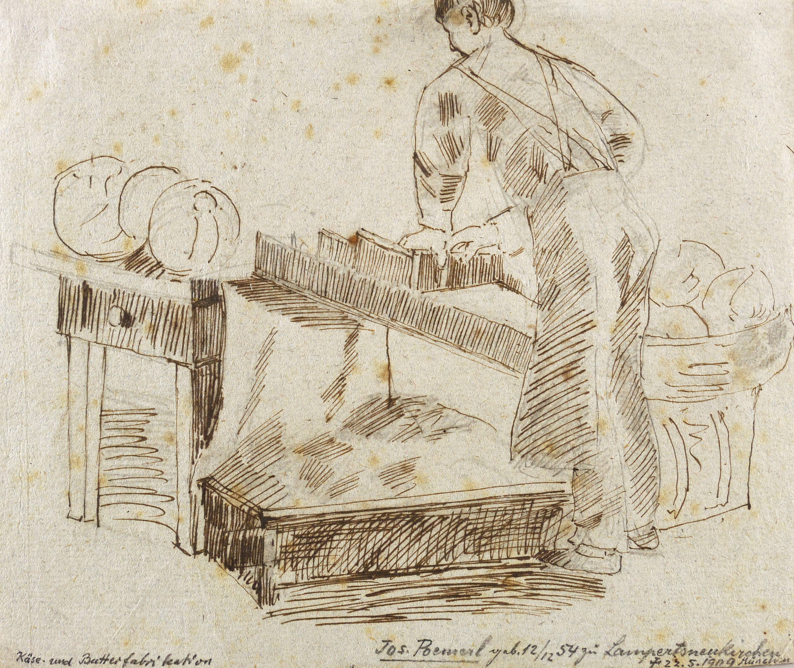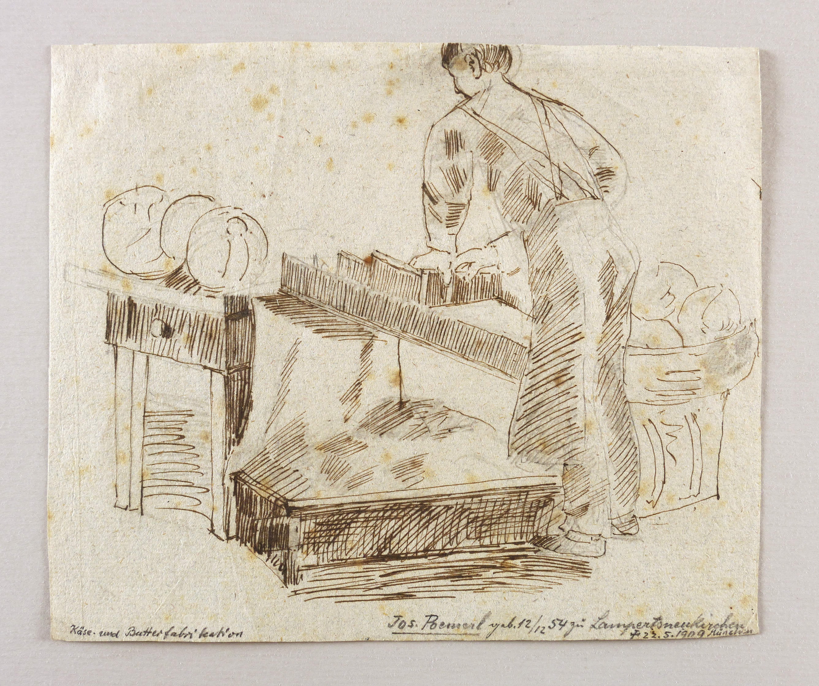 Im unteren Rand und verso bezeichnet. – Verso weitere Zeichnung zum Thema Molkerei. – Blatt leicht fleckig und verso mit Montagespuren. Sonst aber noch guter Zustand.