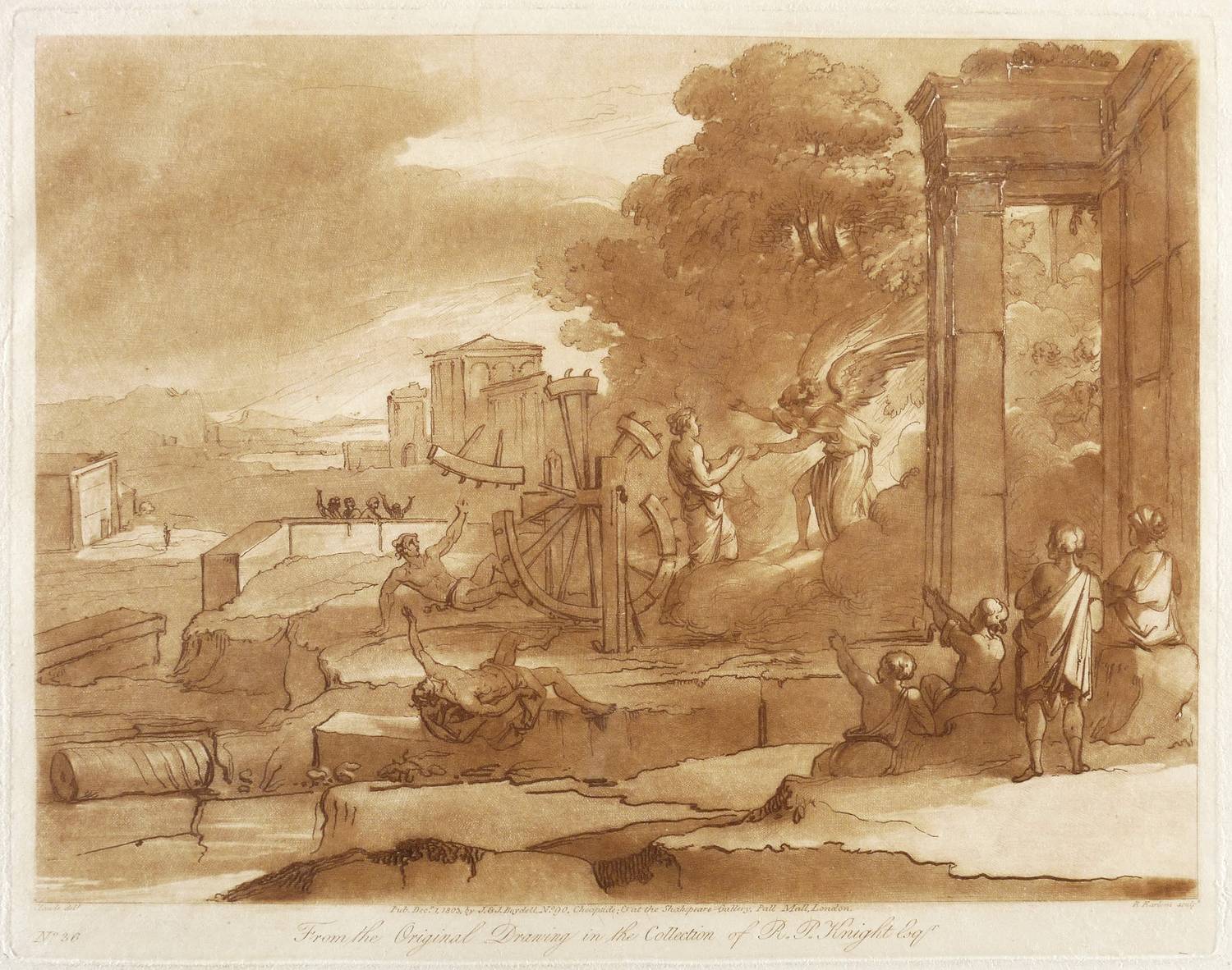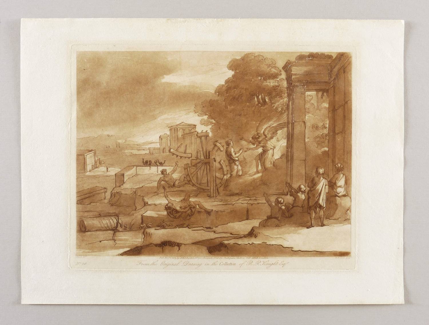 Aus: Richard Earlom, Liber veritatis. Or, a Collection of ... Prints after the Original Designs of Claude Lorrain (London: John Boydell 1774-1819). – Rechts unten signiert: ″R Earlom sculp.″ Unterhalb der Darstellung Verlegeradresse und Datierung. – Blatt verso mit Montageresten. Sonst guter Zustand.