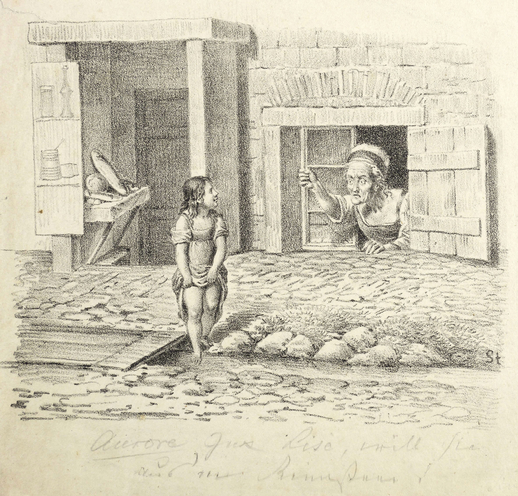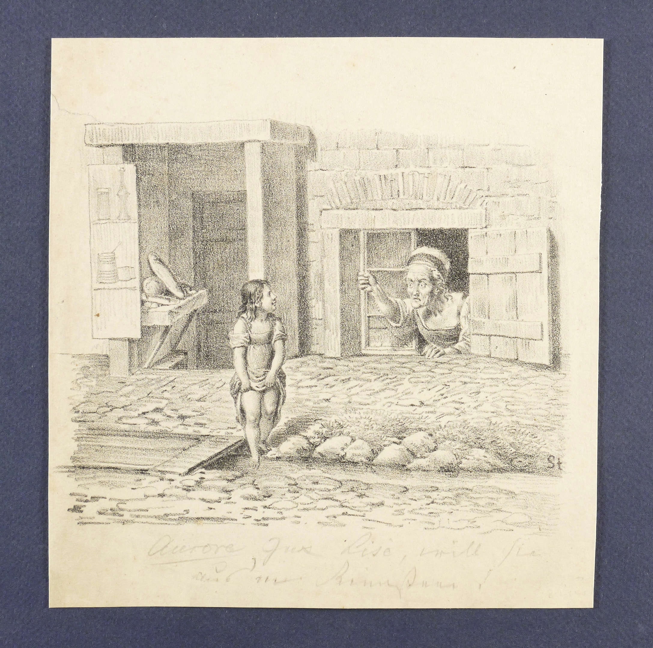 Im Stein rechts unten signiert: "St". Unterhalb in Bleistift bezeichnet: "Aurore, Jux Lise, will sie aus'm Reinwasser!" Verso weiter bezeichnet mit Künstlername etc. Sammlerstempel. – Vermutlich lithografische Inkunabel. – Einriss links oben alt hinterlegt. Sonst guter Zustand.