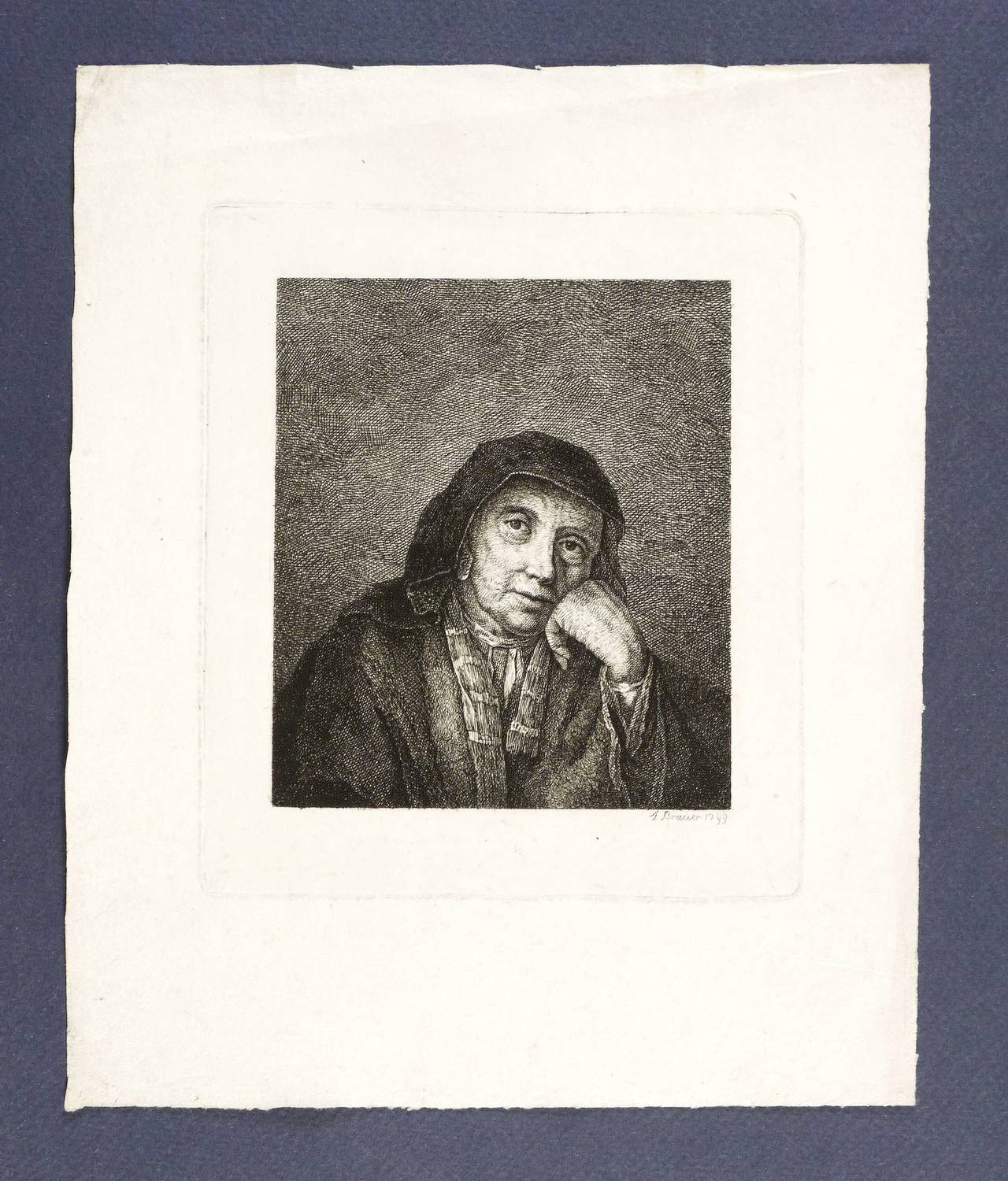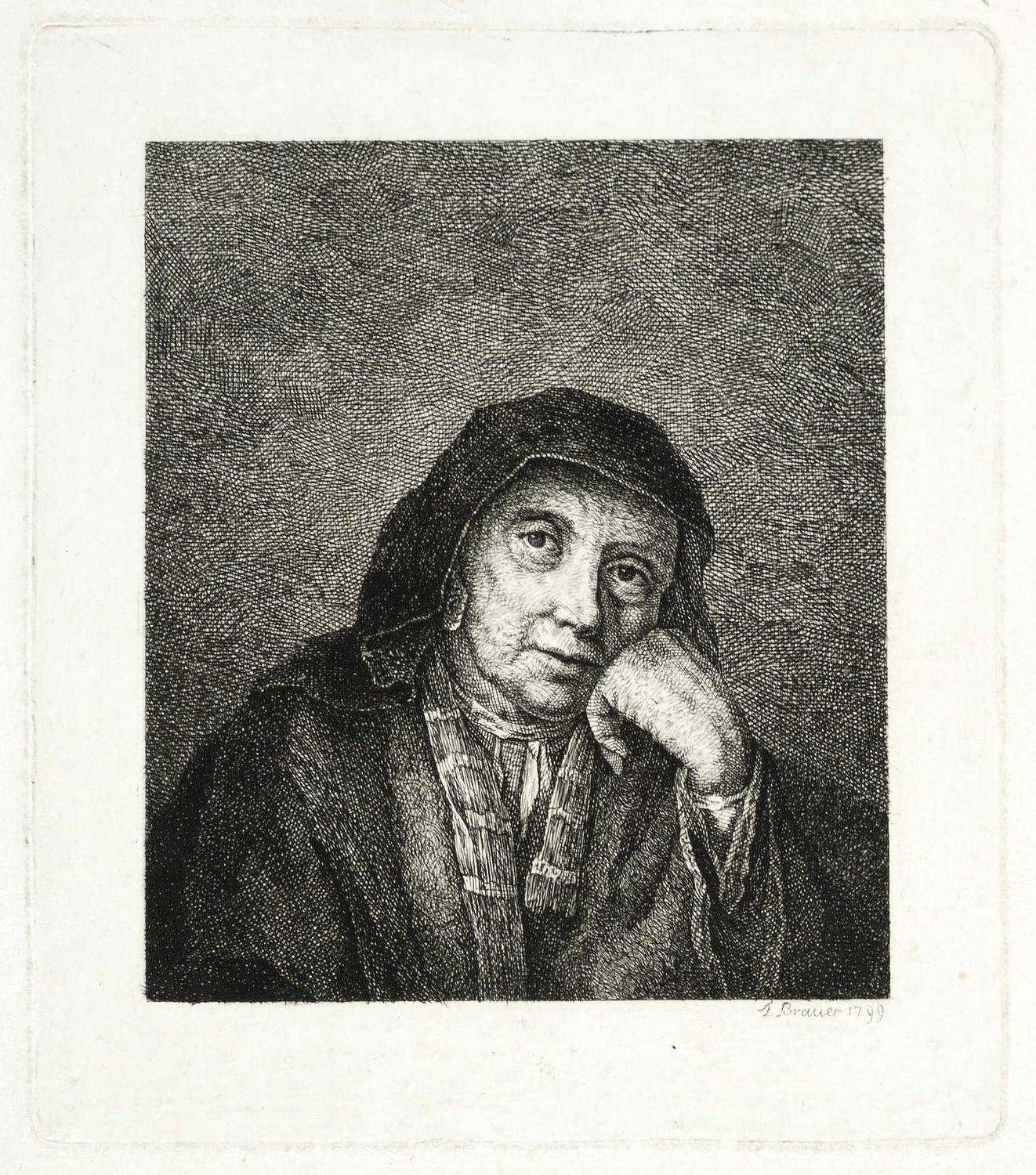 In der Platte rechts unten signiert und datiert: ″F. Brauer 1799″. Sammlerstempel. – Breiter Rand um die Platte. Oben links Diagonalfalte außerhalb der Darstellung. Verso Montagespuren. Sonst gut erhalten. Guter Zustand.