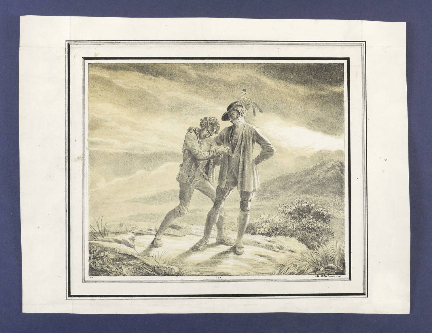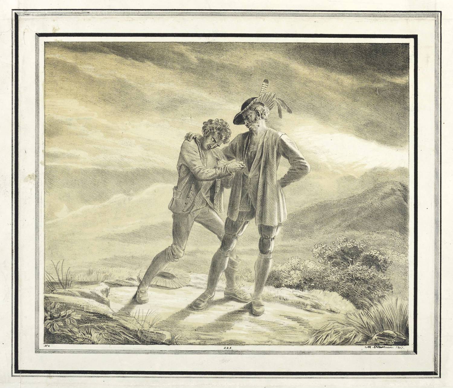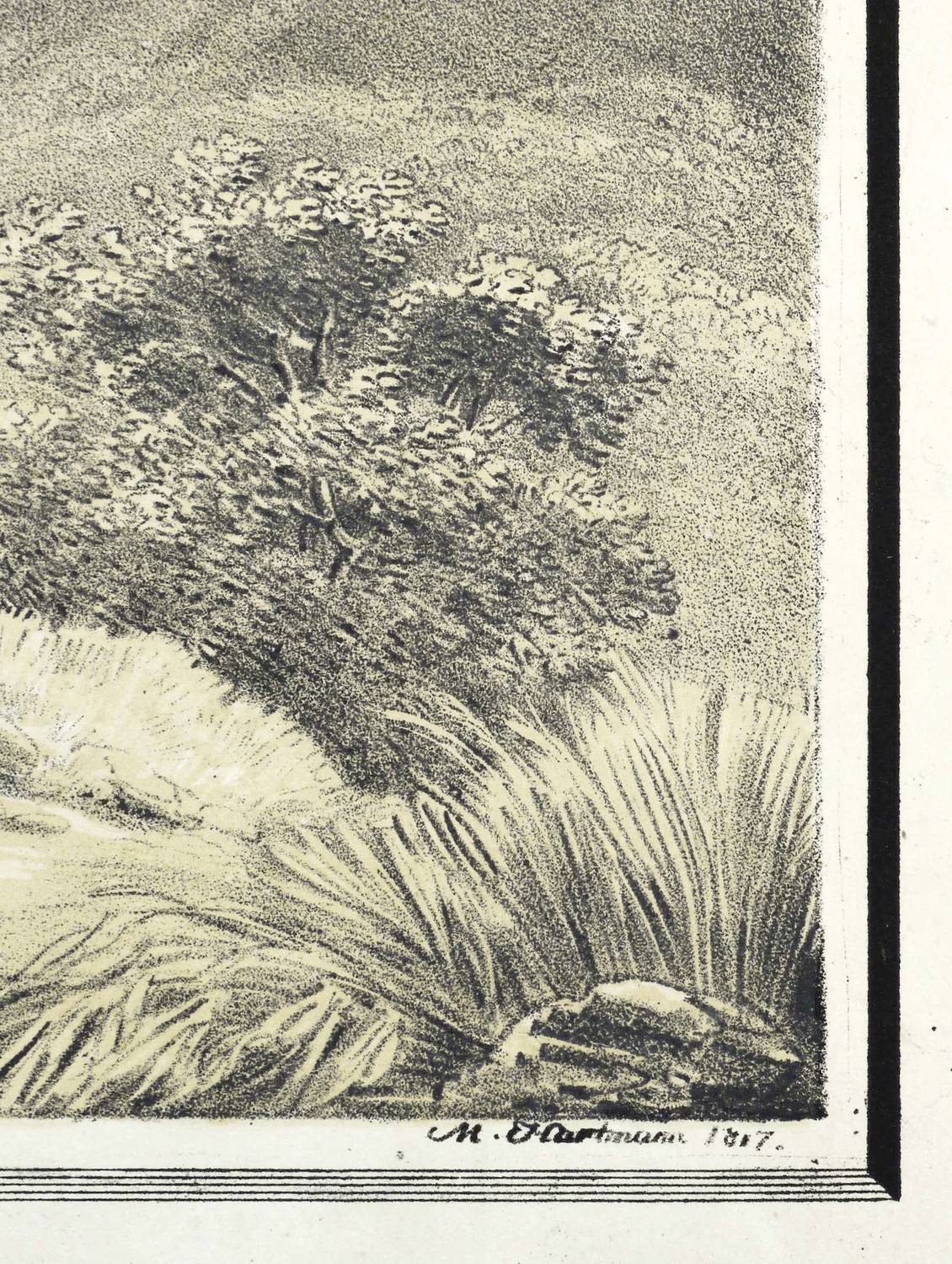 1817. Lithografie / Tonlithografie, in Schwarz, über ockerfarbener Tonplatte, auf Velin. – Von Mathias Christoph Hartmann. – 25,9 x 31,1 cm (Darstellung / ohne Schmuckrahmen), 31,5 x 36,8 cm (Darstellung / mit Schmuckrahmen), 36 x 47,5 cm (Blatt).