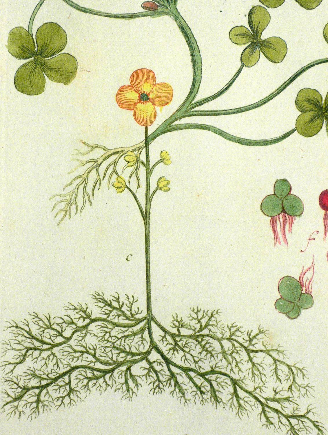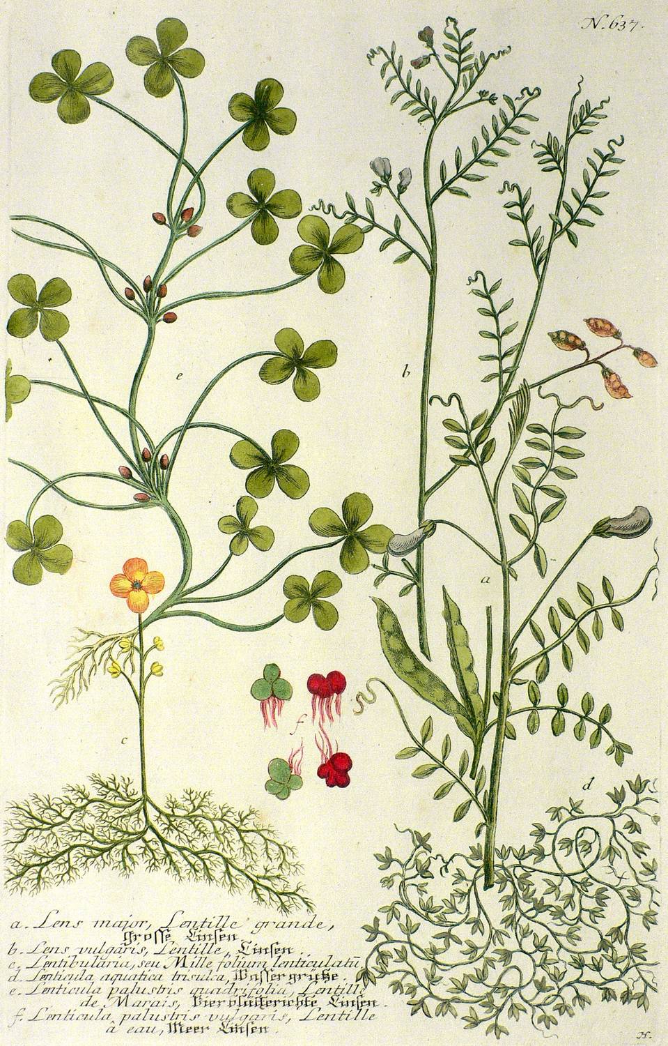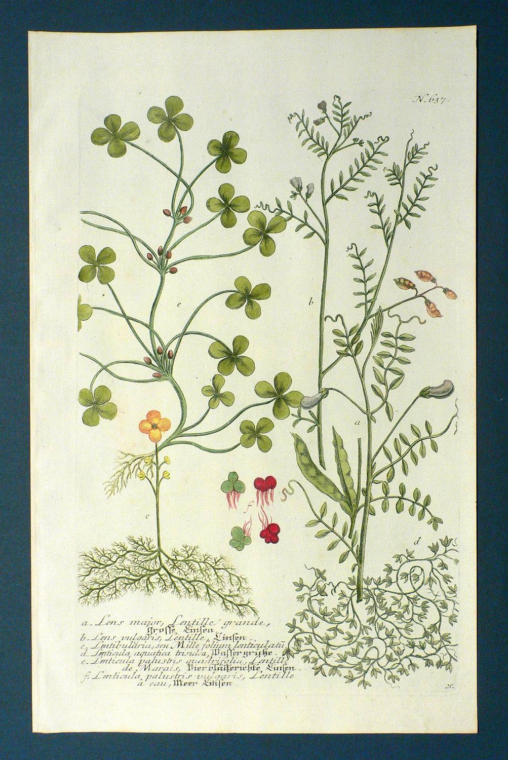 Aus: Johann Wilhelm Weinmann, Phytanthoza-Iconographia Oder Eigentliche Vorstellung Etlicher Tausend, So wohl Einheimisch- als Ausländischer, aus allen vier Welt-Theilen, in Verlauf vieler Jahre (...) gesammelter Pflantzen, Bäume, Stauden, Kräuter, Blumen, Früchten und Schwämme (Regensburg: Hieronymus Lentz 1737-1745), Bd. 3 (1742). – In der Platte rechts unten Signatur, rechts oben Tafel-Nr. "637", unten mittig ausführliche Inschrift: "a. Lens major, Lentille grande, Grosse Linsen. b. Lens vulgaris, Lentille, Linsen. c. Lentibulariar, seu Mille folium lenticulatu[m]. d. Lenticula aquatica trisulca, Wassergrütze. e. Lenticula palustris quadrfolia, Lentille de Marais, Vierblätterichte Linsen. f. Lenticula palustris vulgaris, Lentille a eau, Merr Linsen." – Bei der Herstellung der Tafeln arbeiteten die Augsburger Künstler Bartholomäus Seutter, Johann Jakob Haid und Johann Elias Ridinger zusammen. Die Kupfer wurden in einer für die Zeit revolutionären Weise farbig gedruckt und sodann partiell von Hand koloriert. Dabei fand der von Seutter weiterentwickelte Mezzotinto-Farbdruck des Niederländers Johannes Teyler Anwendung. – Das kräftige Büttenpapier sauber und frisch. Kontrastreiches wohlerhaltenes Kolorit. Insgesamt sehr guter Erhaltungszustand.