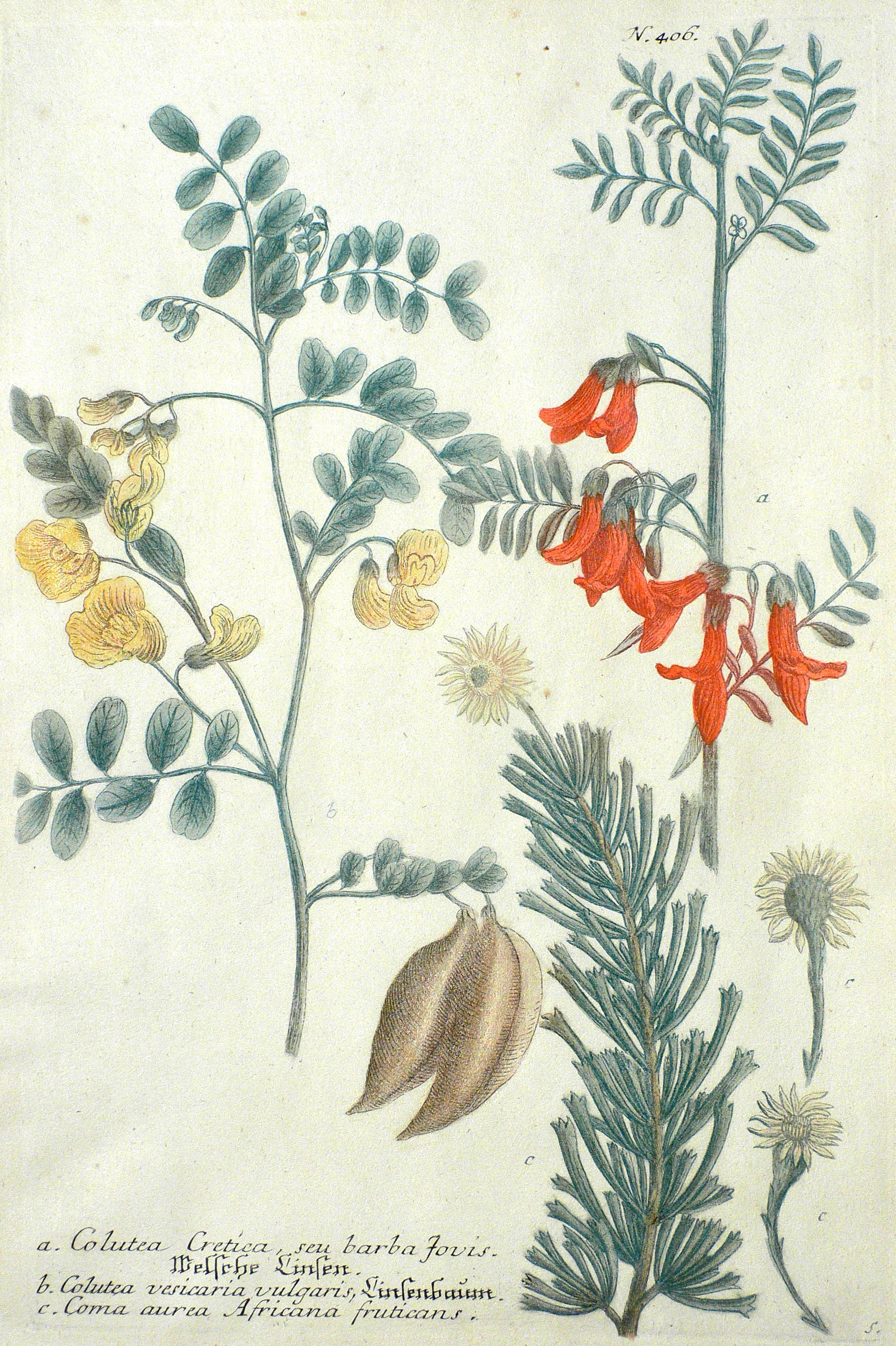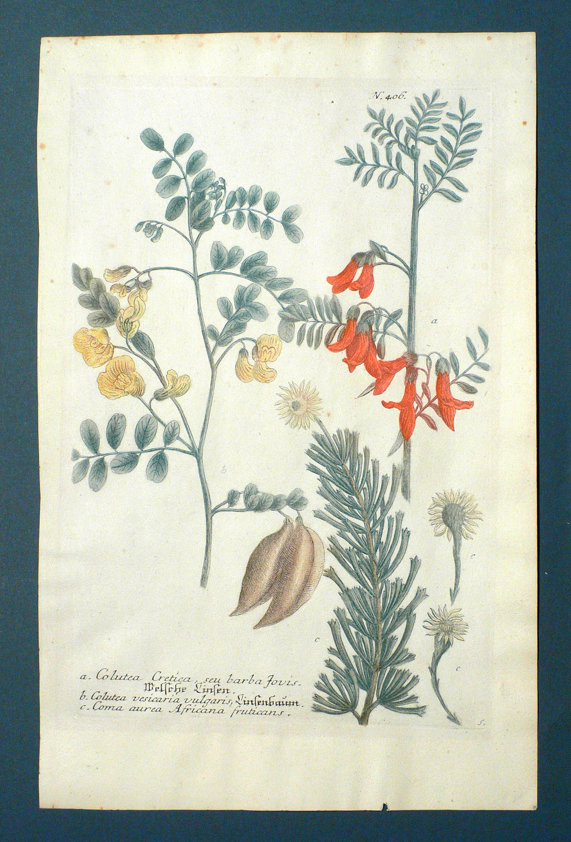 Aus: Johann Wilhelm Weinmann, Phytanthoza-Iconographia Oder Eigentliche Vorstellung Etlicher Tausend, So wohl Einheimisch- als Ausländischer, aus allen vier Welt-Theilen, in Verlauf vieler Jahre (...) gesammelter Pflantzen, Bäume, Stauden, Kräuter, Blumen, Früchten und Schwämme (Regensburg: Hieronymus Lentz 1737-1745), Bd. 3 (1742). – Rechts unten monogrammiert: ″S.″ Rechts oben Tafel-Nr. ″406.″ Unterhalb der Darstellung bezeichnet: ″a. Colutea Cretica seu barba Jovis. Welsche Linse. b. Colutea vesicaria vulgaris, Linsenbaum. c. Coma aurea Africana fruticans.″ – Bei der Herstellung der Tafeln arbeiteten die Augsburger Künstler Bartholomäus Seutter, Johann Jakob Haid und Johann Elias Ridinger zusammen. Die Kupfer wurden in einer für die Zeit revolutionären Weise farbig gedruckt und sodann partiell von Hand koloriert. Dabei fand der von Seutter weiterentwickelte Mezzotinto-Farbdruck des Niederländers Johannes Teyler Anwendung. – Das kräftige Büttenpapier sauber und frisch. Im Bereich der Darstellung leicht gebräunt. Etwas flaues Kolorit. Ingesamt aber guter Erhaltungszustand.