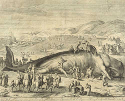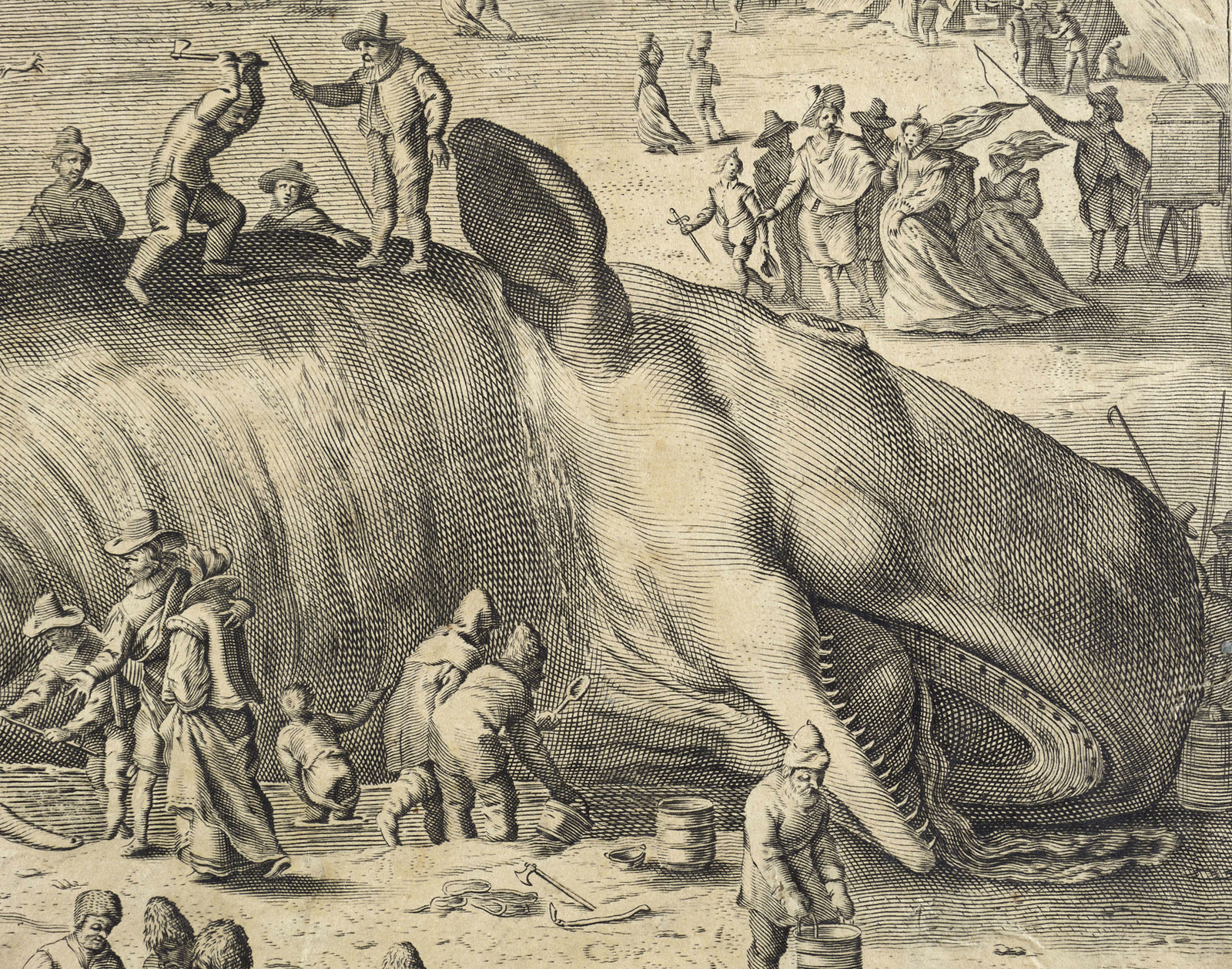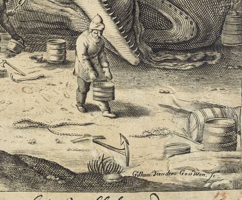 Hollstein 1 I. New Hollstein 202 e I. Wurzbach 1. – In der Platte rechts unter dem liegenden Anker signiert: ″Gilliam Van der GouWen sc.″ Weiter unter der Darstellung bezeichnet: ″Een Walvisch. Lang 70 voeten. gestrandt op de Hollandtse zee-kust, tusschen Schevelungen en Katwyk, in Sprokkelmaandt, 1598.″ – Früher erster Zustand der Platte mit der älteren Schrift. - Gesuchtes Blatt. – In der Platte auf Darstellungsrand und Schrift beschnitten. Oberflächlich leicht berieben. Durchgehend etwas knickspurig. Rechts oben im Himmel beschädigte Partie mit geringfügigem Papierverlust. Bisweilen kaum merklich fleckig. Alt partiell auf Büttenkarton aufgelegt. Mangelhafter bis mäßig guter Zustand.