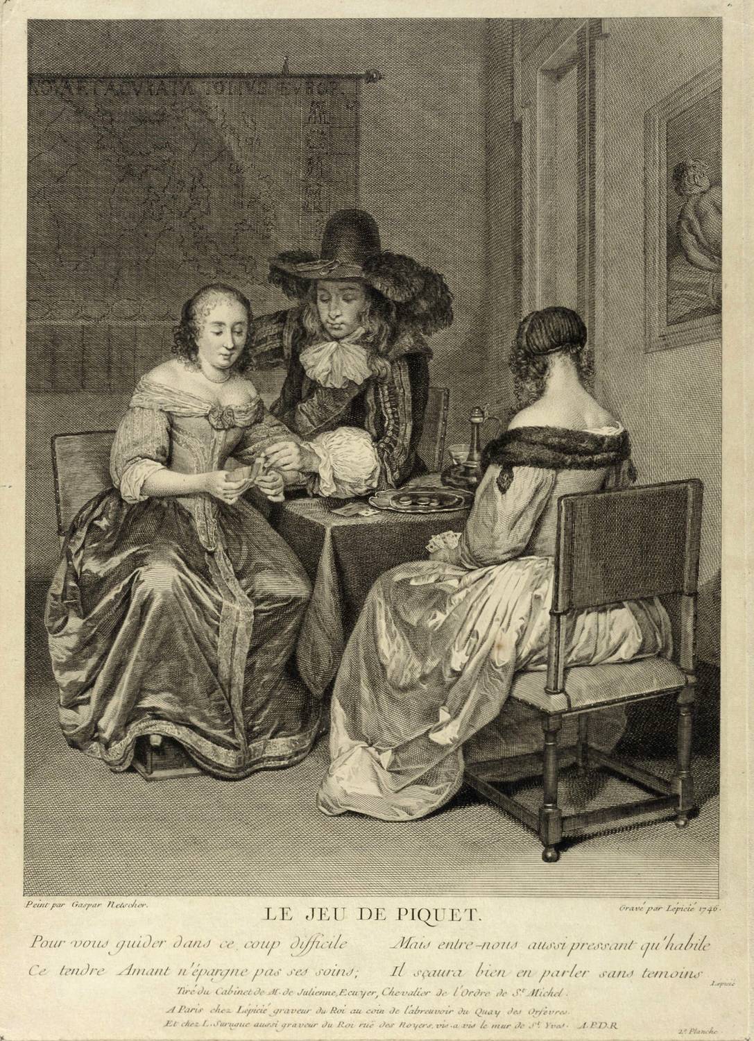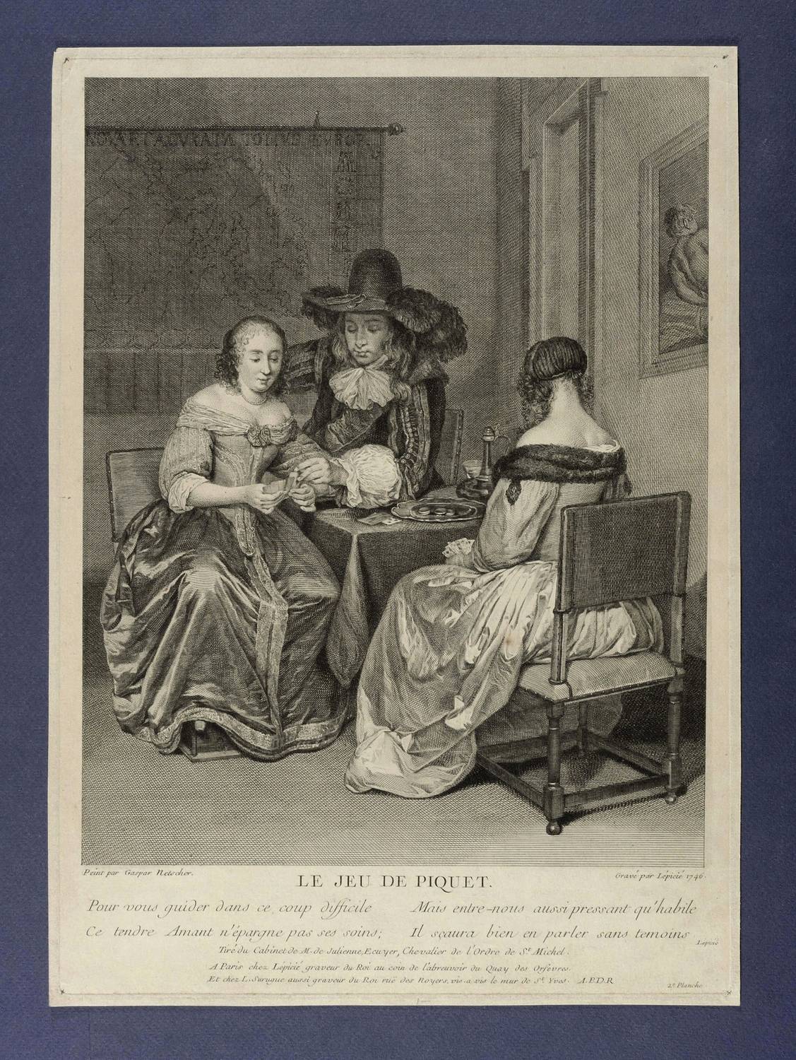 In der Platte rechts unten signiert und datiert: ″Gravé par Lépicié 1746.″ Links bezeichnet: ″Peint par Gaspar Netscher.″ Mittig Titel: ″LE JEU DE PIQUET.″ Darunter als Inschrift die Verse: ″Pour vous guider dans ce coup difficile / Ce tendre Amant n'épargne pas ses soins; // Mais entre-nous aussi pressant qu'habile / Il scaura bien en parler sans temois / Lépicié″. Mit der Verlegeradresse von Bernard Lépicié. – Schmalrndiges Exemplar. In den Plattenecken jeweils unscheinbare Reißzwecklöchlein. Oberflächlich geringfügig angeschmutzt. Verso Montagespuren. Insgesamt doch guter Zustand.