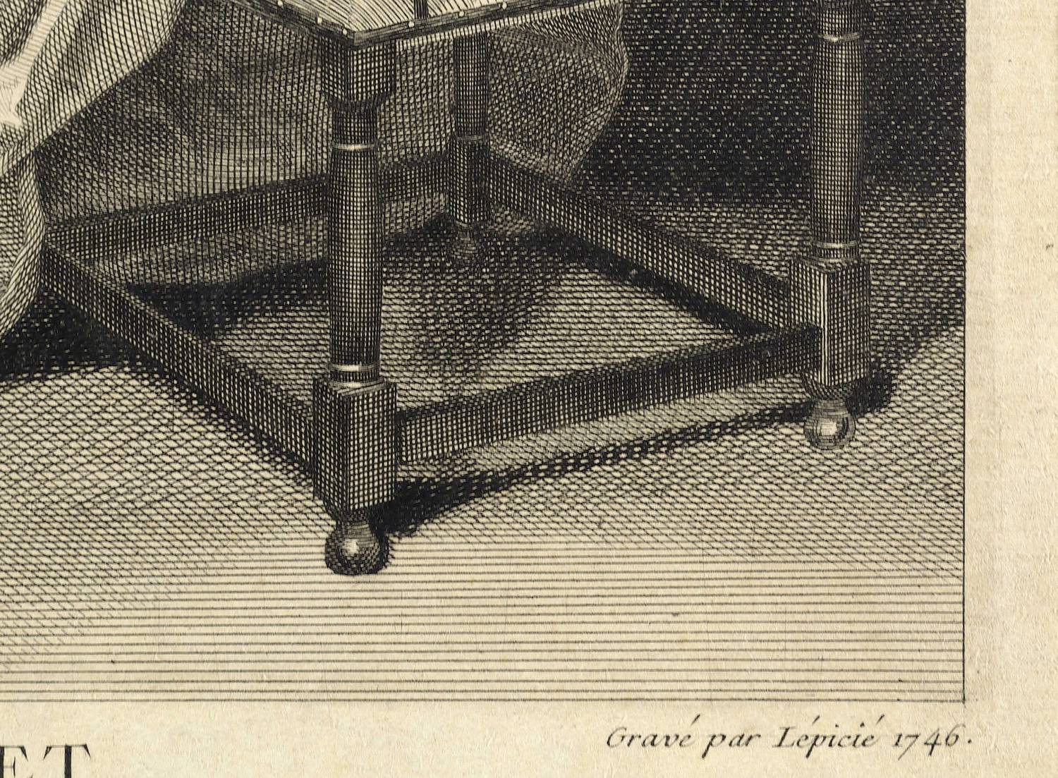 1746. Kupferstich / Linienstich, in Schwarz, auf Bütten. – Originale Künstlergrafik, von Francois Bernard Lépicié. – 32,0 x 25,3 cm (Darstellung / ohne Schrift), 38,3 x 27,4 cm (Platte), 39 x 28 cm (Blatt).