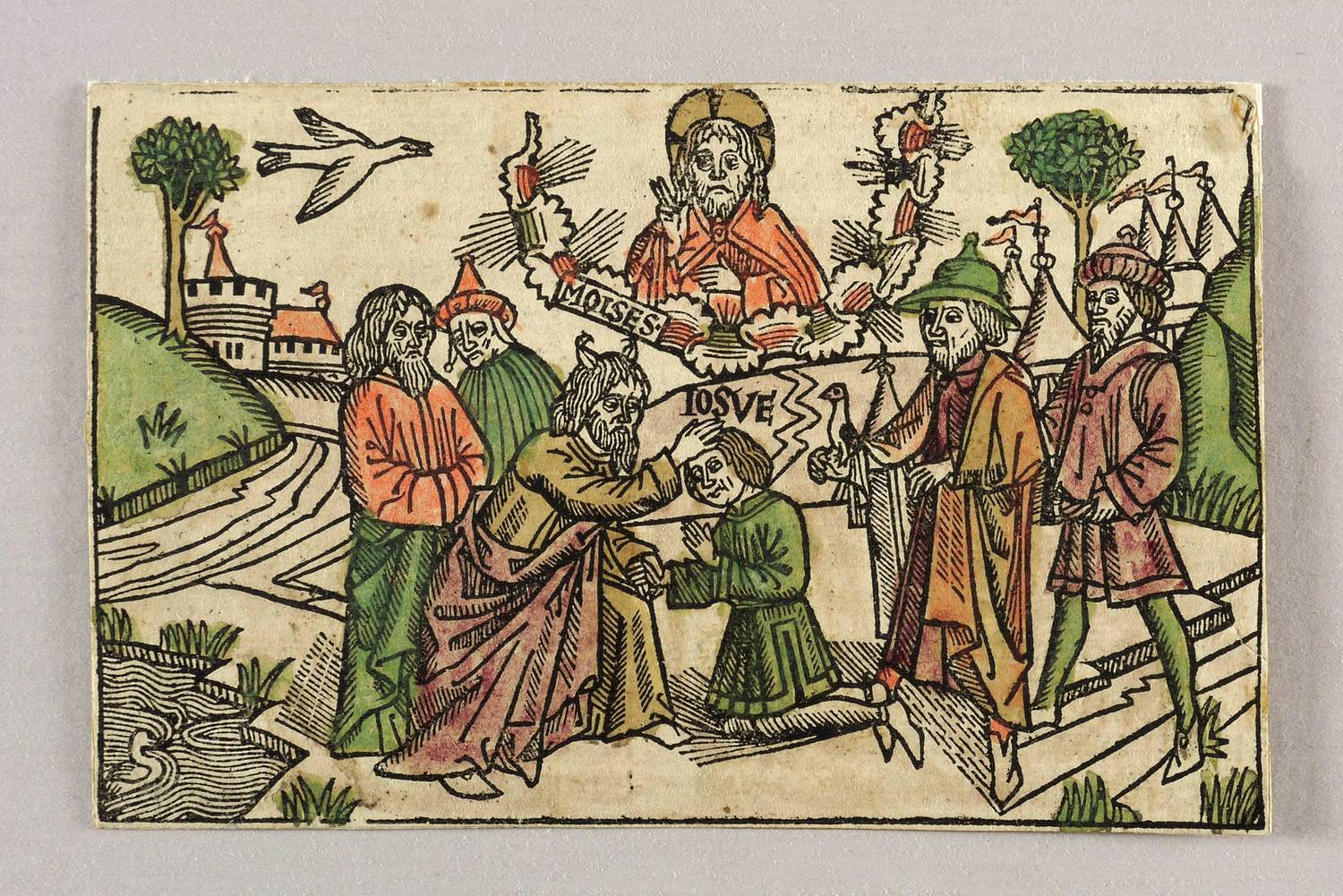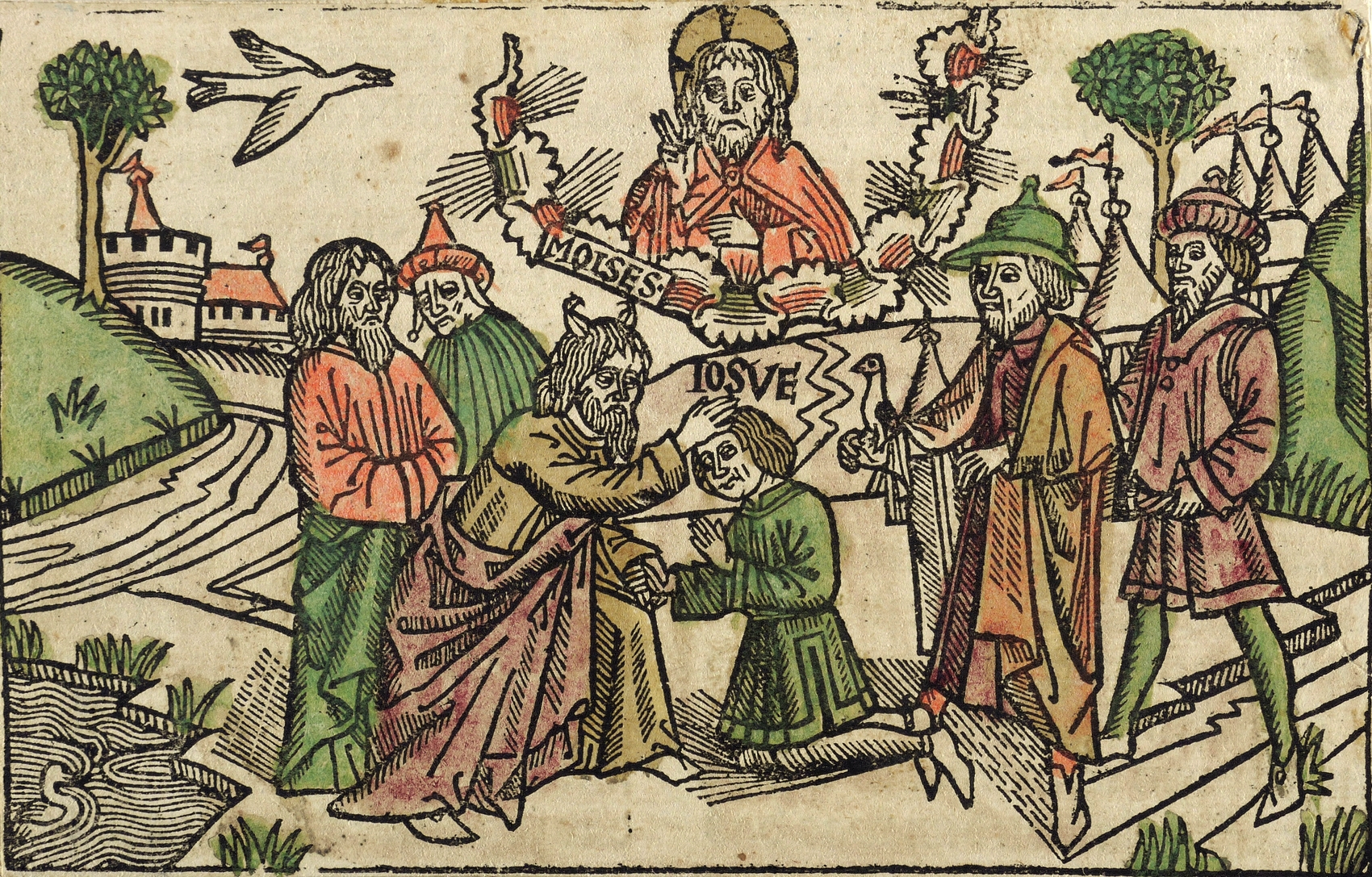 In der Darstellung geschnittene Inschrift: ″MOISES / IOSVE″. Verso Besitzstempel der Königlichen Kupferstich-Sammlung München (Lugt 1614). Dazu Veräußerungs-Stempel, handschriftlich datiert 6.3.1920. – Spätgotische Buchillustration aus der deutschen Bibel des Augsburger Drucker-Verlegers Johann Schönsperger d.Ä. (1455-1521) in der Ausgabe von 1490. – Die Holzschnitte bei Schönsperger sind Kopien nach den llustrationen der im Format größeren Koberger-Bibel aus Nürnberg. – Mit knappem Rändchen um die Einfassungslinie des Holzschnitts. Guter Zustand.
