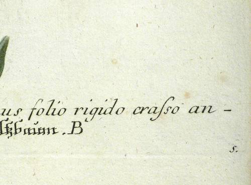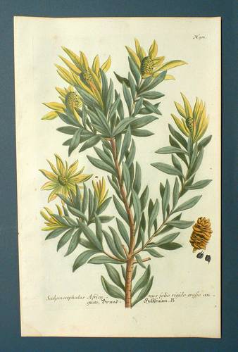 Aus: Johann Wilhelm Weinmann, Phytanthoza-Iconographia Oder Eigentliche Vorstellung Etlicher Tausend, So wohl Einheimisch- als Ausländischer, aus allen vier Welt-Theilen, in Verlauf vieler Jahre (...) gesammelter Pflantzen, Bäume, Stauden, Kräuter, Blumen, Früchten und Schwämme (Regensburg: Lentz 1745), Bd. IV. – In der Platte rechts unten Signatur, rechts oben Tafel-Nr. "901", unten mittig ausführliche Inschrift: "a. Scolymocephalus Africanus folio rigido crasso angusto, Brand-Holtzbaum, B." – Bei der Herstellung der Tafeln arbeiteten die Augsburger Künstler Bartholomäus Seutter, Johann Jakob Haid und Johann Elias Ridinger zusammen. Die Kupfer wurden in einer für die Zeit revolutionären Weise farbig gedruckt und sodann partiell von Hand koloriert. Dabei fand der von Seutter weiterentwickelte Mezzotinto-Farbdruck des Niederländers Johannes Teyler Anwendung. – Das kräftige Büttenpapier bis auf einen schwachen Wasserfleck unten links, sauber und frisch. Kontrastreiches wohlerhaltenes Kolorit. Insgesamt guter Erhaltungszustand.