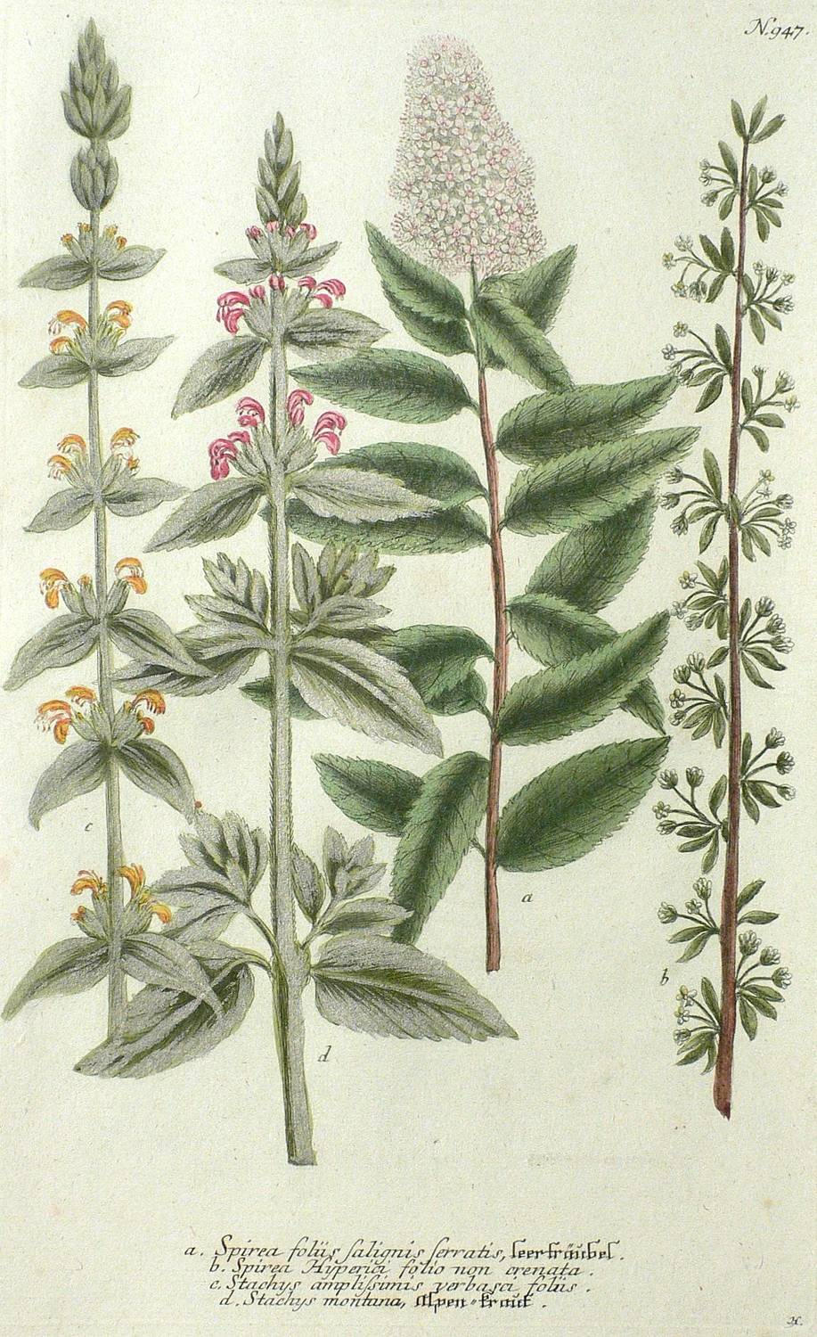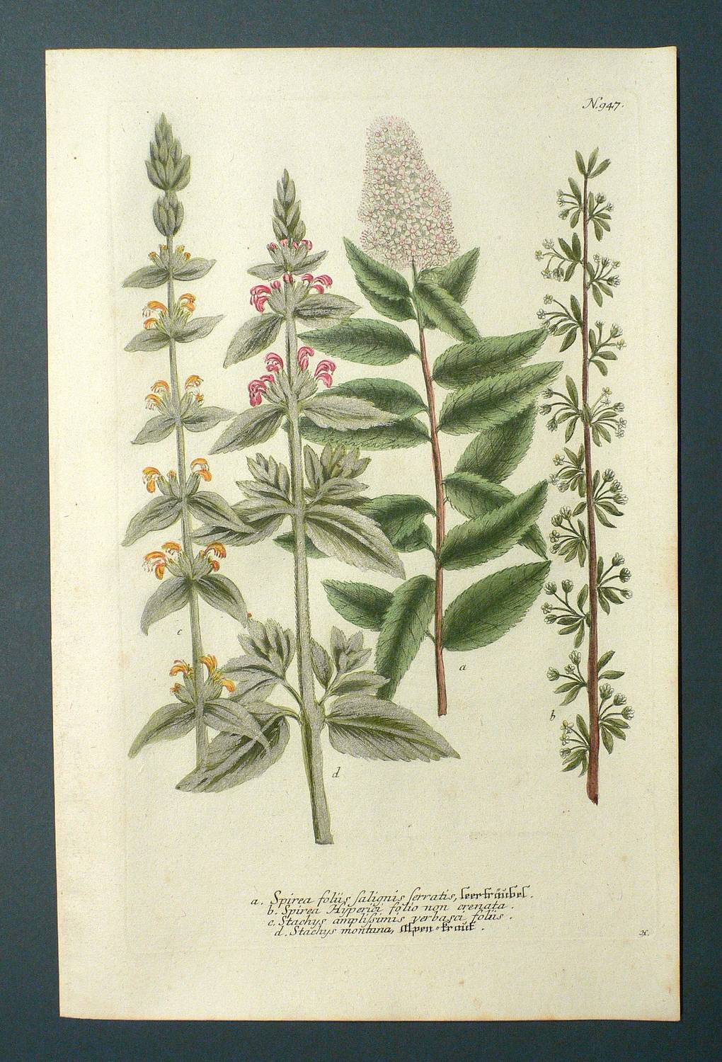 Aus: Johann Wilhelm Weinmann, Phytanthoza-Iconographia Oder Eigentliche Vorstellung Etlicher Tausend, So wohl Einheimisch- als Ausländischer, aus allen vier Welt-Theilen, in Verlauf vieler Jahre (...) gesammelter Pflantzen, Bäume, Stauden, Kräuter, Blumen, Früchten und Schwämme (Regensburg: Lentz 1745), Bd. IV. – Rechts unten Signatur, rechts oben Tafel-Nr. "947", unterhalb mittig ausführliche Inschrift. – Bei der Herstellung der Tafeln arbeiteten die Augsburger Künstler Bartholomäus Seutter, Johann Jakob Haid und Johann Elias Ridinger zusammen. Die Kupfer wurden in einer für die Zeit revolutionären Weise farbig gedruckt und sodann partiell von Hand koloriert. Dabei fand der von Seutter weiterentwickelte Mezzotinto-Farbdruck des Niederländers Johannes Teyler Anwendung. – Das kräftige Büttenpapier sauber und frisch. Wohlerhaltenes Kolorit. Guter Erhaltungszustand.