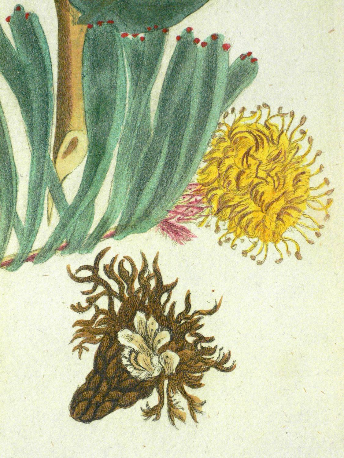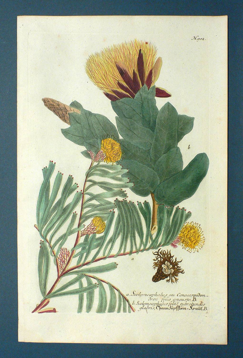 Aus: Johann Wilhelm Weinmann, Phytanthoza-Iconographia Oder Eigentliche Vorstellung Etlicher Tausend, So wohl Einheimisch- als Ausländischer, aus allen vier Welt-Theilen, in Verlauf vieler Jahre (...) gesammelter Pflantzen, Bäume, Stauden, Kräuter, Blumen, Früchten und Schwämme (Regensburg: Lentz 1745), Bd. IV. – Rechts unten Signatur, rechts oben Tafel-Nr. "902", unterhalb ausführliche Inschrift. – Bei der Herstellung der Tafeln arbeiteten die Augsburger Künstler Bartholomäus Seutter, Johann Jakob Haid und Johann Elias Ridinger zusammen. Die Kupfer wurden in einer für die Zeit revolutionären Weise farbig gedruckt und sodann partiell von Hand koloriert. Dabei fand der von Seutter weiterentwickelte Mezzotinto-Farbdruck des Niederländers Johannes Teyler Anwendung. – Das kräftige Büttenpapier sauber und frisch. Kontrastreiches wohlerhaltenes Kolorit. Insgesamt guter Erhaltungszustand.