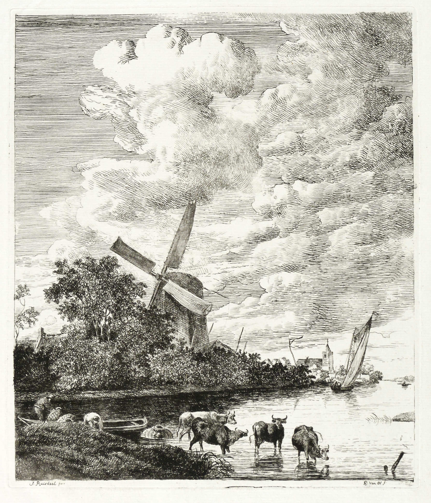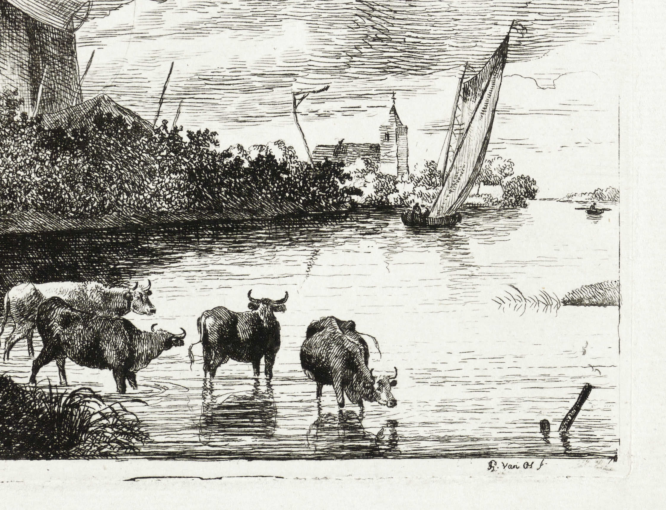 Os, Pieter Gerardus van. – Nach Jacob van Ruisdael. – „Vier Kühe im Wasser vor einer Windmühle”.