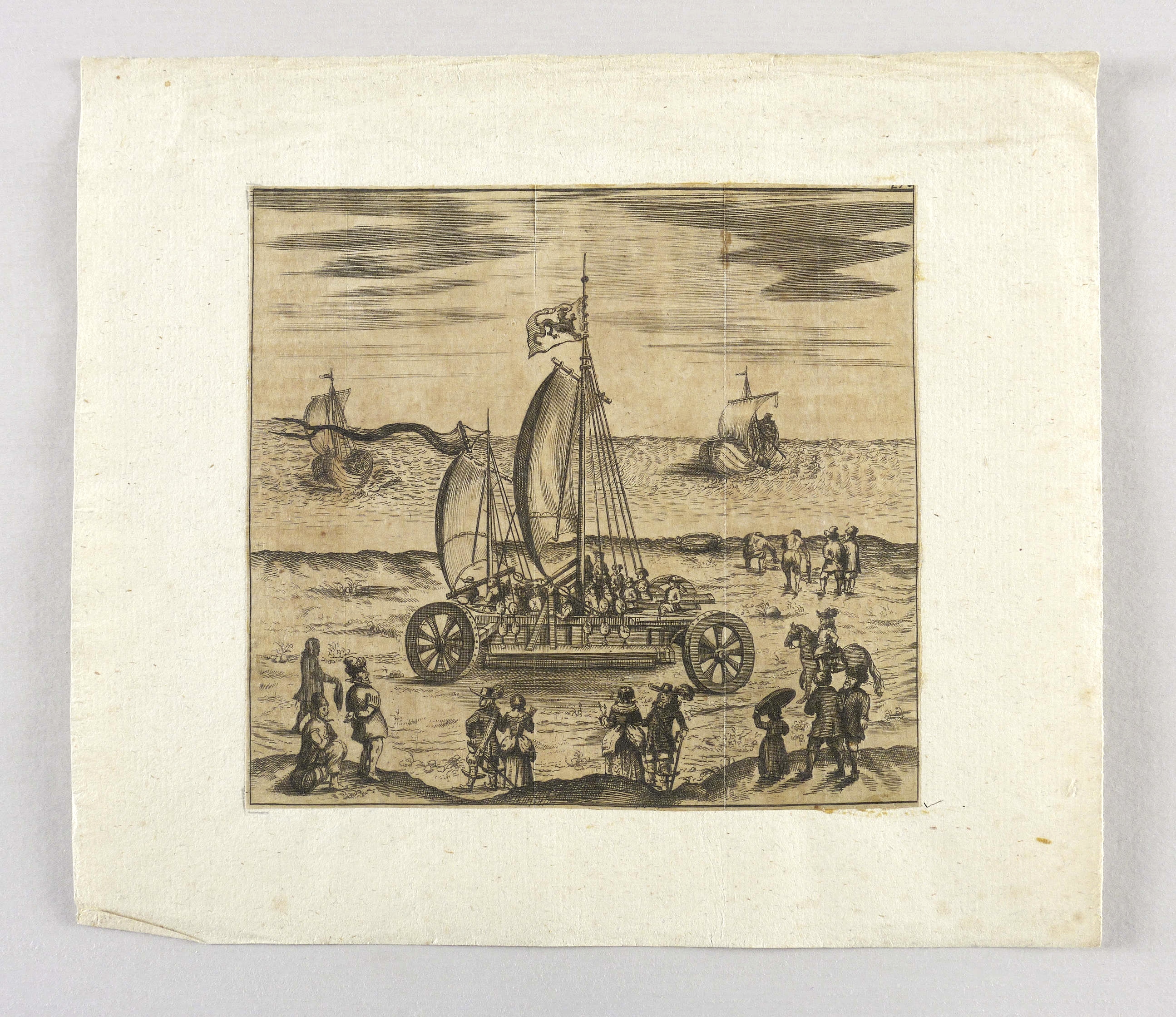Nicht näher bezeichnet. – Darstellung des um 1600 von Simon Stevin gebauten Segelwagens an der Küste von Scheveningen und Petten. – Blatt bis an den Darstellungsrand beschnitten und alt auf Bütten montiert. Sonst aber guter Zustand.