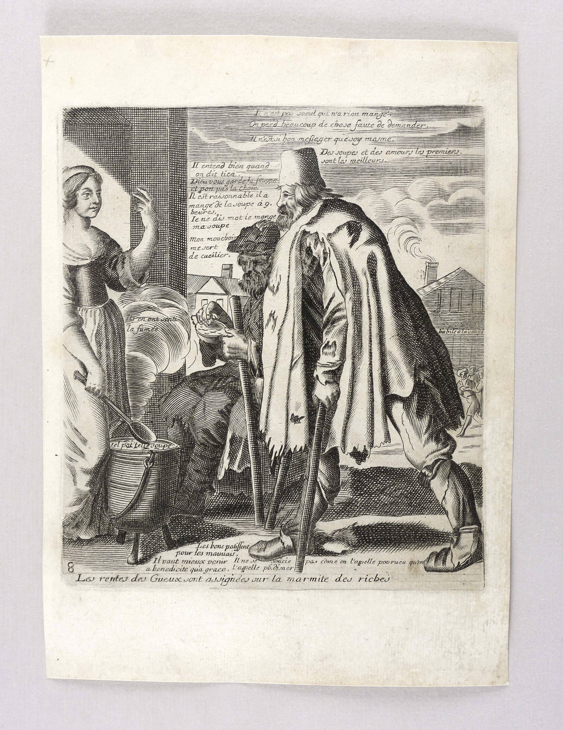 Aus: Jacques Lagniet, Recueil des plus illustres proverbes (Paris: Jacques Lagniet 1657-1663), Bd. 1-4[5]. – In der Platte unterhalb der Darstellung betitelt: ″Les rentes des Gueux sont assignées sur la marmite des riches″. Dazu nummeriert: ″8″. – Blatt verso mit geringen Montageresten und Sammlungsstempeln. Sonst aber guter Zustand.
