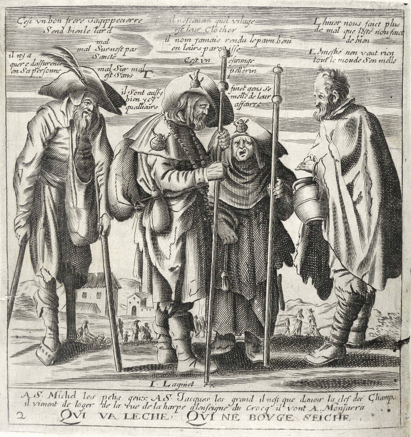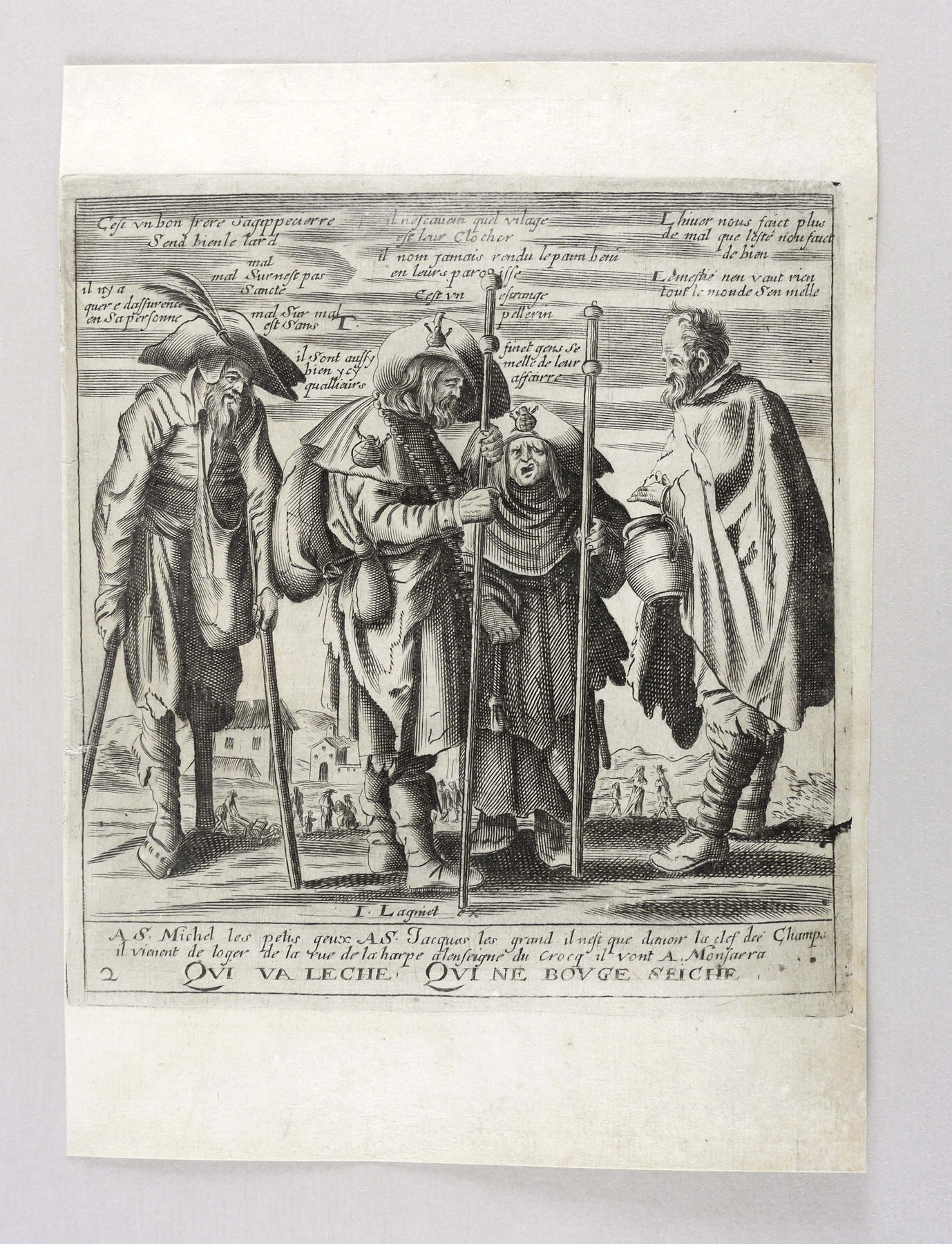 Aus: Jacques Lagniet, Recueil des plus illustres proverbes (Paris: Jacques Lagniet 1657-1663), Bd. 1-4[5]. – In der Platte unterhalb der Darstellung betitelt: ″Qui va leche, qui ne bouge seiche″. Dazu nummeriert: ″2″. – Blatt verso mit geringen Montageresten. Sonst aber guter Zustand.
