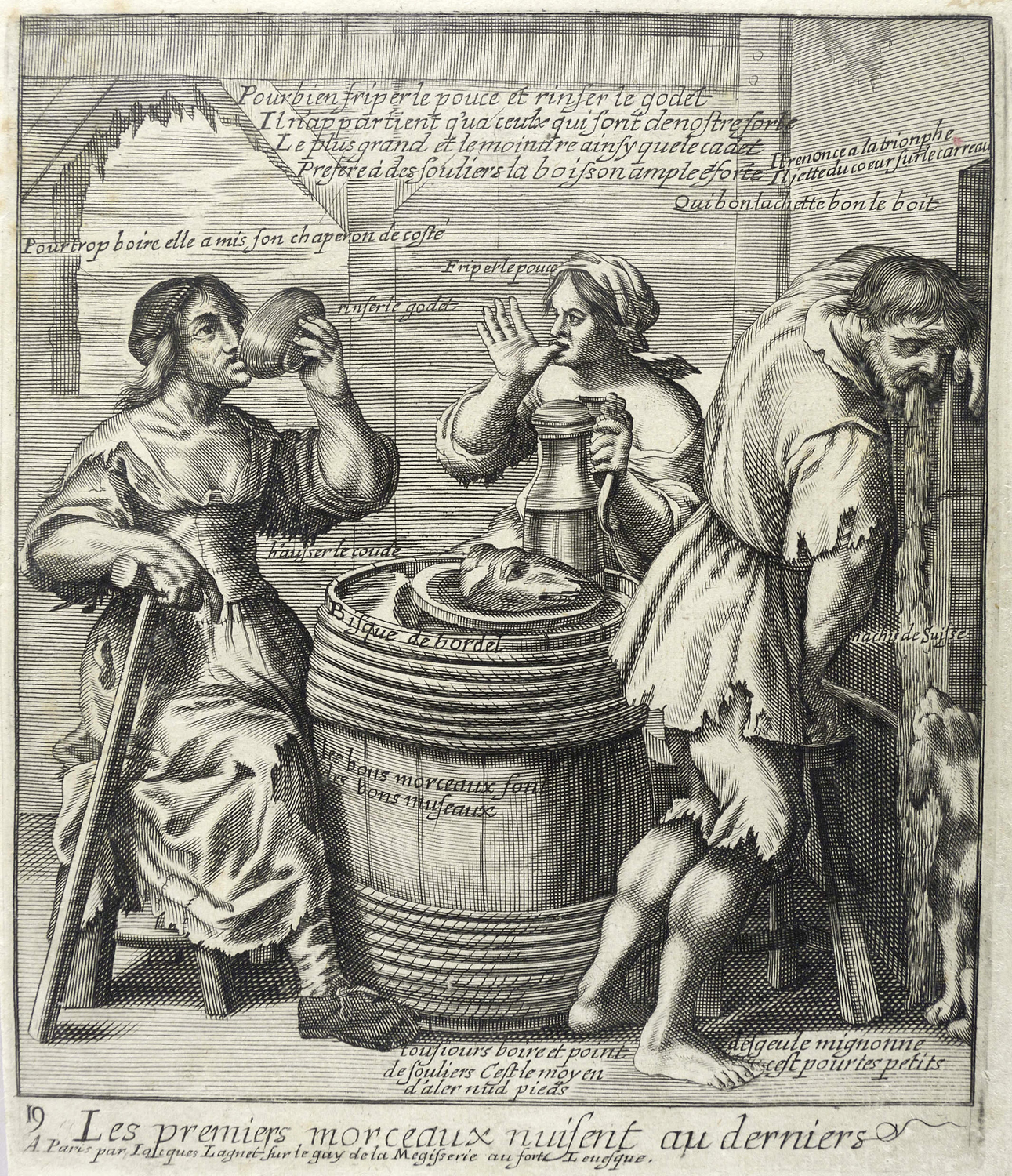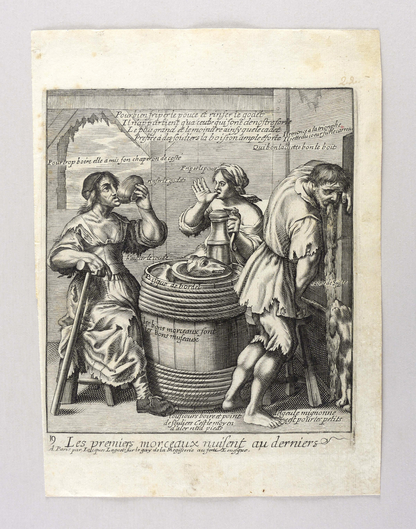 Aus: Jacques Lagniet, Recueil des plus illustres proverbes (Paris: Jacques Lagniet 1657-1663), Bd. 1-4[5]. – In der Platte unterhalb der Darstellung betitelt: ″Les premiers morceaux nuisent au derniers″. Dazu nummeriert: ″19″. – Blatt verso mit geringen Montageresten und Sammlungsstempeln. Sonst aber guter Zustand.