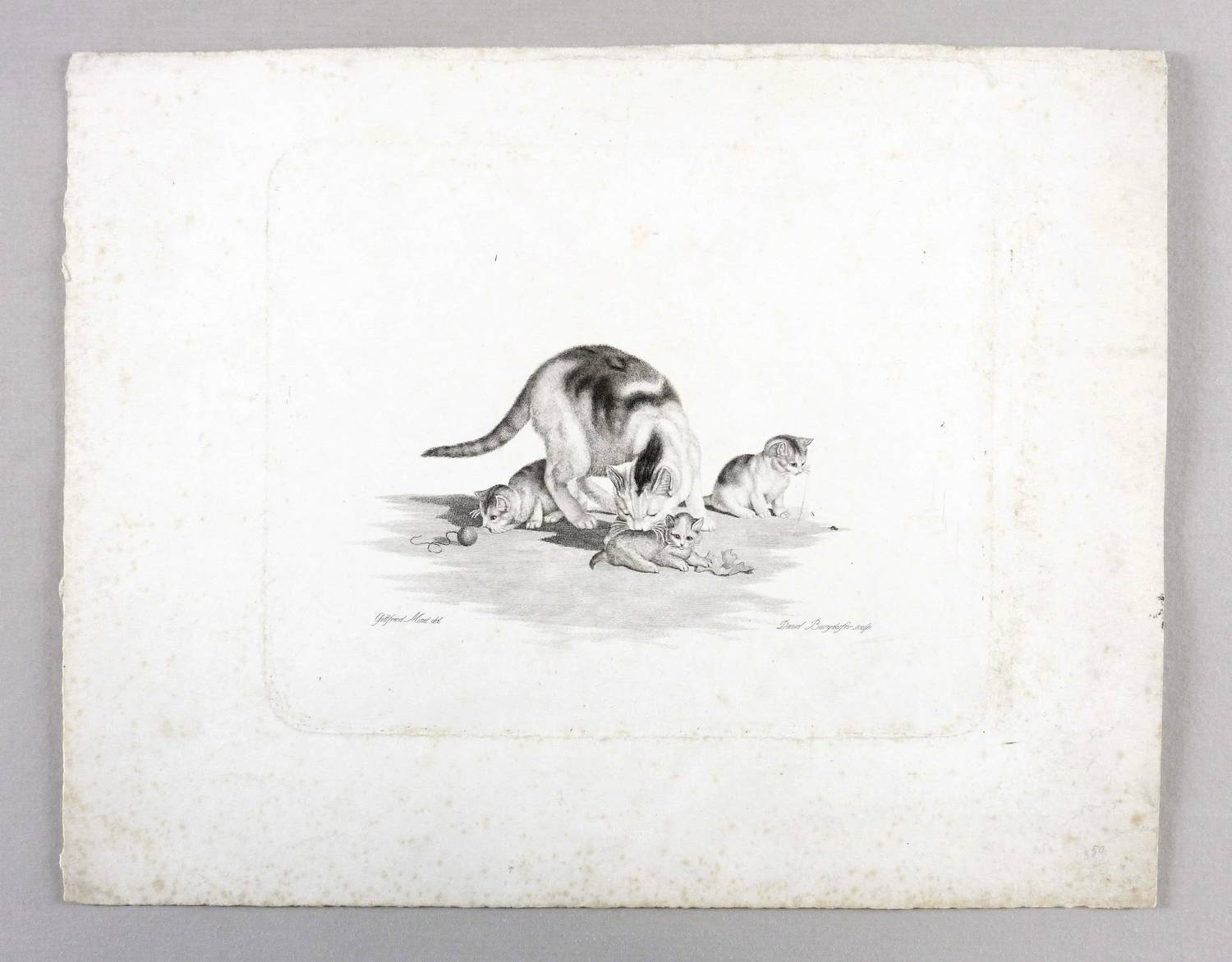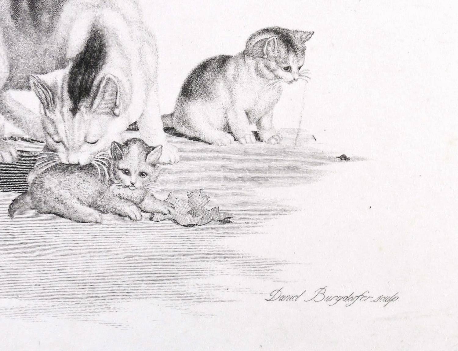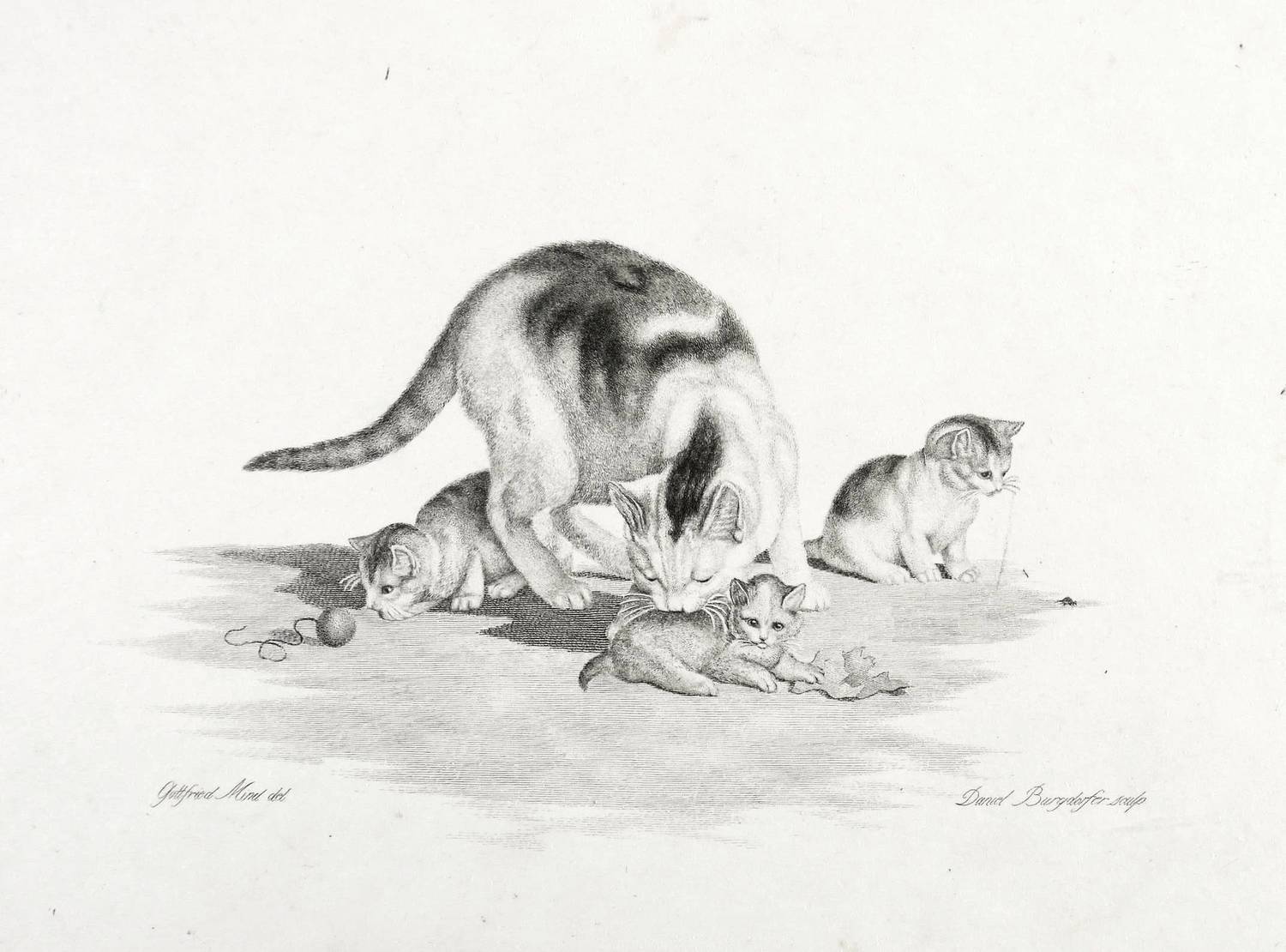 Aus: Six feuilles chats. &c de G. Mind, gravées par D. Bourgdorfer à Berne (Bern: J.J. Burgdorfer 1823). – Rechts unten signiert: ″Dan. Burgdorfer. sc.″ – Blatt im Randbereich teils stärker leicht stockfleckig. Untere linke Ecke angeknickt. Insgesamt noch guter Zustand.