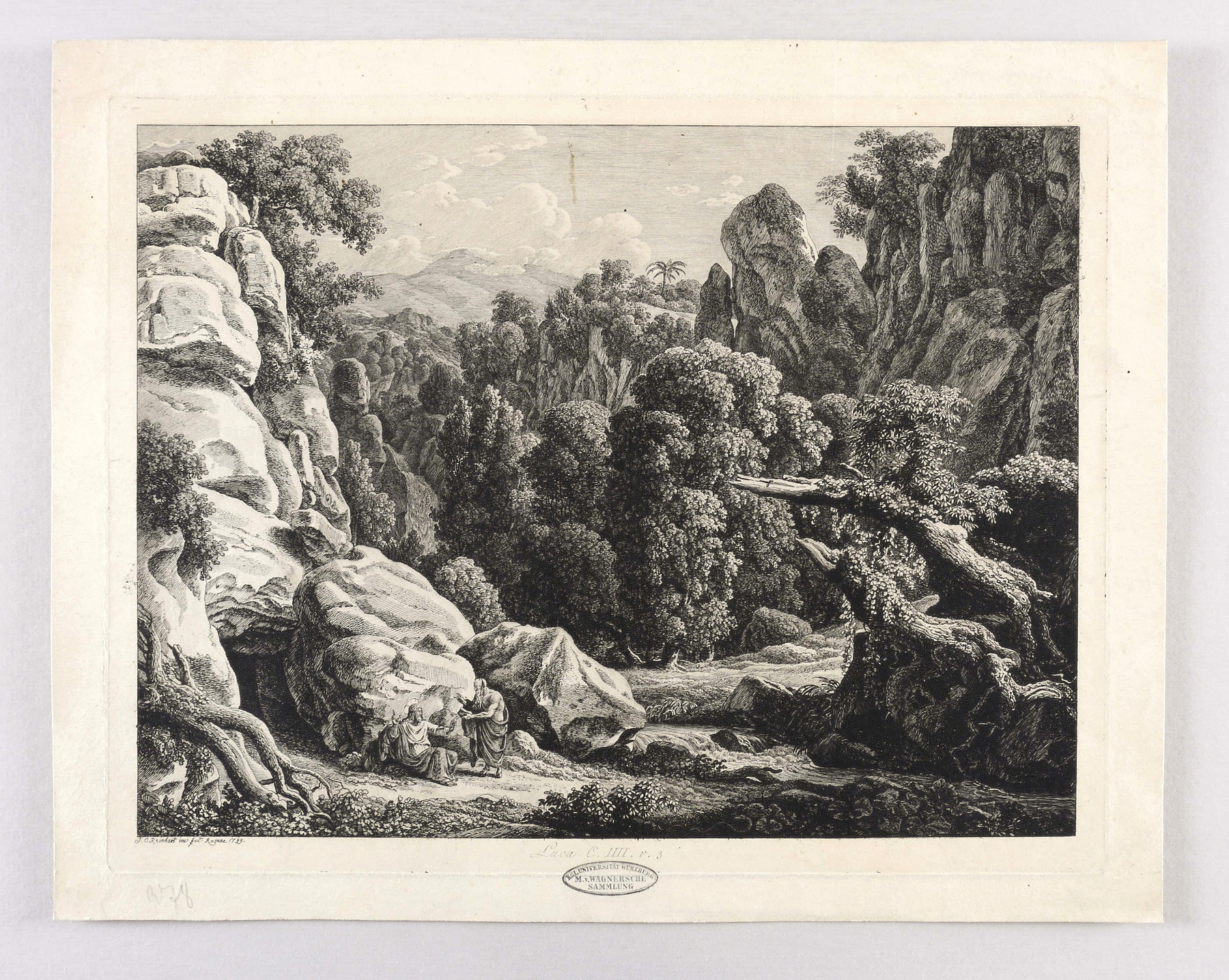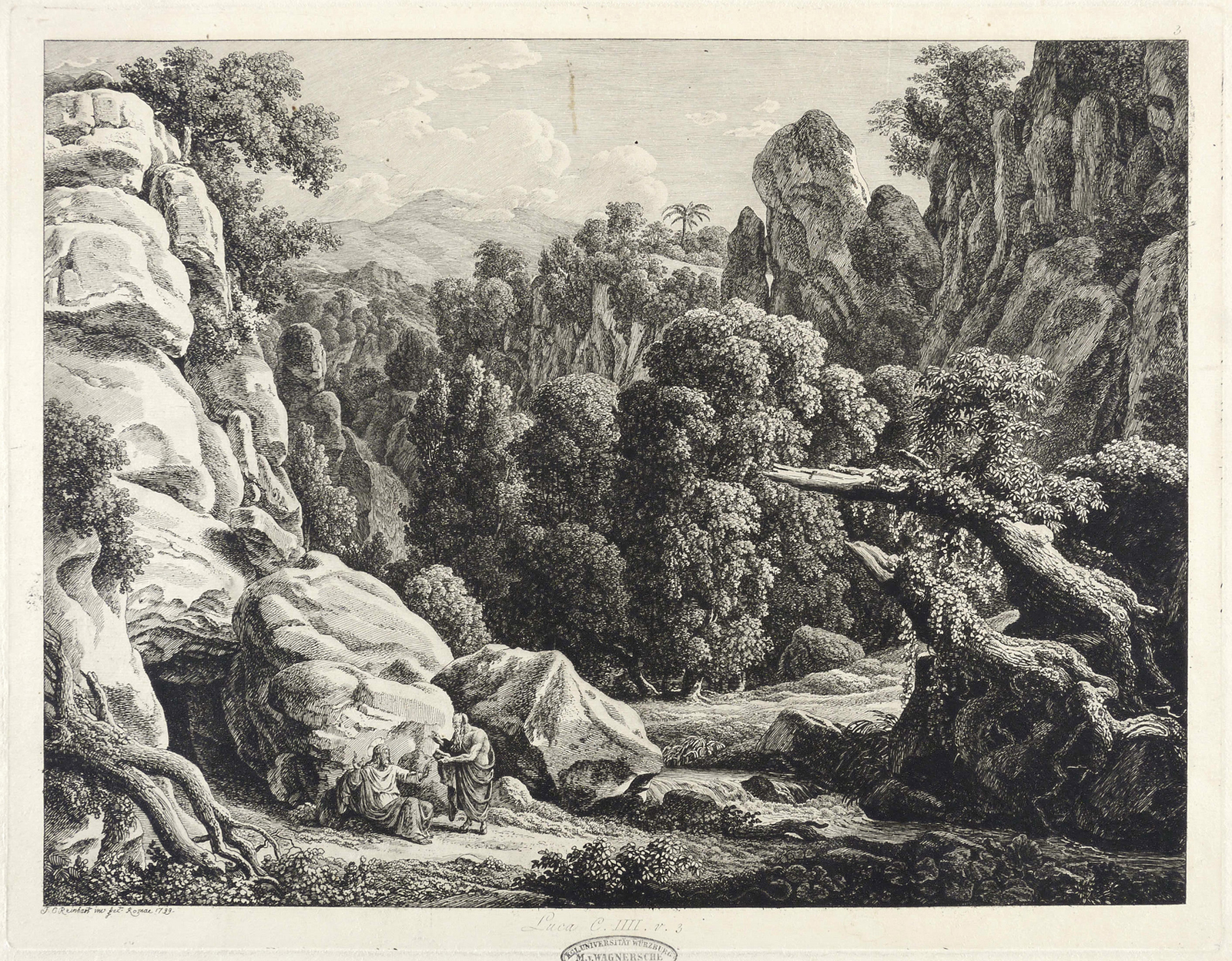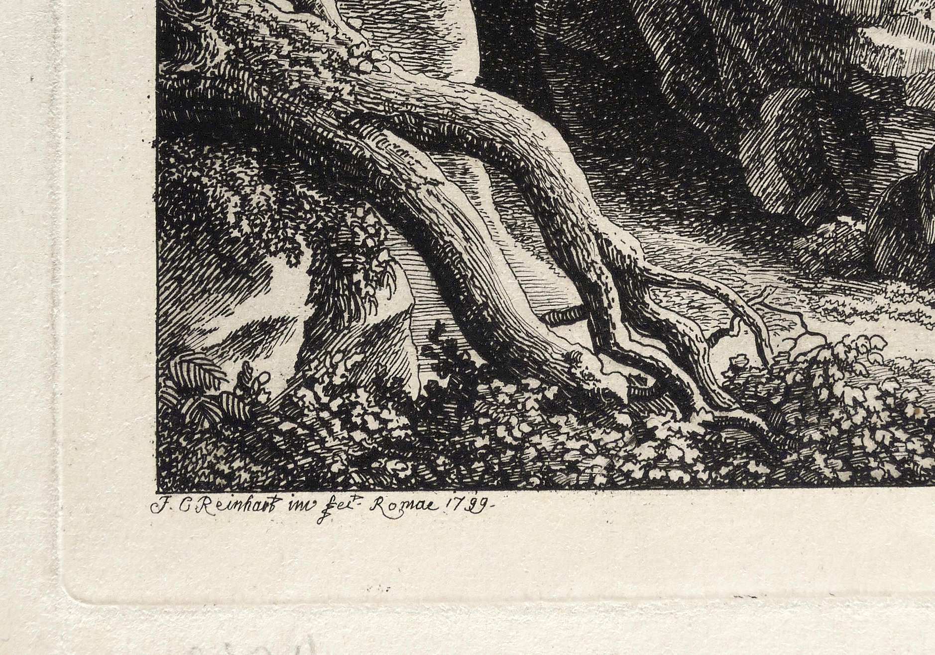 Andresen 78 II (von II). – Links unten signiert und datiert: ″J. C. Reinhart inv fec.t Romae 1799.″ Unterhalb der Darstellung bezeichnet: ″Luca C. IIII. v. 3″ und oben rechts nummeriert: ″3.″ Im unteren Rand mit dem Sammlungsstempel der Universität Würzburg der Sammlung Martin von Wagners. Verso Doublettenstempel des Wagner-Museums u.a. Sammlungsstempel. – Blatt 3 (von 6) der Folge ″Die Landschaften im heroischen Stil.″ von 1792-99. – Blatt mit leichten Lagerspuren und verso mit geringen Montageresten. Insgesamt aber guter Zustand.