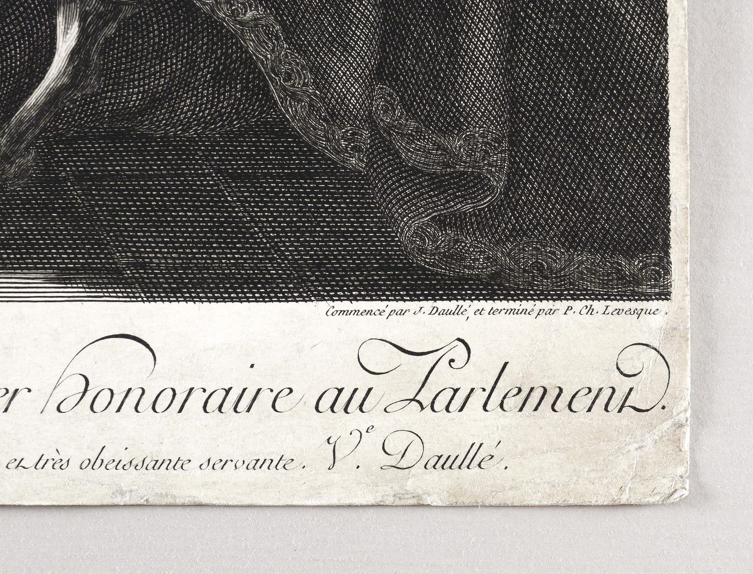 In der Platte rechts unten signiert: ″Commencé par J. Daullé, et terminé par P. Ch. Levesque.″ Unterhalb der Darstellung Titel, Dedikation und links Verlegeradresse. – Blatt bis auf den Plattenrand beschnitten und mit verschiedenen kleineren Einrissen im Randbereich. Eher mäßig guter Erhaltungszustand.