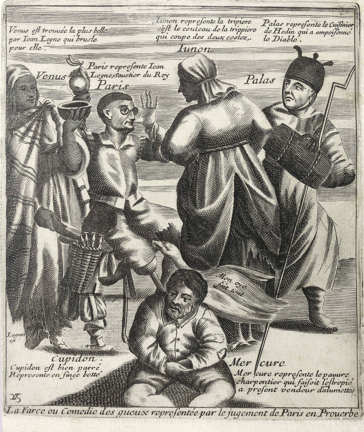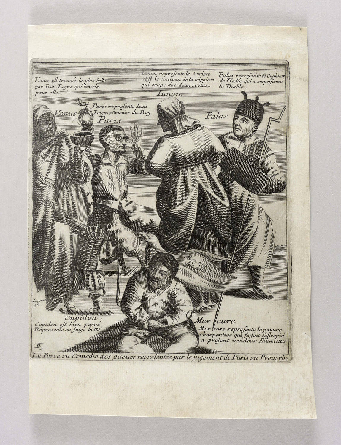 Aus: Jacques Lagniet, Recueil des plus illustres proverbes (Paris: Jacques Lagniet 1657-1663), Bd. 1-4[5]. – In der Platte unterhalb der Darstellung betitelt: ″La Farce ou Comédie des gueux représentée par le jugement de Paris en Proverbe″. Dazu nummeriert: 25″. – Blatt verso mit geringen Montageresten und einem Sammlungsstempel. Sonst aber guter Zustand.