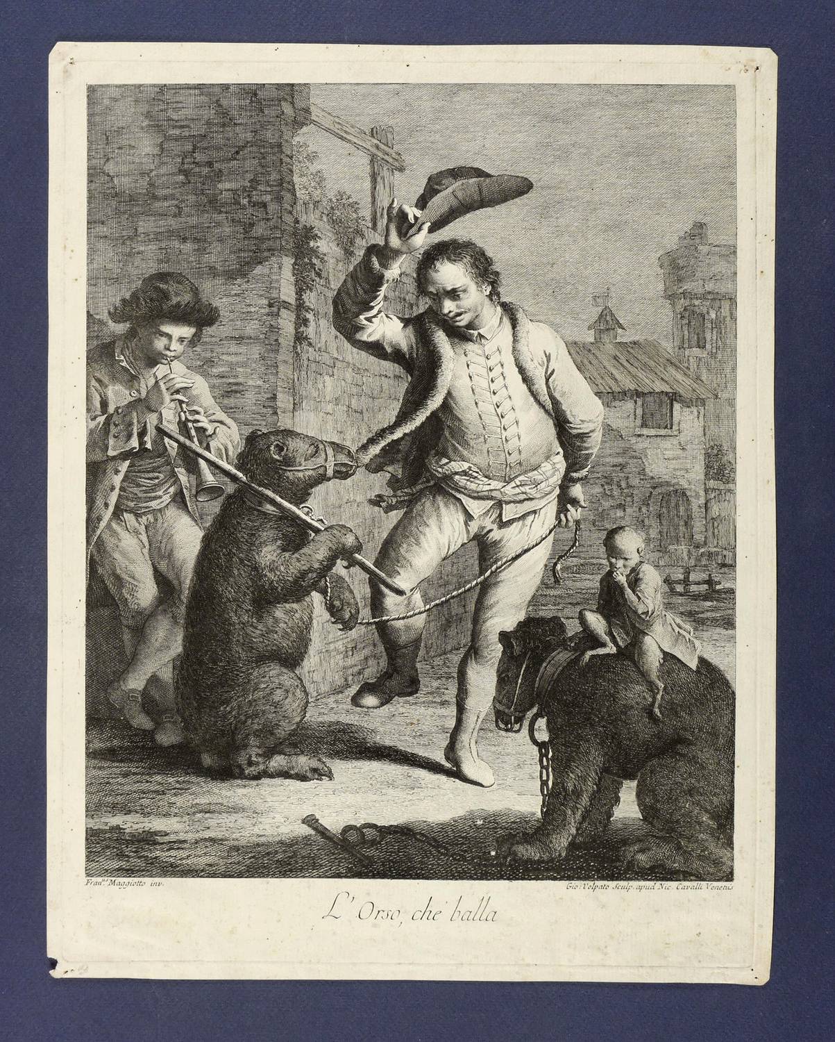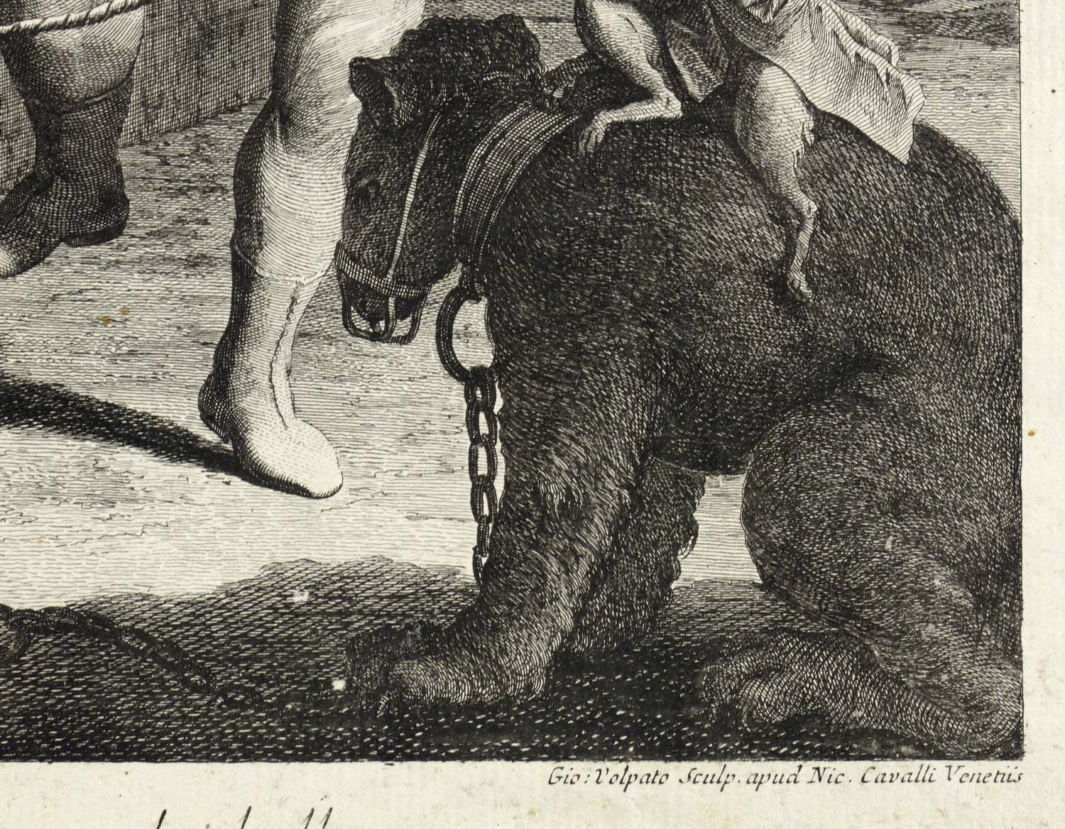 Marini 63. – In der Platte rechts unter der Darstellung signiert: ″Gio: Volpato Sculp. apud Nic. Cavalli Venetiis″. Links bezeichnet: ″Fran.us Maggiotto inv.″ Mittig darunter Titel: ″L'Orso, che balla″. – Blatt aus der 12-teiligen Folge ″Le arti per via″ des Künstlers mit Straßenszenen nach Francesco Maggiotto (Venedig: Nicolo Cavalli 1766). – Umlaufend schmaler Rand um die Platte. Das kräftige Büttenpapier mit geringen Alterungs- und Lagerspuren. In den Plattenecken unscheinbare Reißzwecklöchlein. Linke untere Blattecke mit kleiner Fehlstelle. Druckbild von kräftiger kontrastreicher Wirkung. Insgesamt guter bis sehr guter Erhaltungszustand.