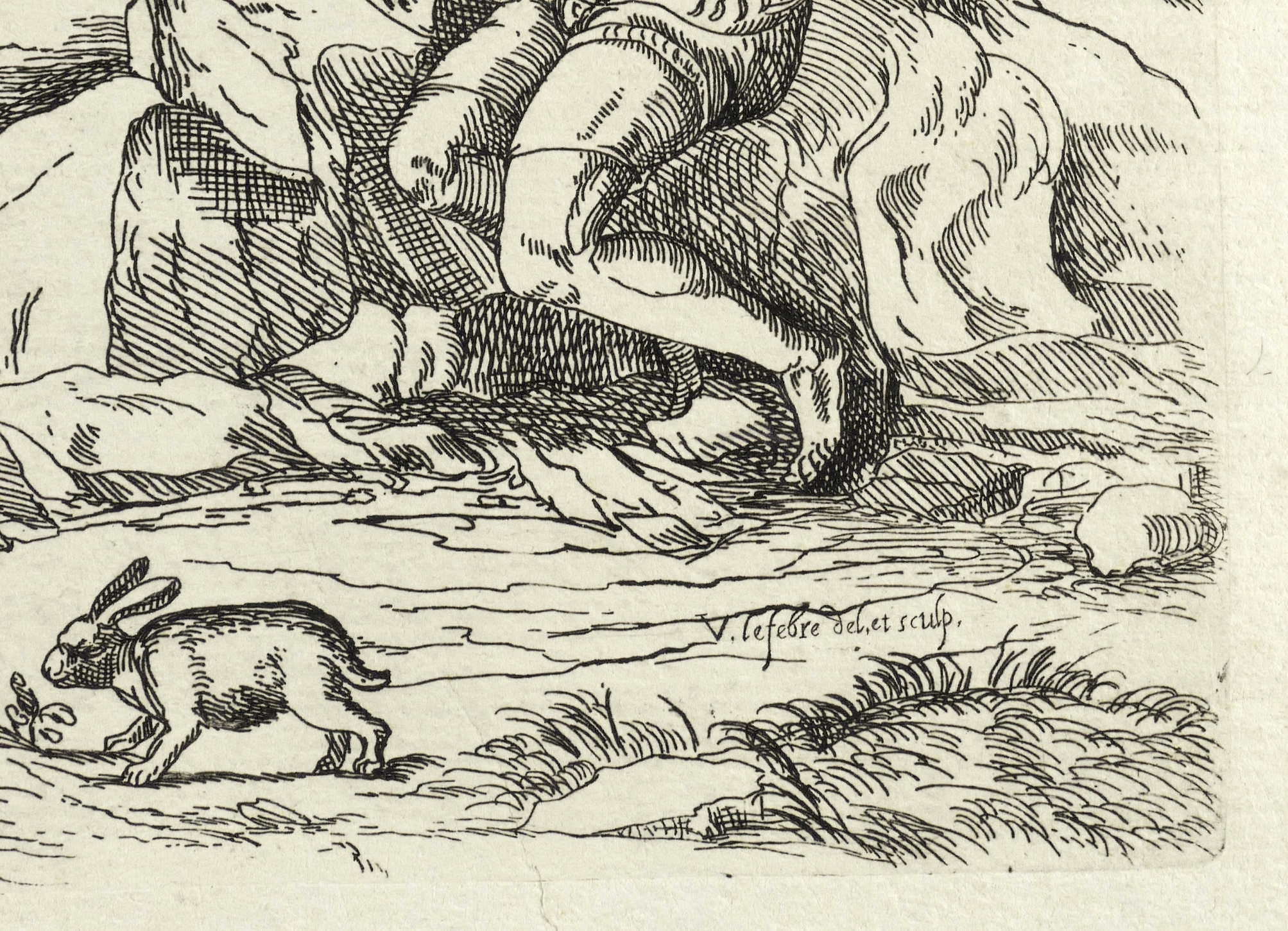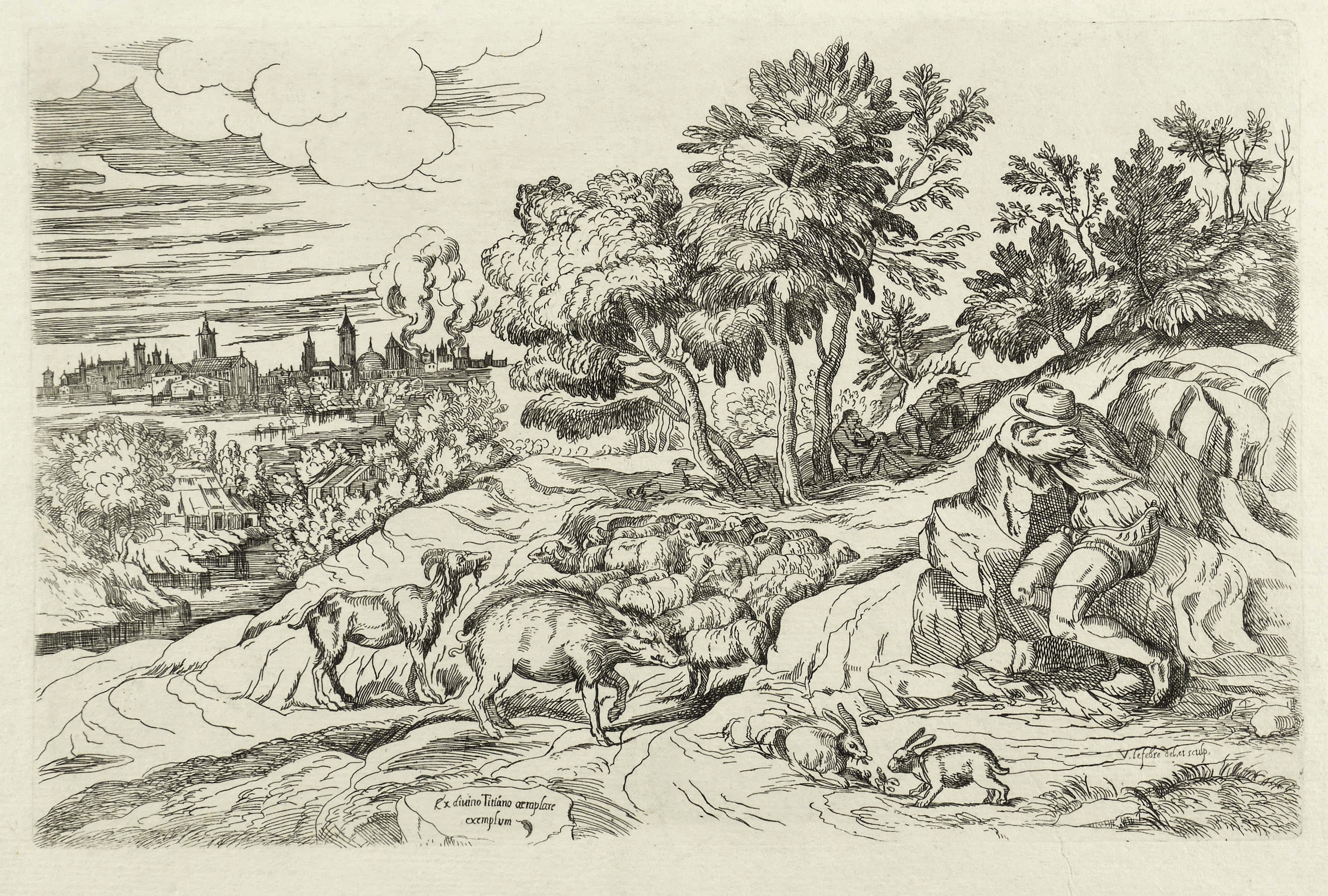 Villot 24. Hollstein 1-53. – Aus: Opera selectiora, quae Titianus Vecellius Cadubriensis et Paulus Calliari Veronensis inventarunt ac pinxerunt (Amsterdam: Jacob van Campen 1682). – In der Platte unter dem Hirten signiert ″V. lefebre del. et sculp.″ Links unten auf dem großen Stein bezeichnet: ″Ex diuino Titiano exemplare exemplum″. – Durchgehend schwache Altersspuren. Insgesamt sehr guter Erhaltungszustand.