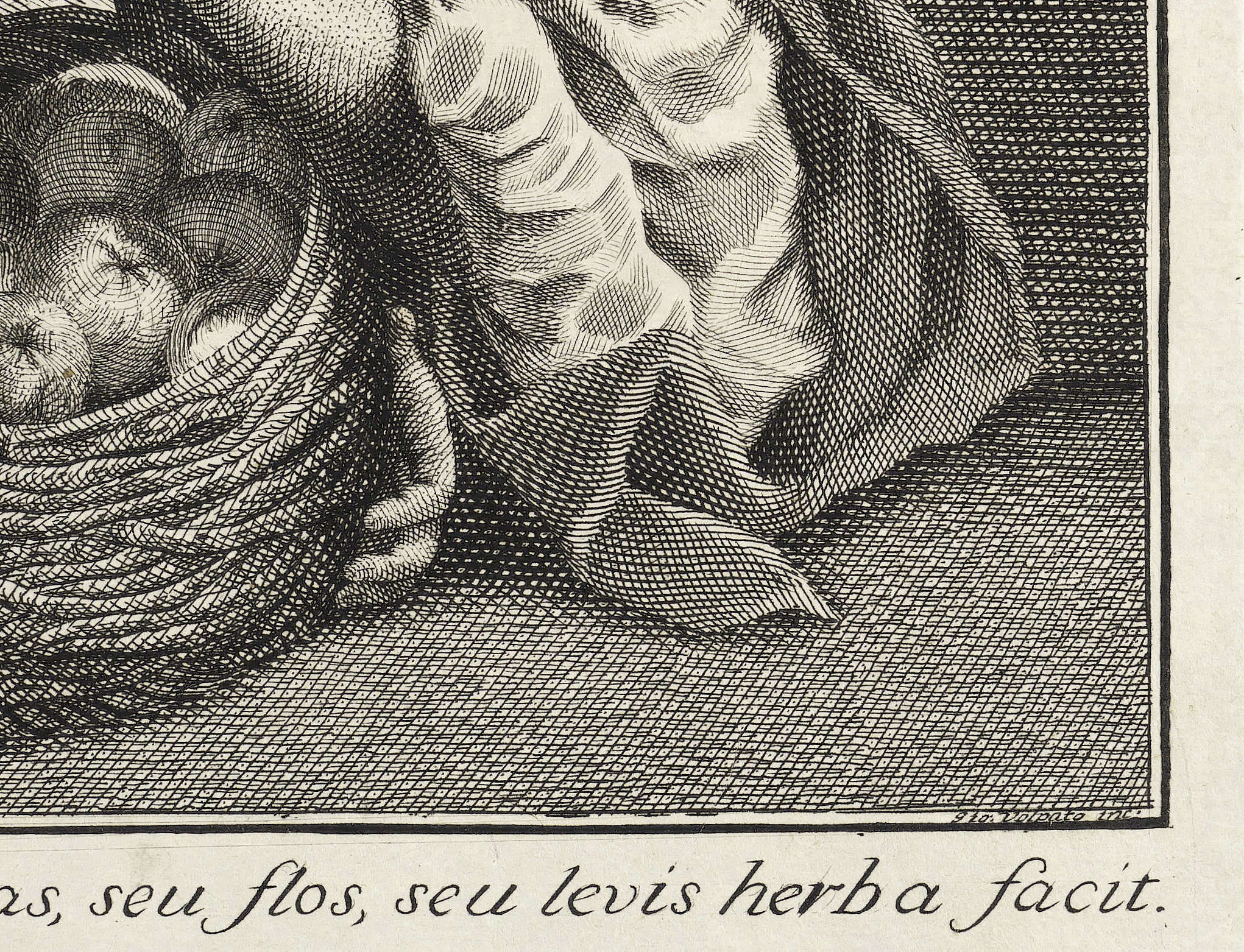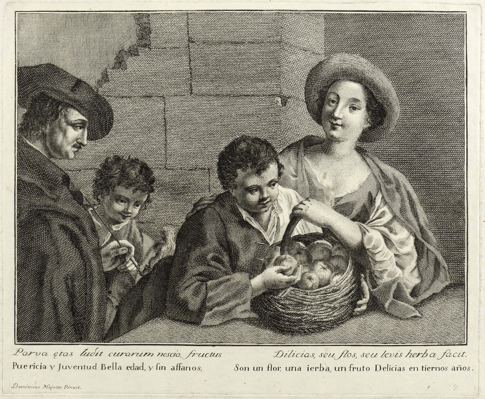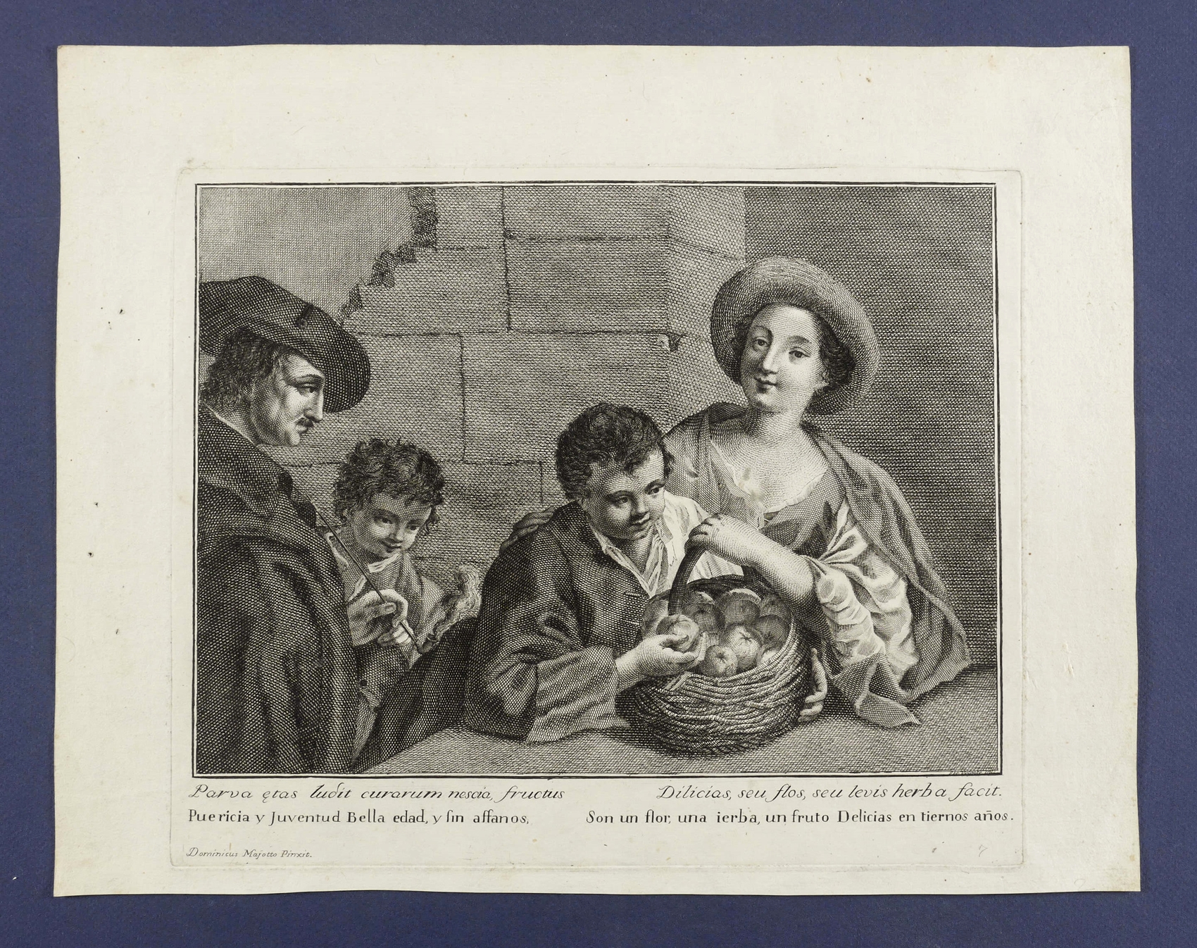 In der Platte rechts unten in der Umrandung der Darstellung signiert: ″Gio: Volpato inc.″. Links unten bezeichnet: ″Dominicus Majotto Pinxit.″ Darüber in zwei Spalten lateinisch-spanische Inschrift: ″Parva etas ludit curarum nescia, fructus / Dilicias, seu flos, seu levis herba facit. // Puericia y Juventud Bella edad, y fin affanos. / Son un flor, una ierba, un fruto Delicias en tiernos anos.″ – Frühe, erste bekannte druckgrafische Arbeit des Künstlers. Blatt aus der Folge der ″Capricci fiamminghi″ mit Genreszenen nach Domenico Fedeli il Maggiotto (Bassano: Calcografia Giovanni Battista Remondini 1760). – Geringfügige Altersspuren. Insgesamt sehr guter Zustand.