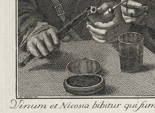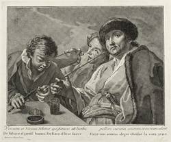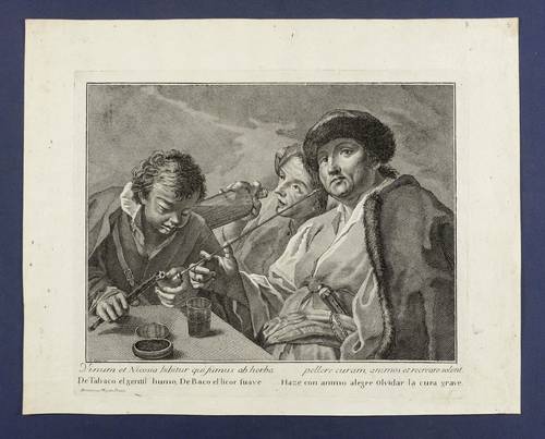 In der Platte links unten in der Umrandung der Darstellung signiert: ″Gio: Volpato inc.″. Links unten bezeichnet: ″Dominicus Majotto Pinxit.″ Darüber in zwei Spalten lateinisch-spanische Inschrift: ″Vinum et Nicosia bibitur qui fumus ab herba / pellere curam, animos et recreare solent. // De Tabaco el gentil humo, De Baco el licor suave / Haze con animo alegre olvidar la cura grave.″ – Frühe, erste bekannte druckgrafische Arbeit des Künstlers. Blatt aus der Folge der ″Capricci fiamminghi″ mit Genreszenen nach Domenico Fedeli il Maggiotto (Bassano: Calcografia Giovanni Battista Remondini 1760). – Geringfügige Altersspuren. Insgesamt sehr guter Zustand.