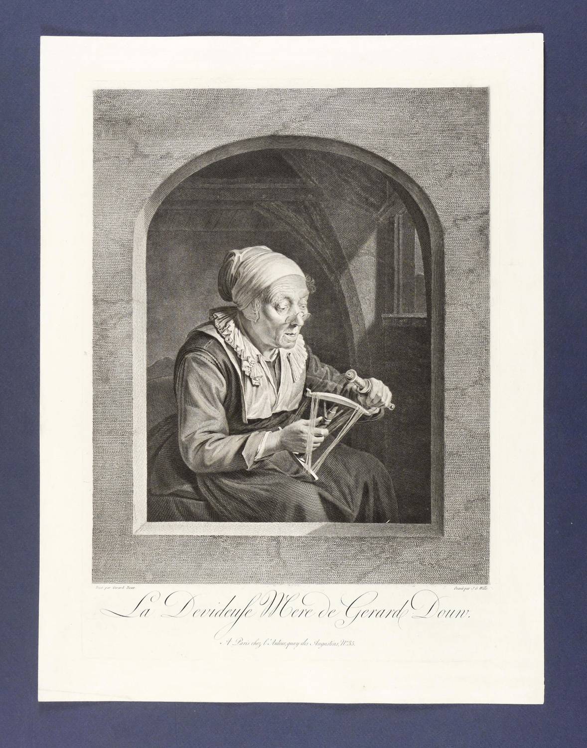 In der Platte rechts unten signiert: ″Grave par J.G. Wille″. Unten mittig Titel und Verlegeradresse von Wille. – Schöne sbreitrandiges Exemplar. Unscheinbares Eselsohr in der äußersten Blattecke links unten. Sehr guter Erhaltungszustand.