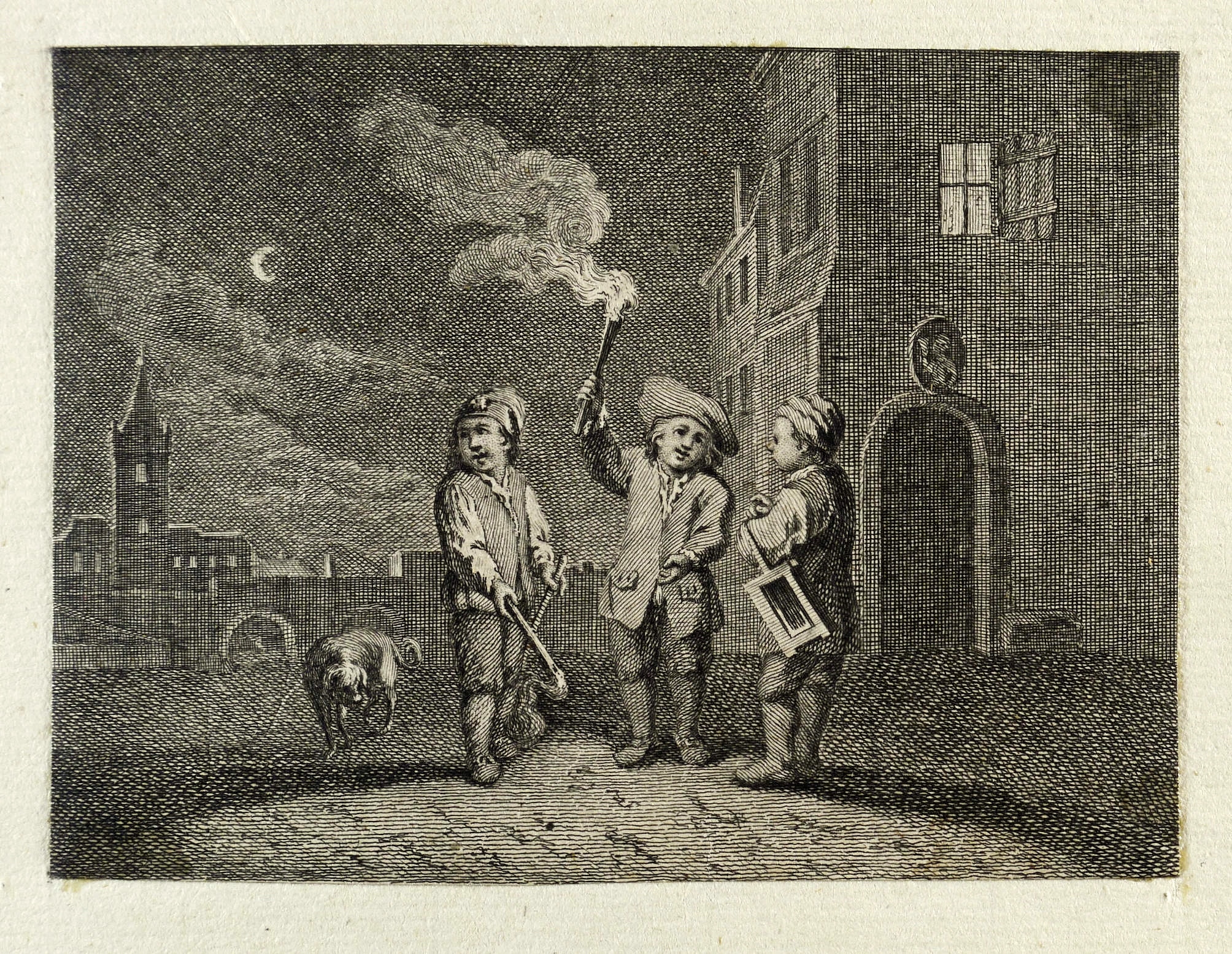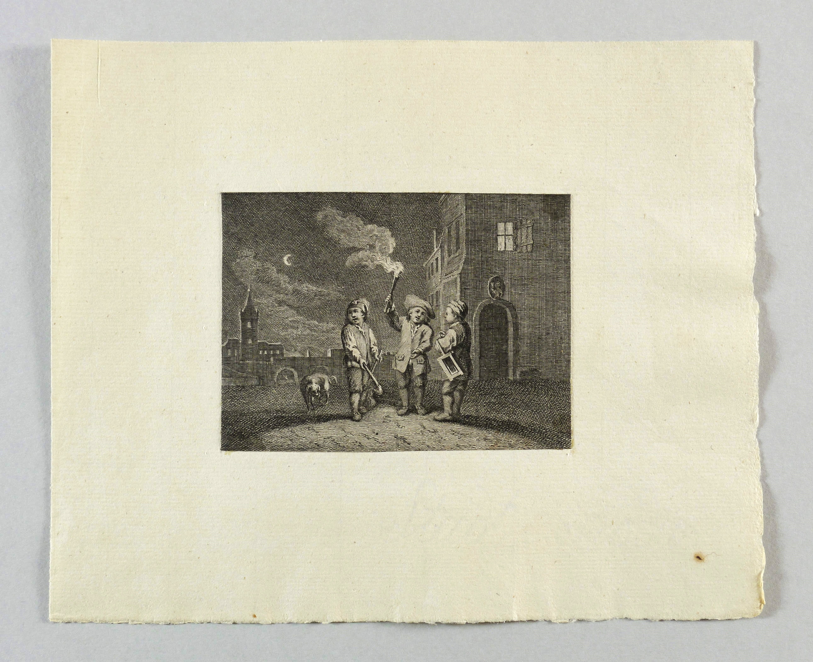 Deutscher Radierer. – „Drei Männer mit Fackeln und Laterne”.