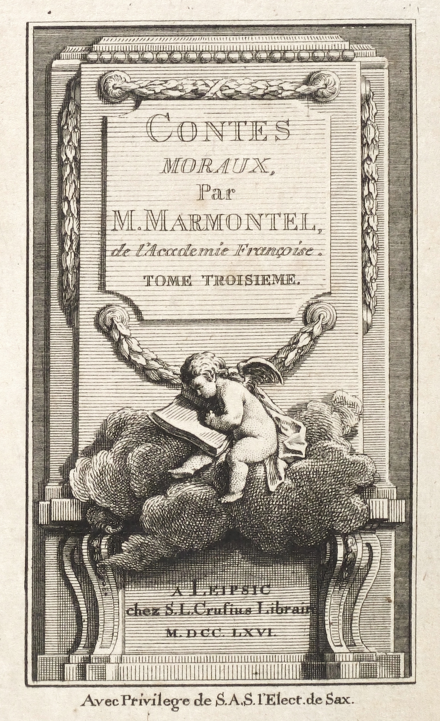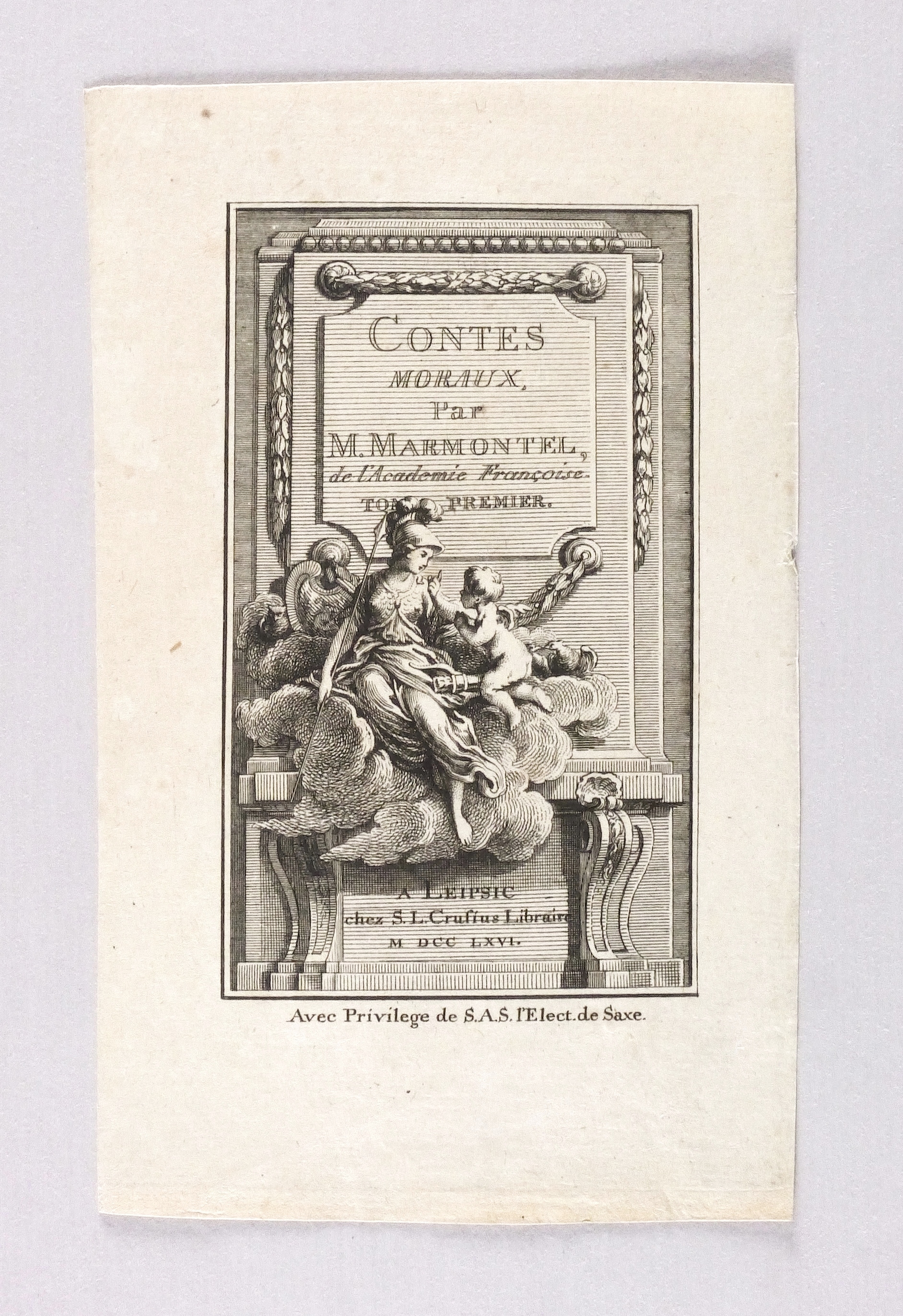 Aus: Jean-François Marmontel, Contes Moraux (Siegfried Leberecht Crusius 1766). – Illustrationen jeweils rechts unten signiert. Teils unterhalb der Darstellung betitelt. – Drei Kupfertitel und 19 Illustrationen. Spiegelverkehrte Wiedergaben nach Gravelot. – Blätter vereinzelt schwach fleckig und angeschmutzt. Sonst guter Zustand.