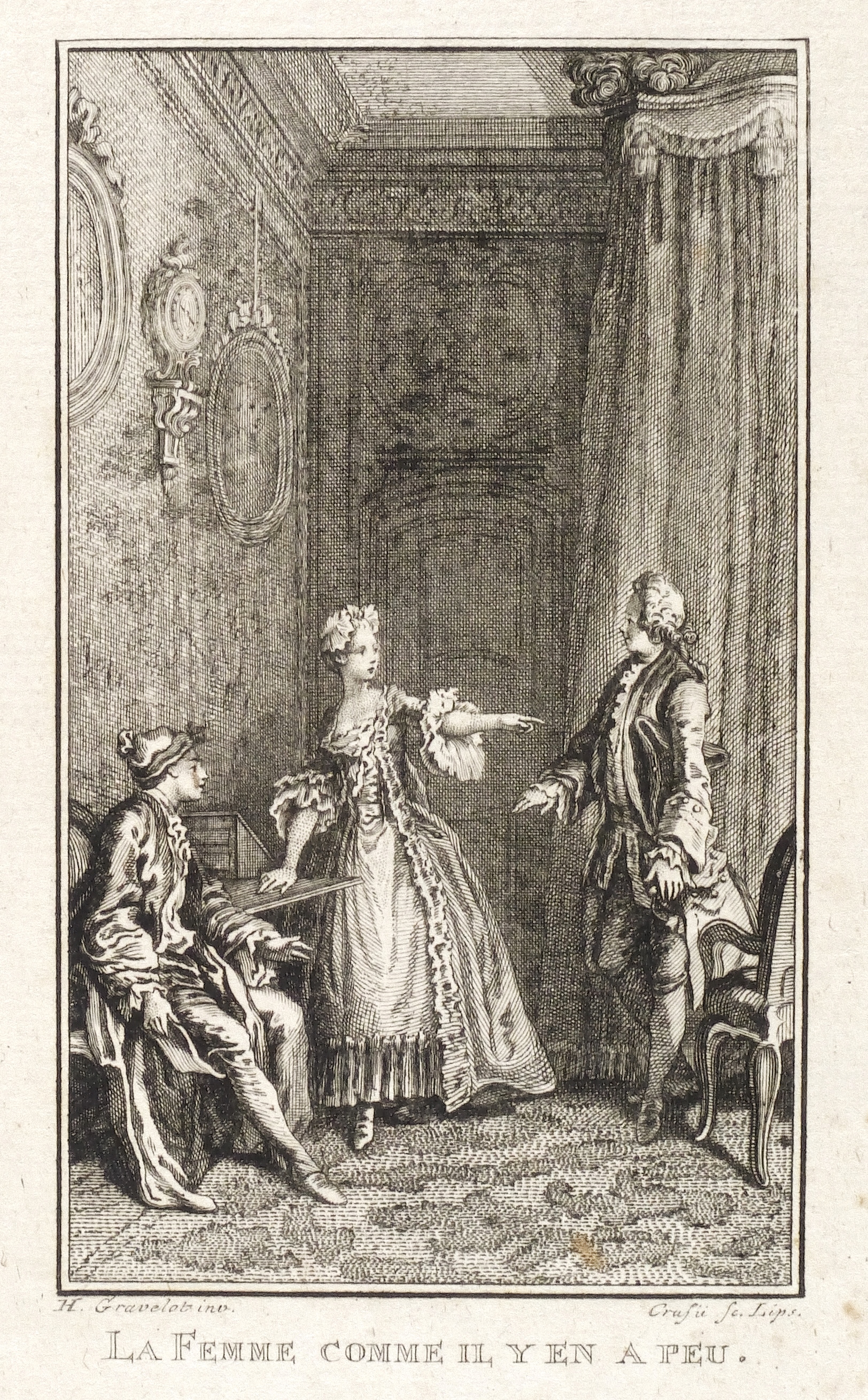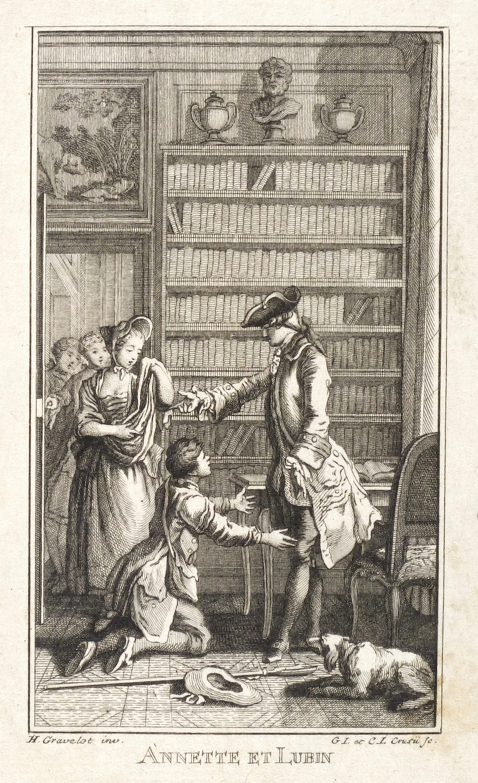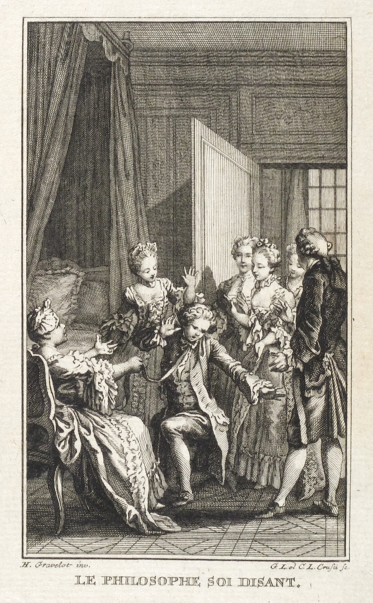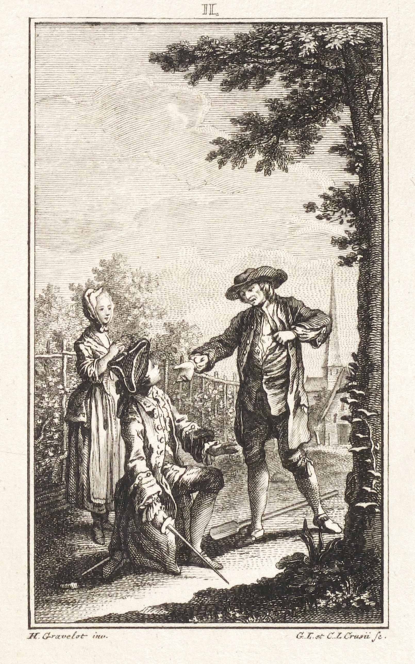 Hubert-François Gravelot (1699 Paris - 1773 Paris). Französischer Maler, Zeichner und Kupferstecher. Gravelot ist einer der bedeutensten Buchillustratoren des französischen Rokoko. Sein Bruder ist der Kartograf Jean-Baptiste Bourguignon d’Anville. Gravelot erhielt eine Ausbildung am Collège des Quatre Nations. Dann war zunächst auf Betreiben des Vaters mehrere Jahre als Kartenzeichner tätig. Ab 1729 lernte er zunächst bei Jean Restout, darauf bei François Boucher. 1732 siedelt Gravelot nach England über und arbeitete dort für den Verleger Claude Dubosc. Er profilierte sich als Illustrator, beschäftigte sich aber auch mit Malerei. So unterrichtete er zeitweise als Professor an der St. Martin’s Lane Academy. 1746 kehrte Gravelot nach Frankreich zurück. Er illustrierte unter anderem Werke von Rousseau, Corneille, Voltaire, Marmontel, Racine und Tasso.