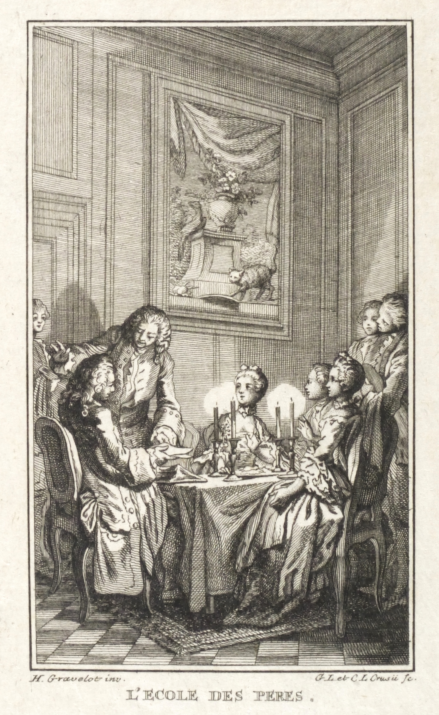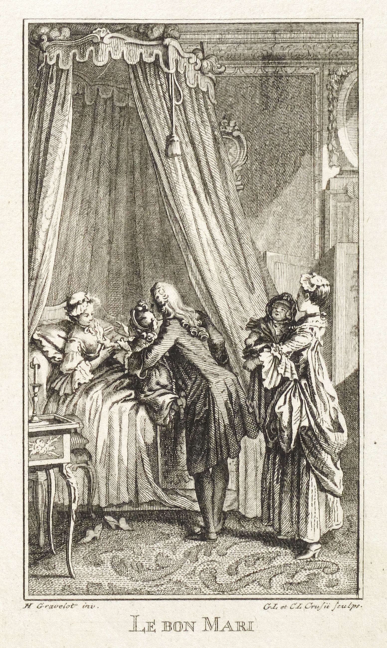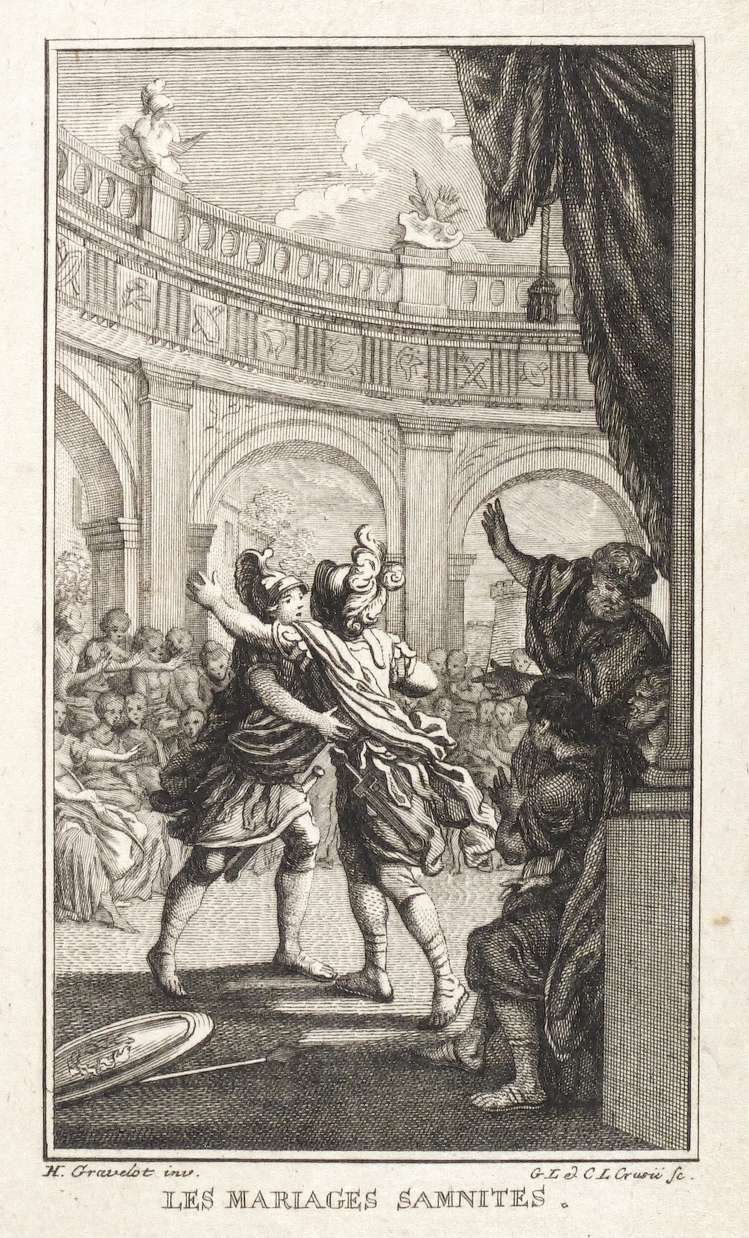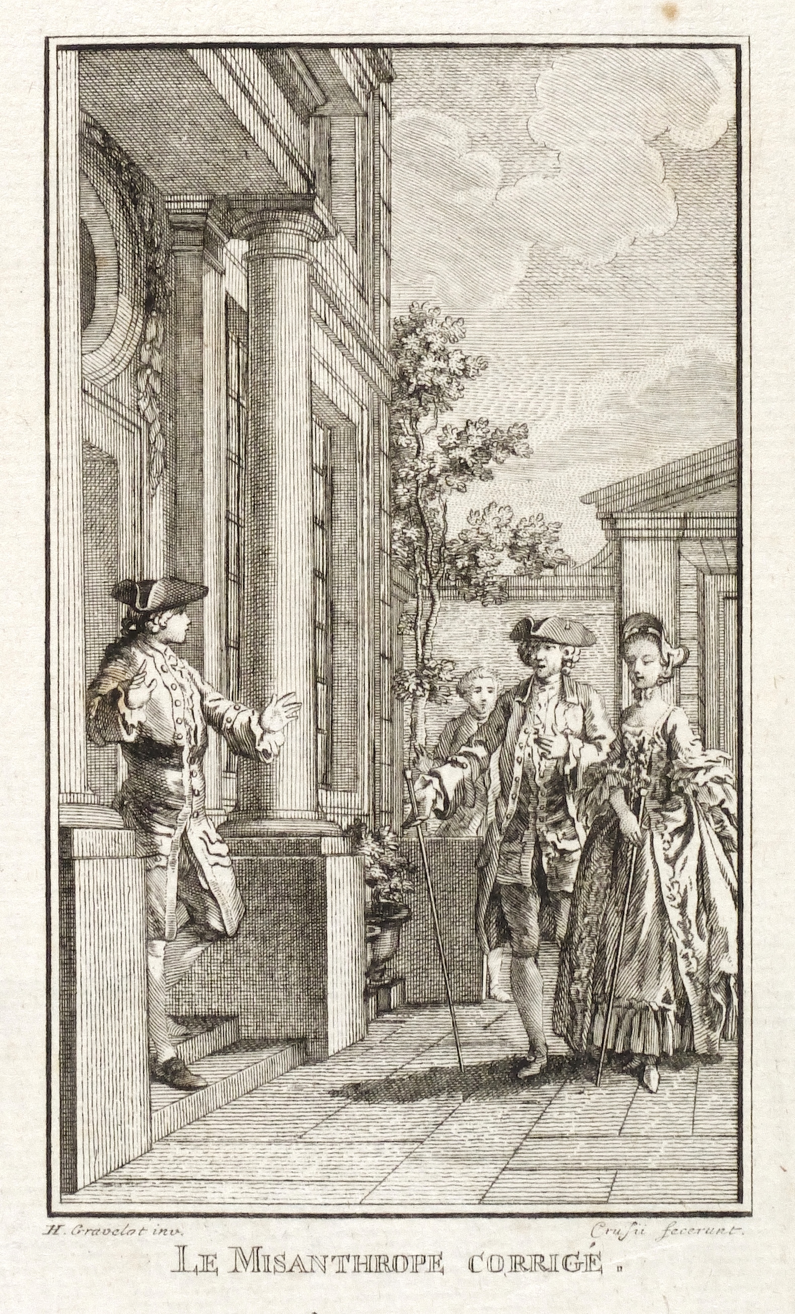 Hubert-François Gravelot (1699 Paris - 1773 Paris). Französischer Maler, Zeichner und Kupferstecher. Gravelot ist einer der bedeutensten Buchillustratoren des französischen Rokoko. Sein Bruder ist der Kartograf Jean-Baptiste Bourguignon d’Anville. Gravelot erhielt eine Ausbildung am Collège des Quatre Nations. Dann war zunächst auf Betreiben des Vaters mehrere Jahre als Kartenzeichner tätig. Ab 1729 lernte er zunächst bei Jean Restout, darauf bei François Boucher. 1732 siedelt Gravelot nach England über und arbeitete dort für den Verleger Claude Dubosc. Er profilierte sich als Illustrator, beschäftigte sich aber auch mit Malerei. So unterrichtete er zeitweise als Professor an der St. Martin’s Lane Academy. 1746 kehrte Gravelot nach Frankreich zurück. Er illustrierte unter anderem Werke von Rousseau, Corneille, Voltaire, Marmontel, Racine und Tasso.