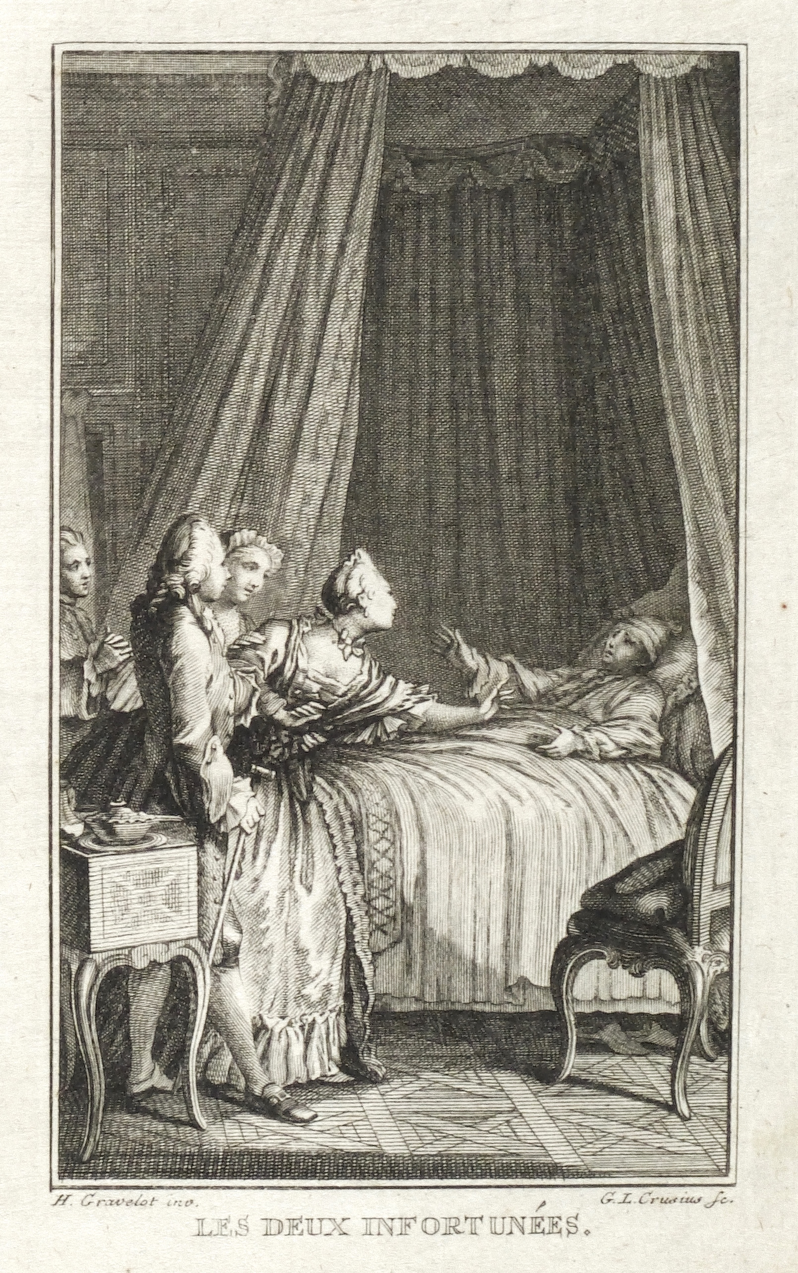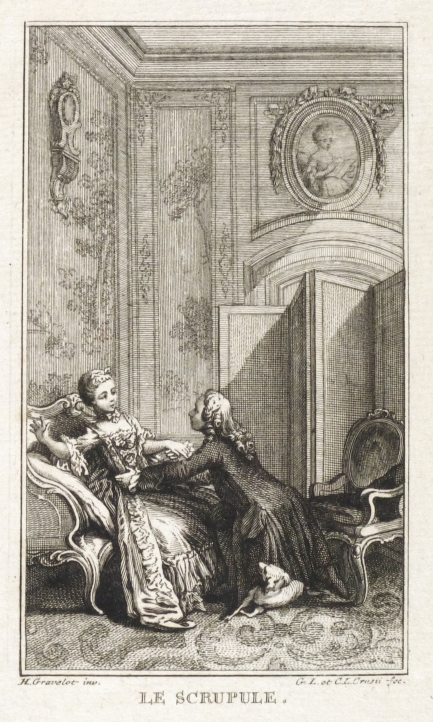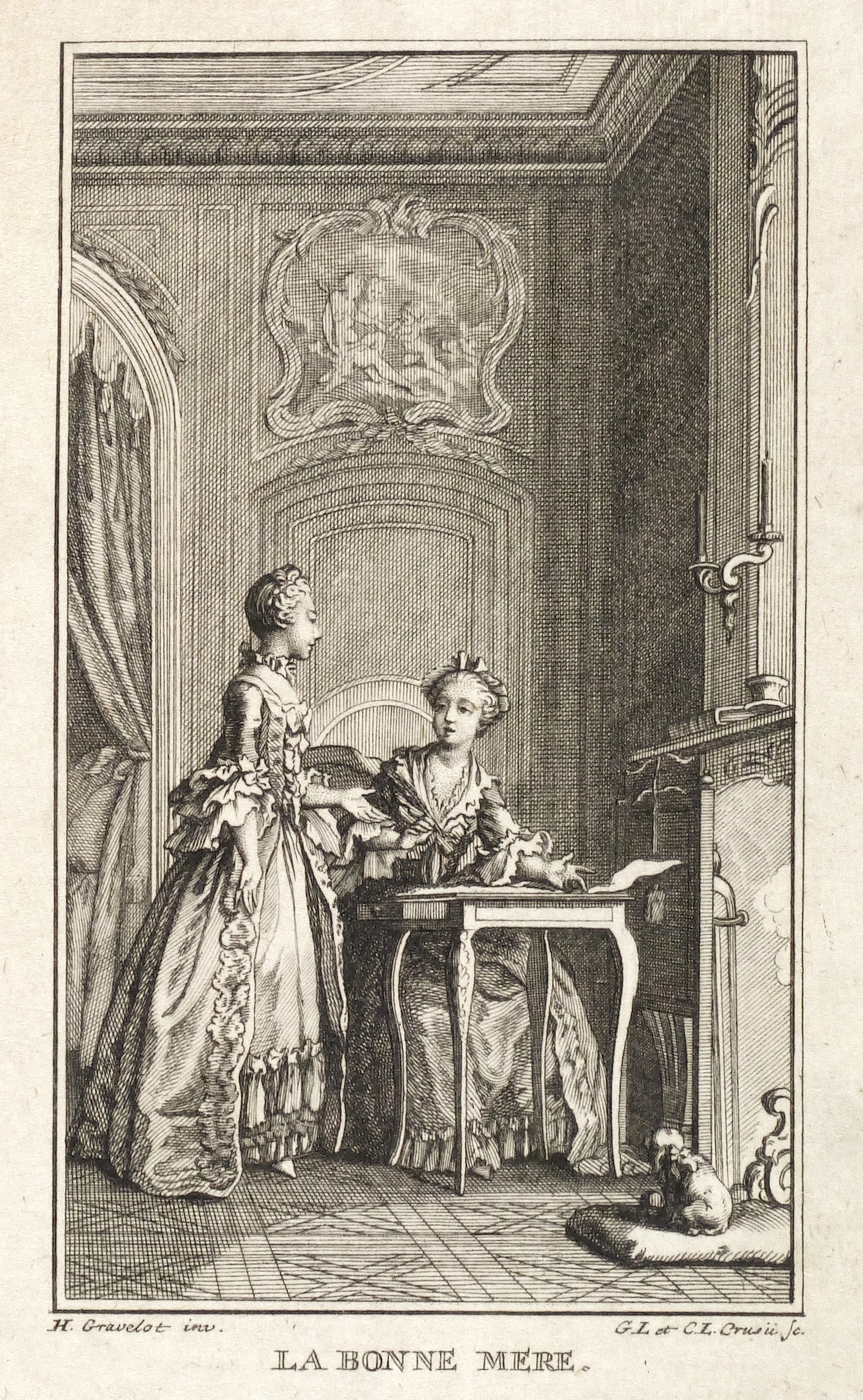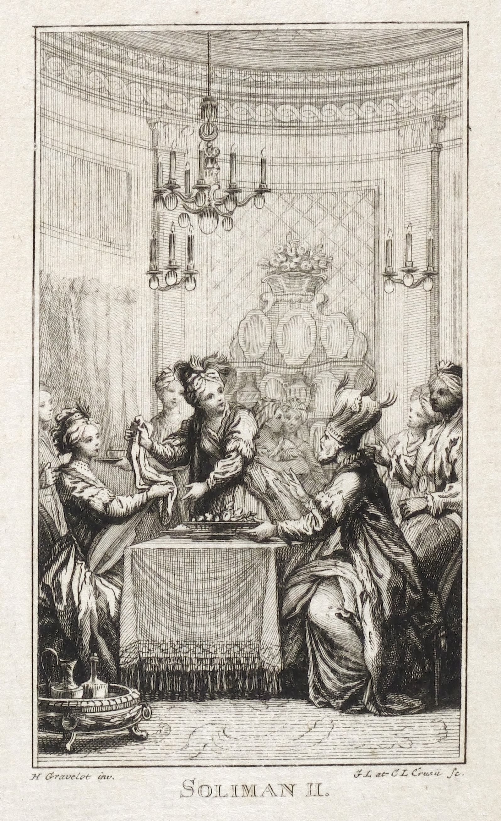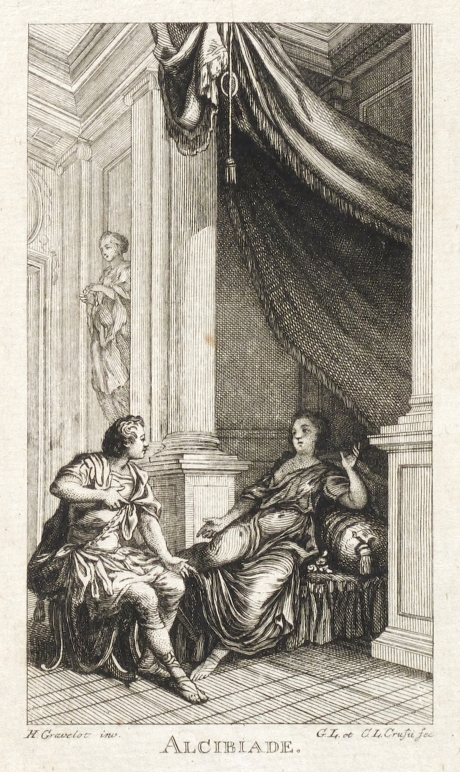 Hubert-François Gravelot (1699 Paris - 1773 Paris). Französischer Maler, Zeichner und Kupferstecher. Gravelot ist einer der bedeutensten Buchillustratoren des französischen Rokoko. Sein Bruder ist der Kartograf Jean-Baptiste Bourguignon d’Anville. Gravelot erhielt eine Ausbildung am Collège des Quatre Nations. Dann war zunächst auf Betreiben des Vaters mehrere Jahre als Kartenzeichner tätig. Ab 1729 lernte er zunächst bei Jean Restout, darauf bei François Boucher. 1732 siedelt Gravelot nach England über und arbeitete dort für den Verleger Claude Dubosc. Er profilierte sich als Illustrator, beschäftigte sich aber auch mit Malerei. So unterrichtete er zeitweise als Professor an der St. Martin’s Lane Academy. 1746 kehrte Gravelot nach Frankreich zurück. Er illustrierte unter anderem Werke von Rousseau, Corneille, Voltaire, Marmontel, Racine und Tasso.